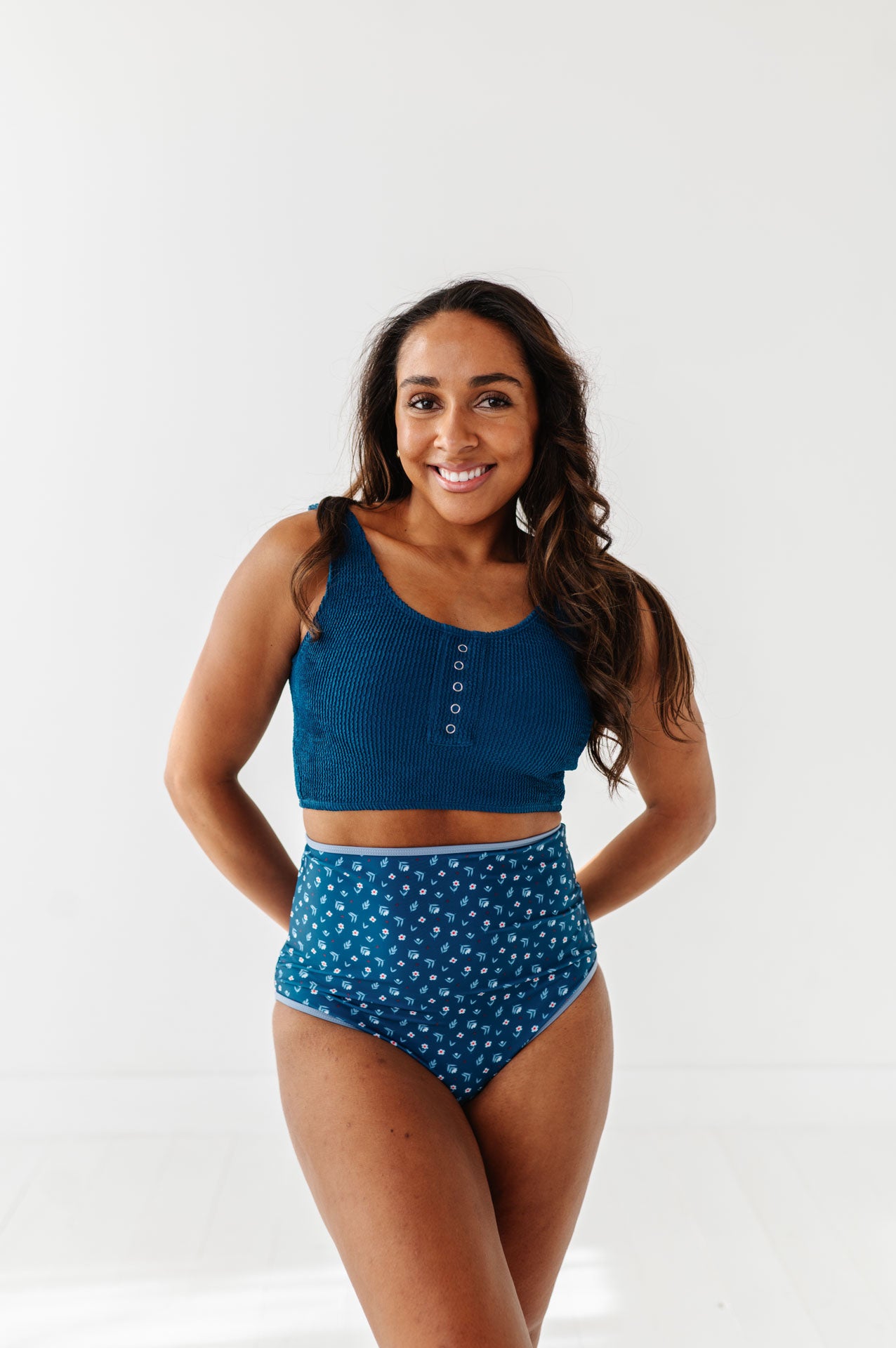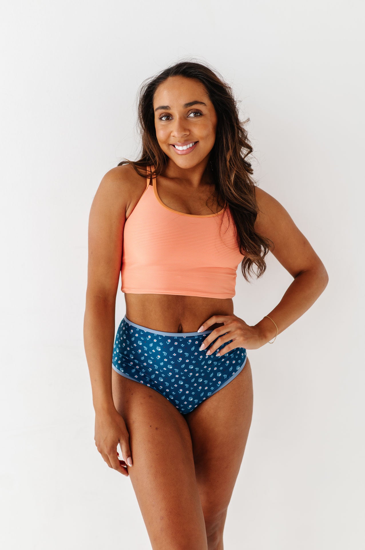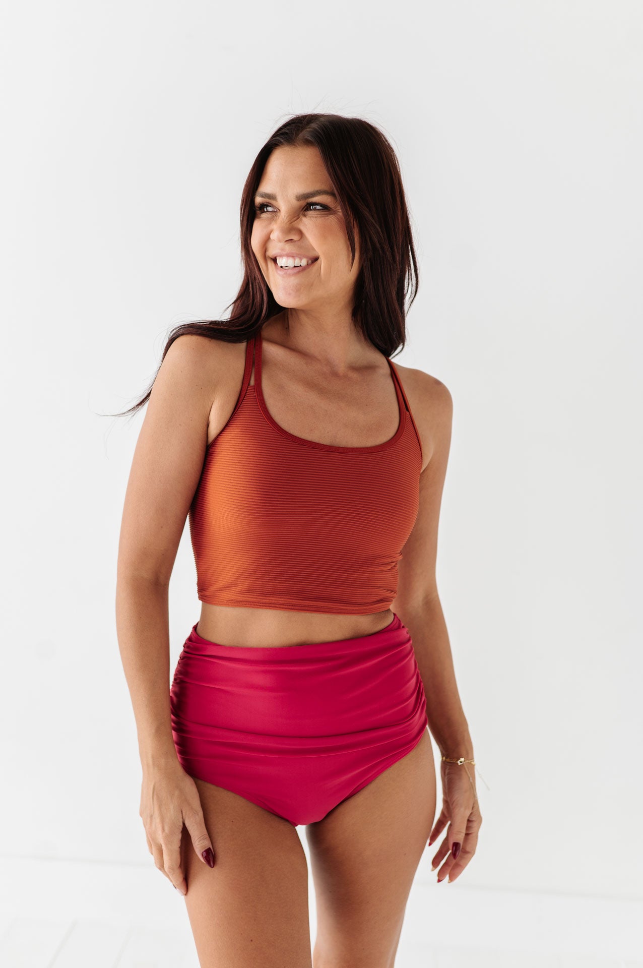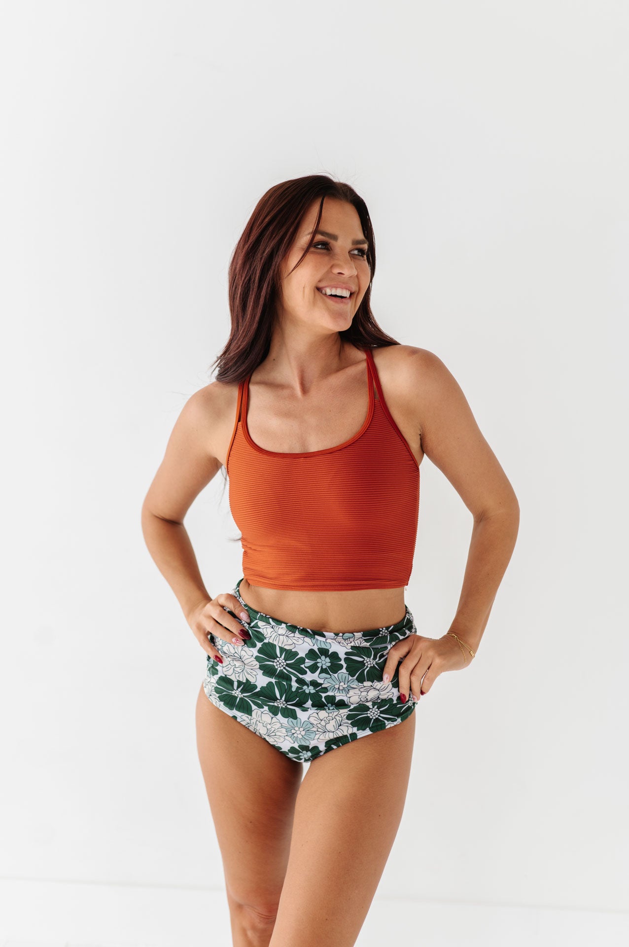 Just what I was looking for! Perfect rise just above belly button. I was looking for a swimsuit line that had pieces I felt comfortable in running around with my two young kids and this is it!