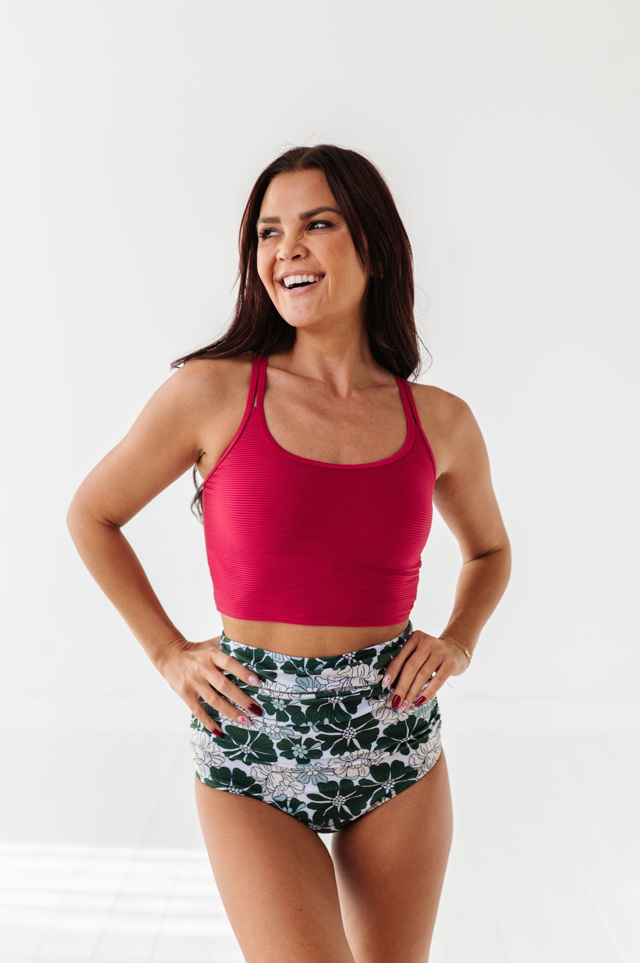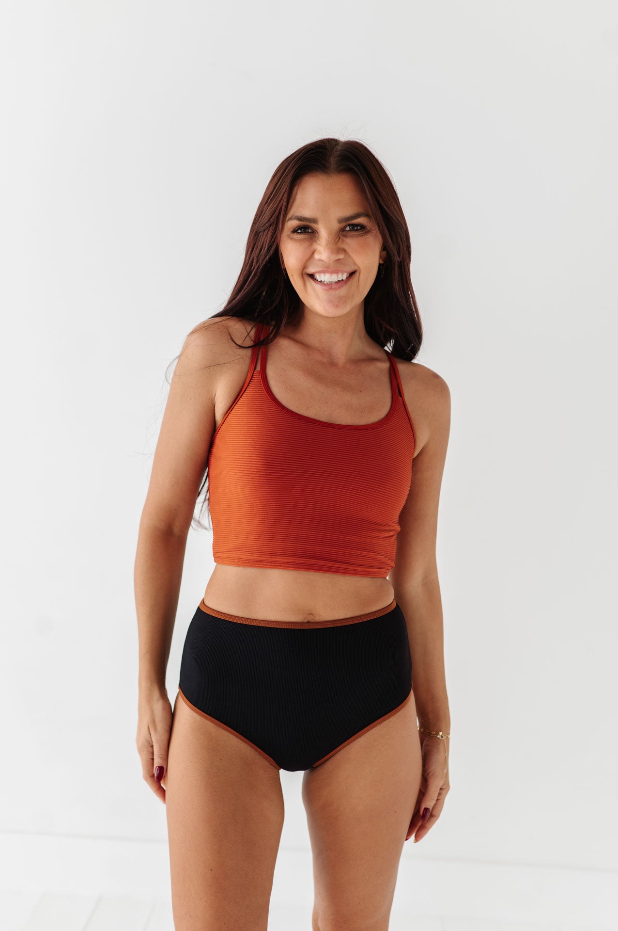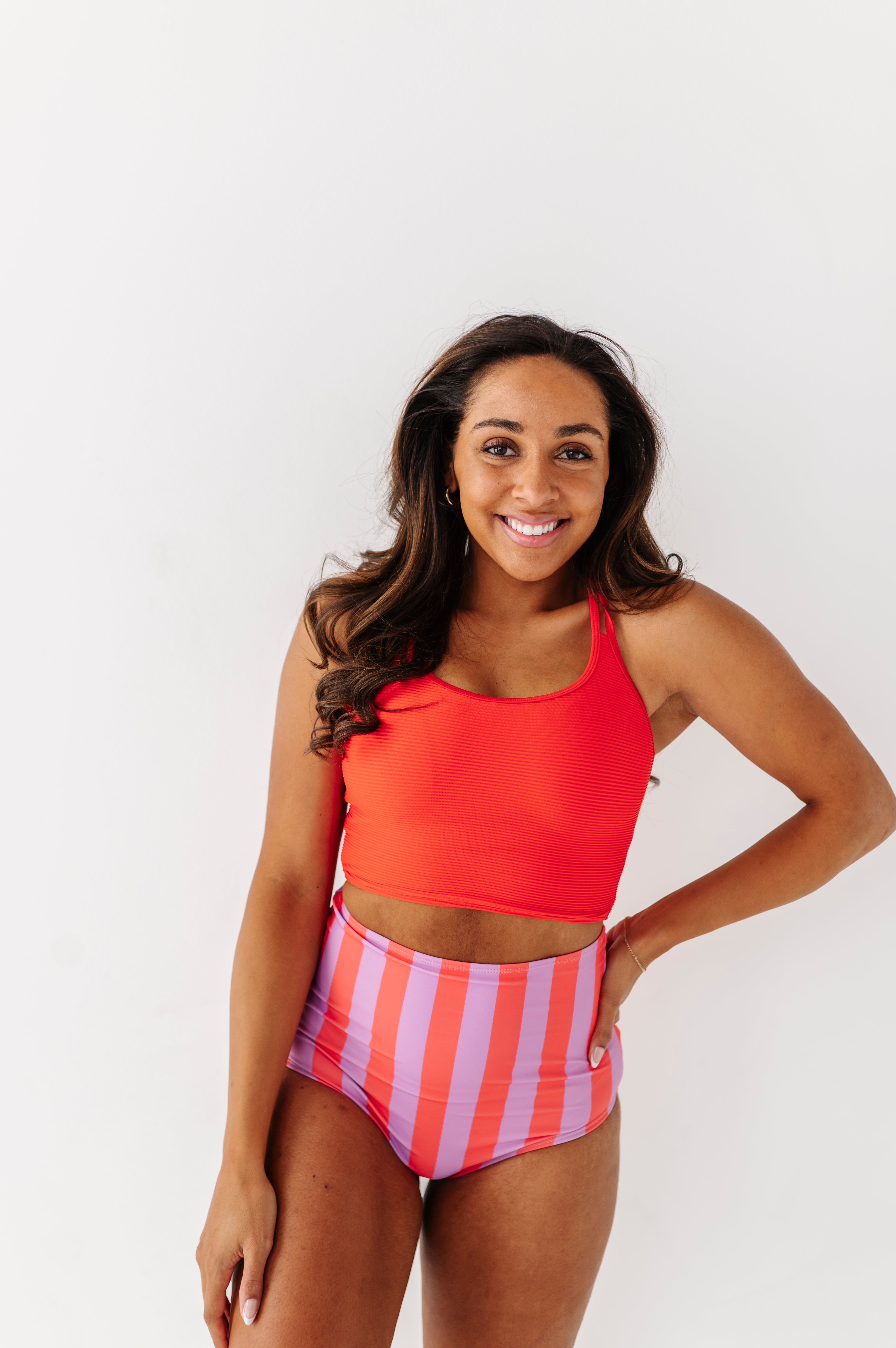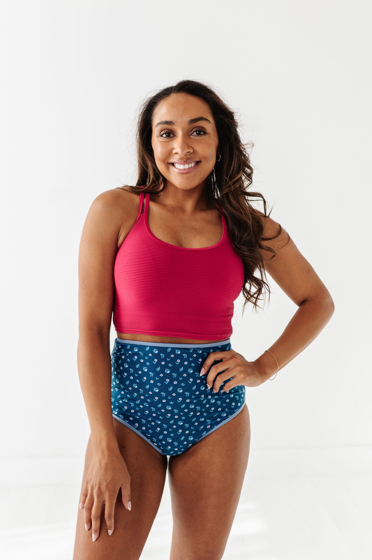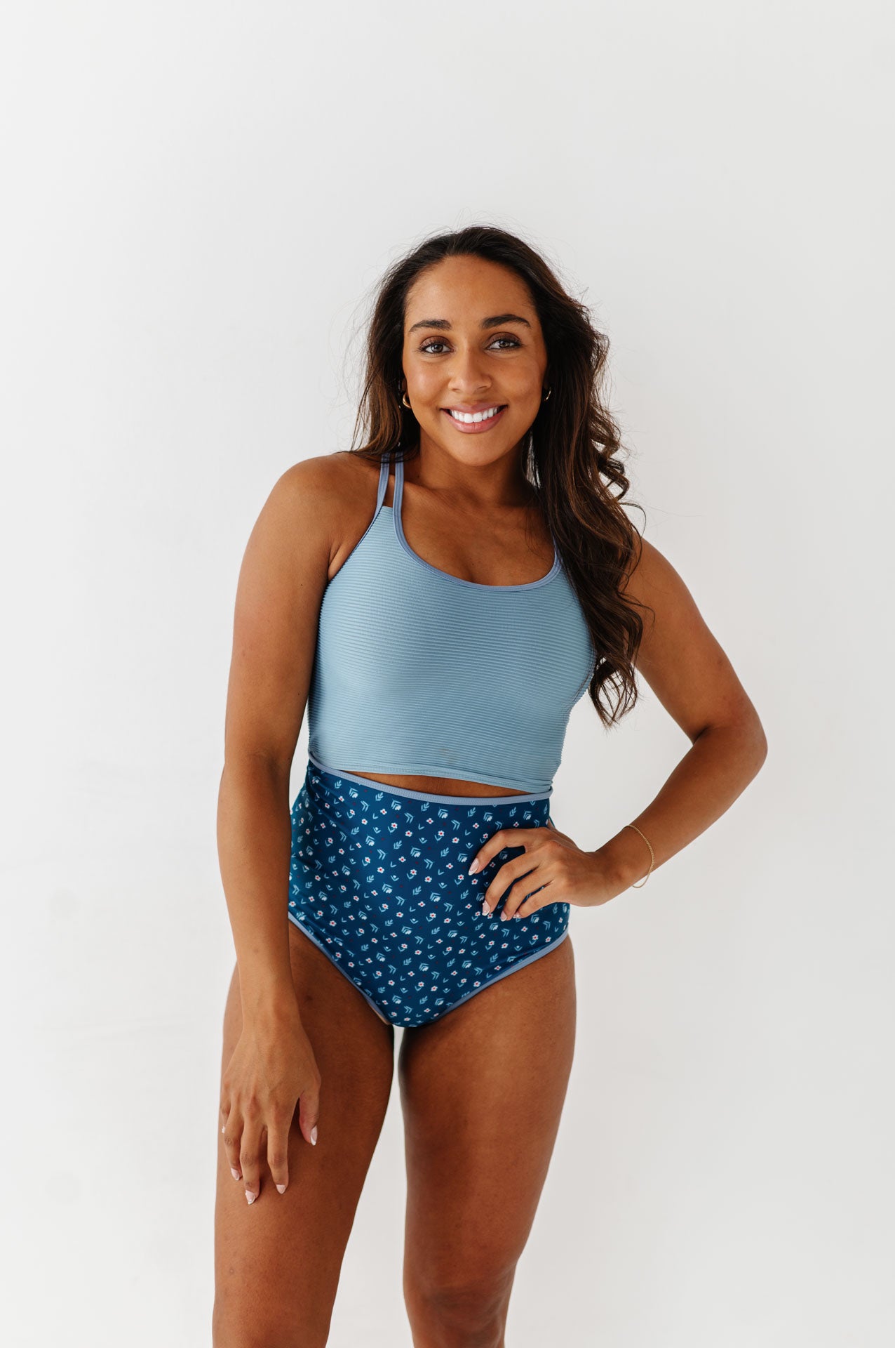 Just what I was looking for! Perfect rise just above belly button. I was looking for a swimsuit line that had pieces I felt comfortable in running around with my two young kids and this is it!