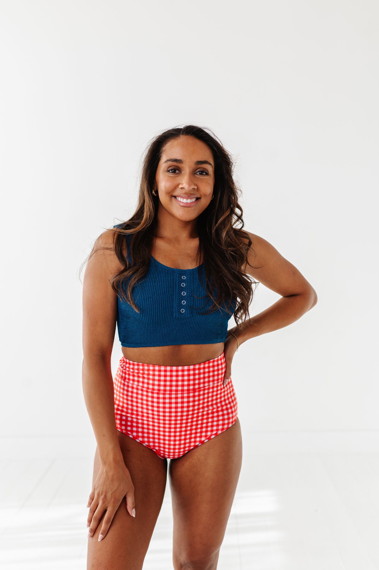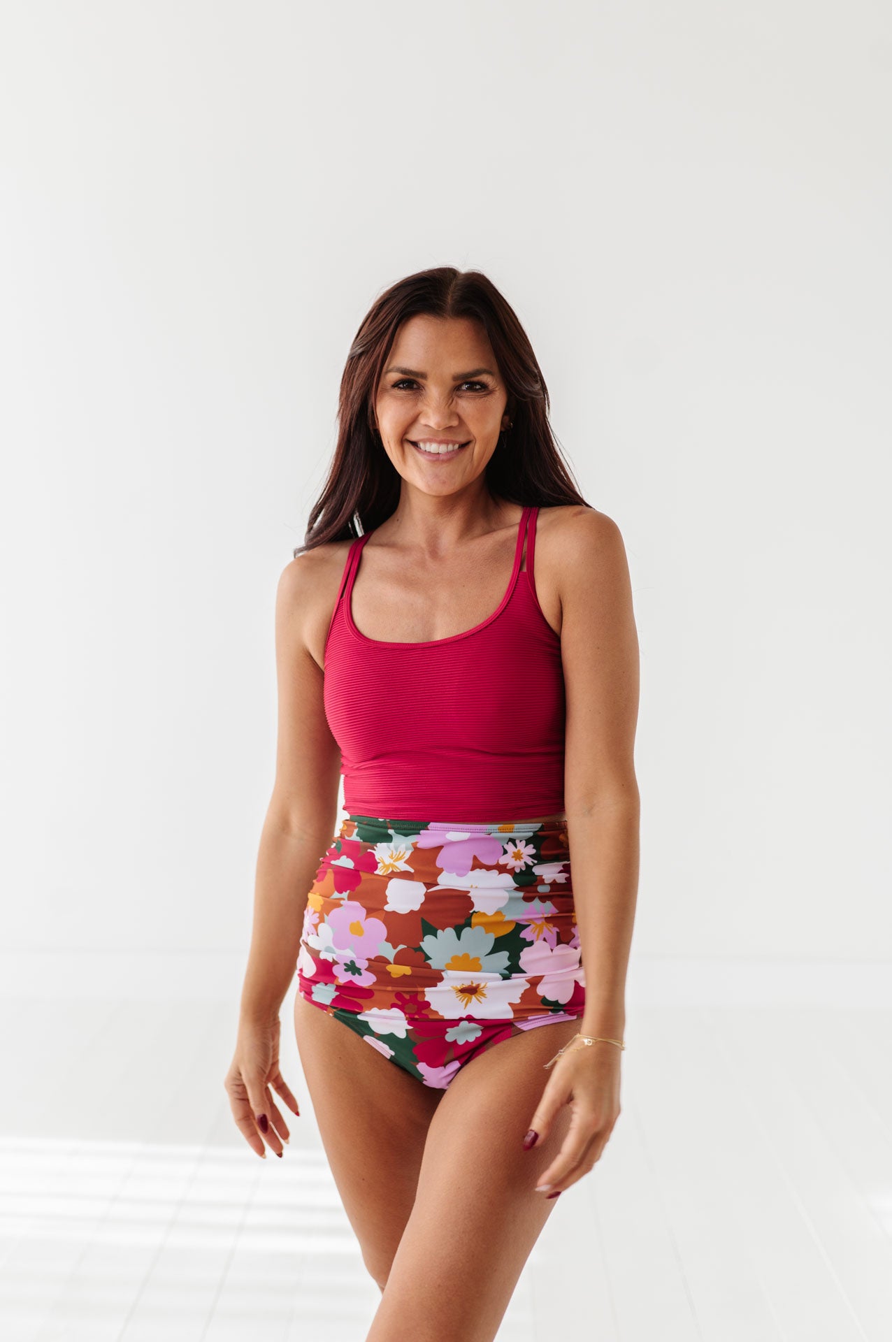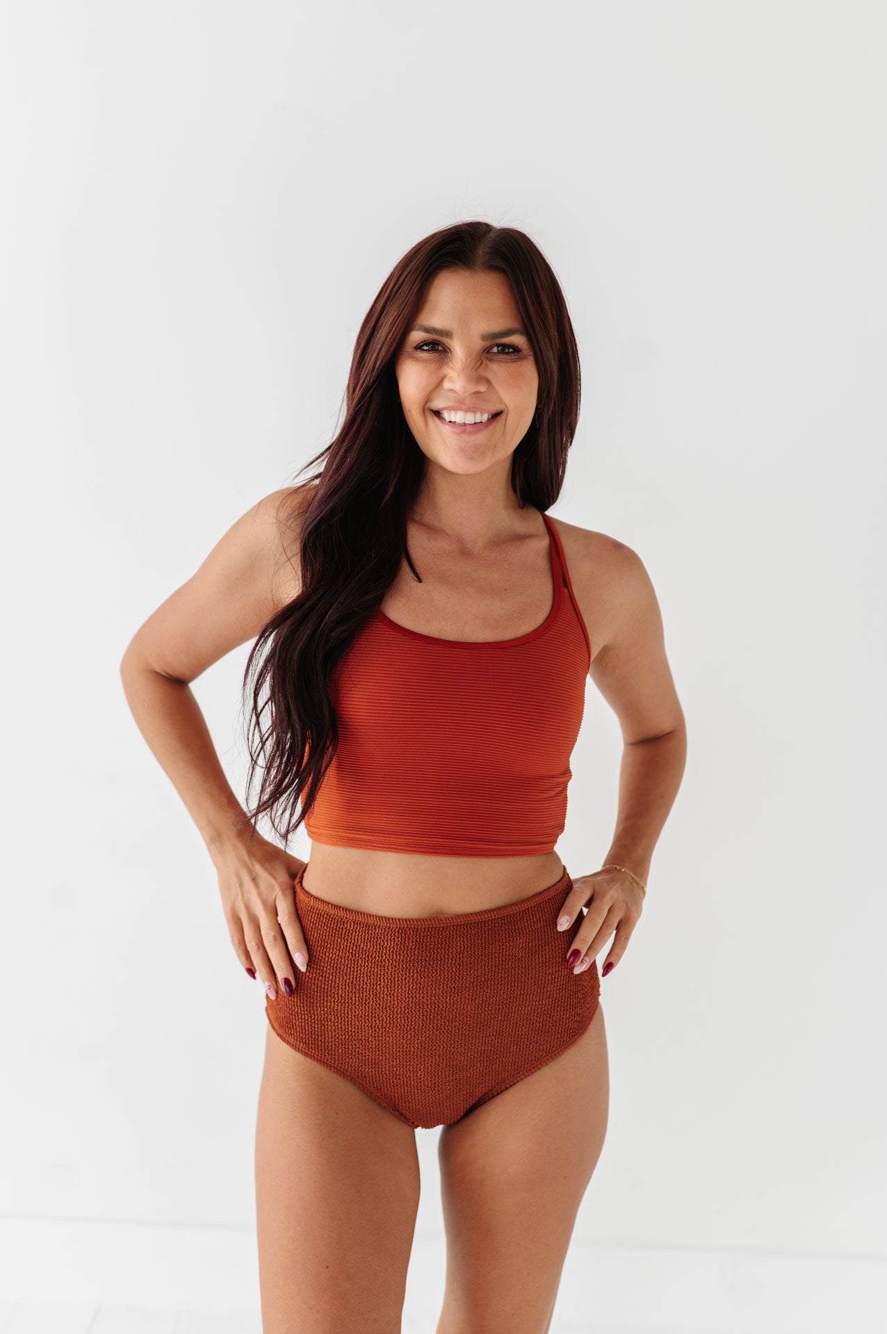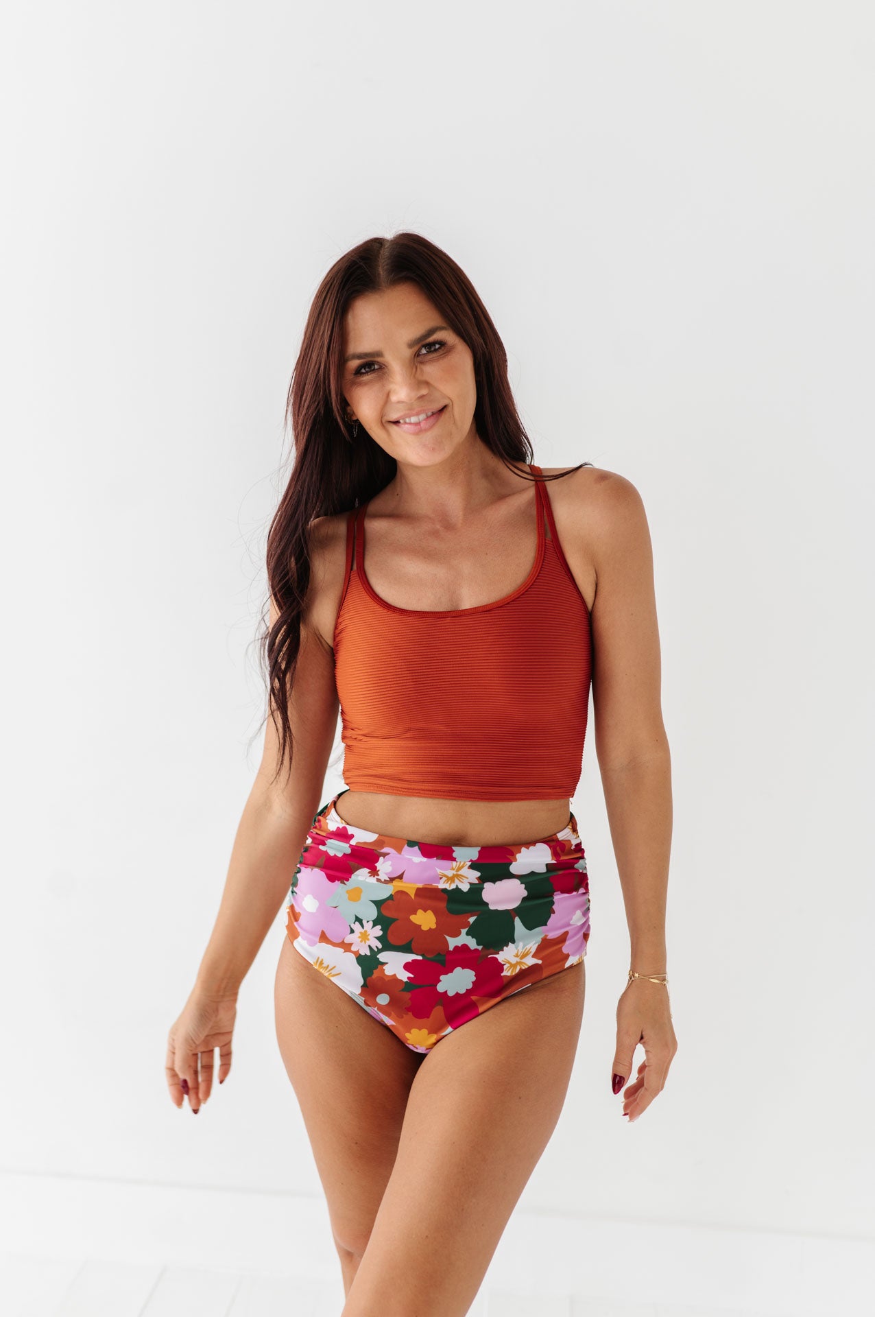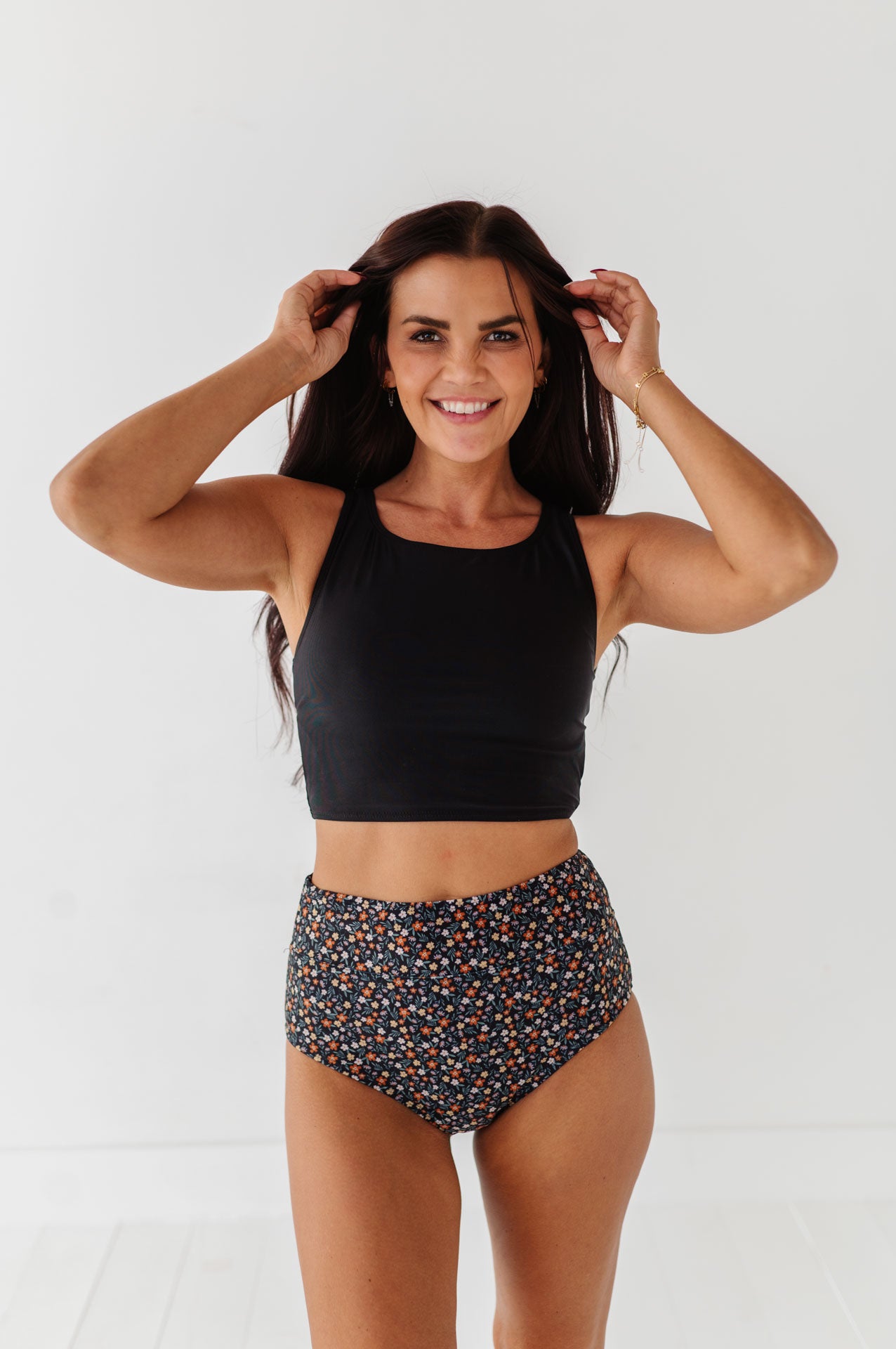 Just what I was looking for! Perfect rise just above belly button. I was looking for a swimsuit line that had pieces I felt comfortable in running around with my two young kids and this is it!