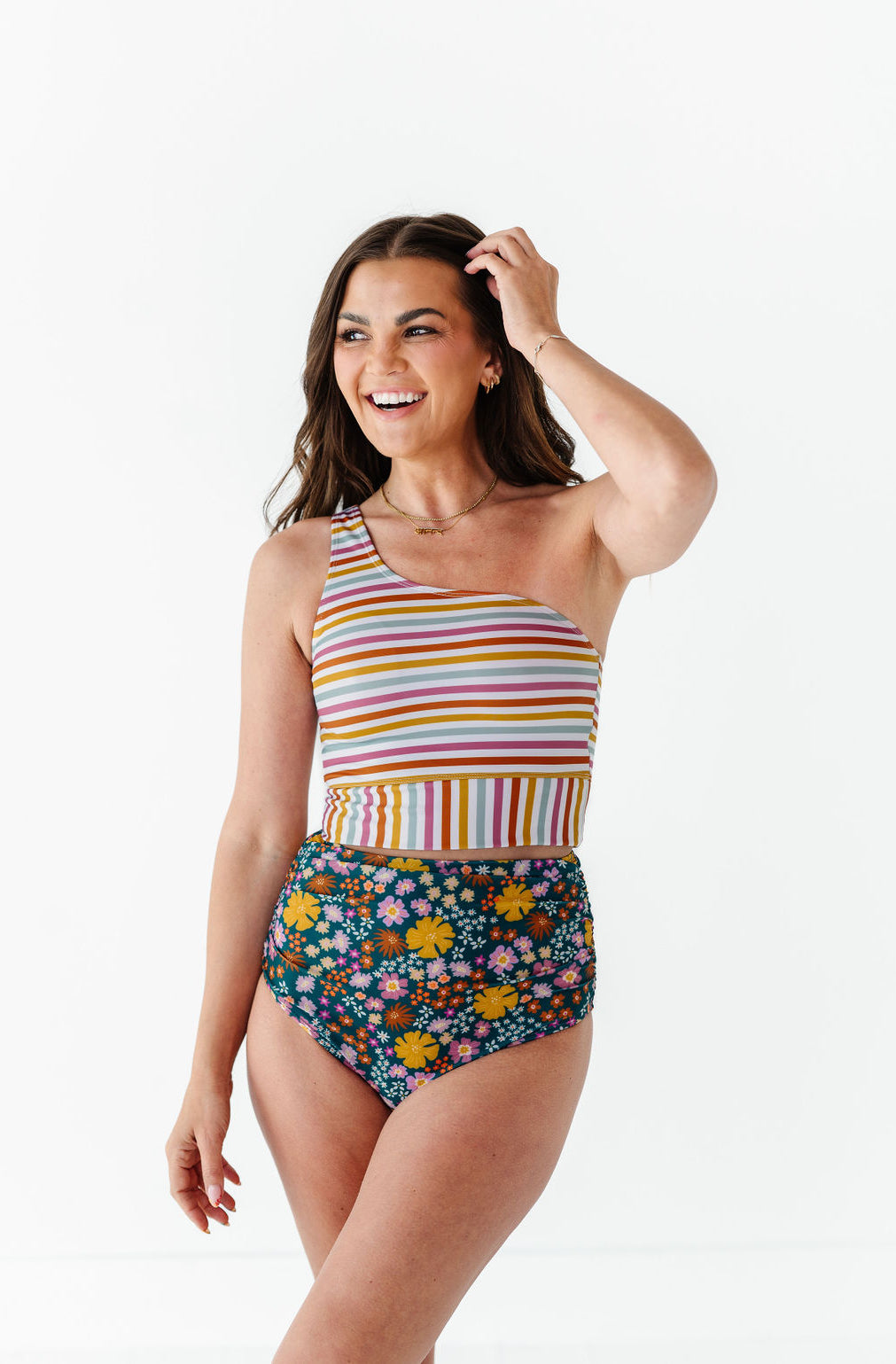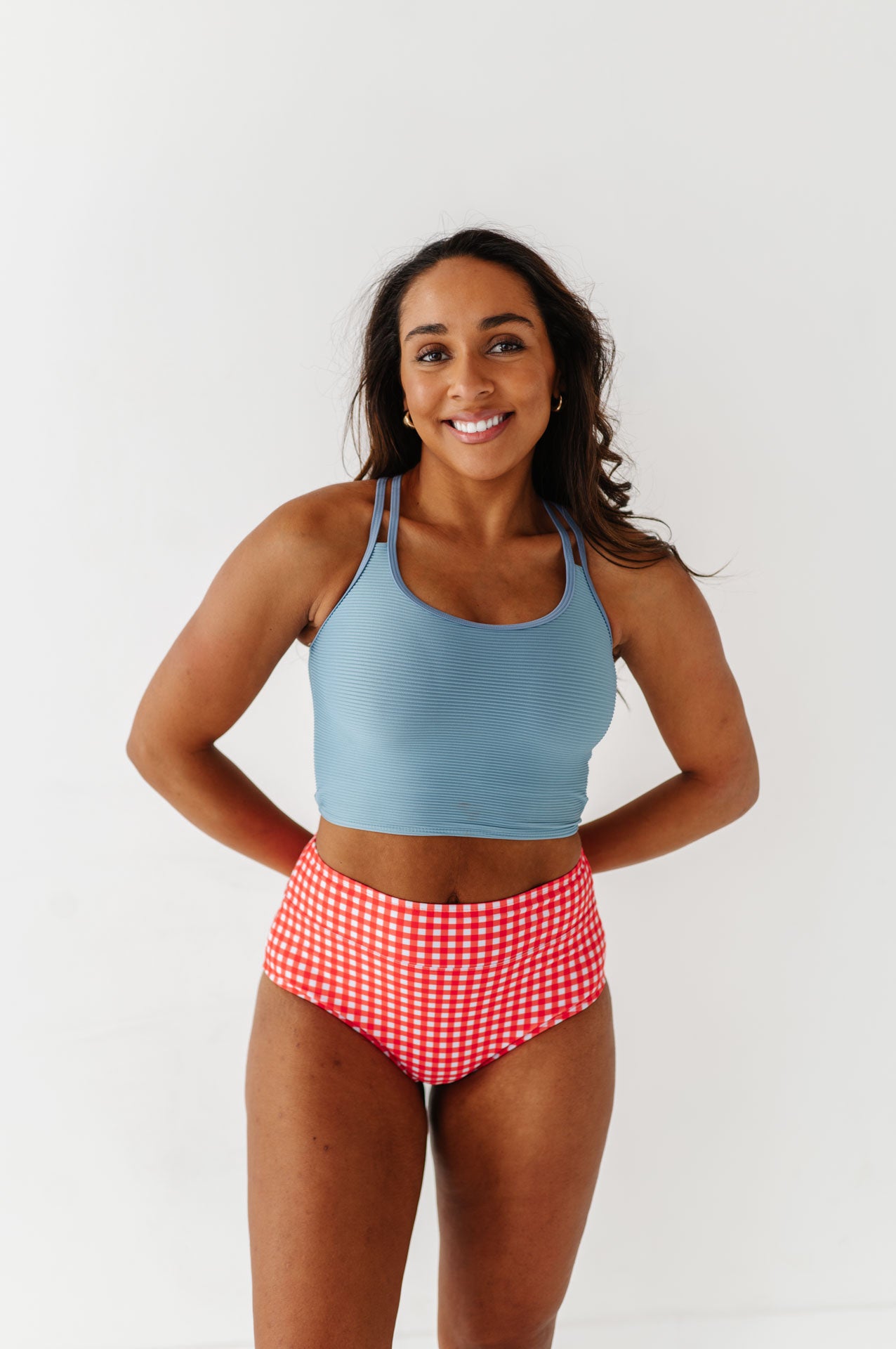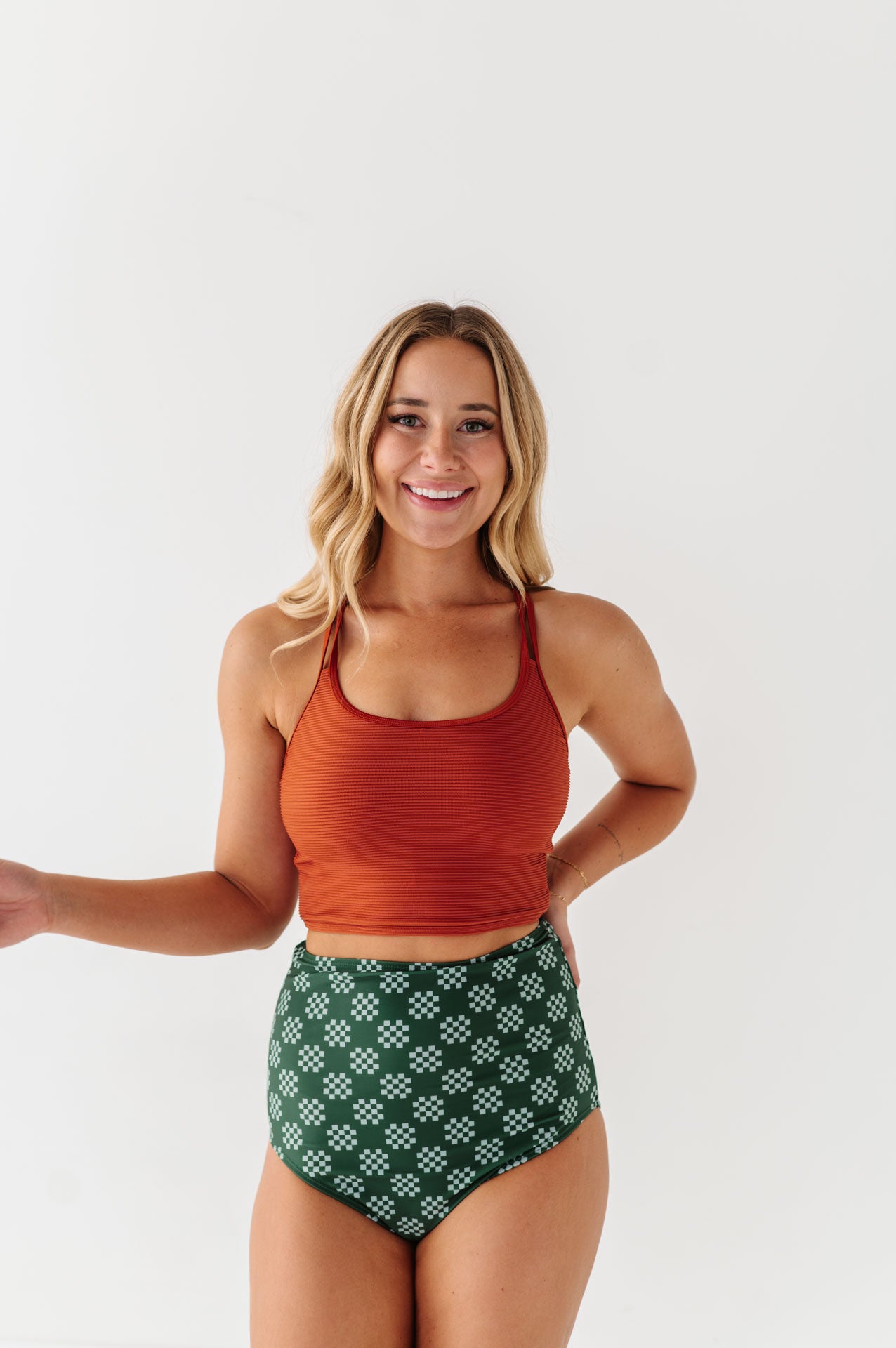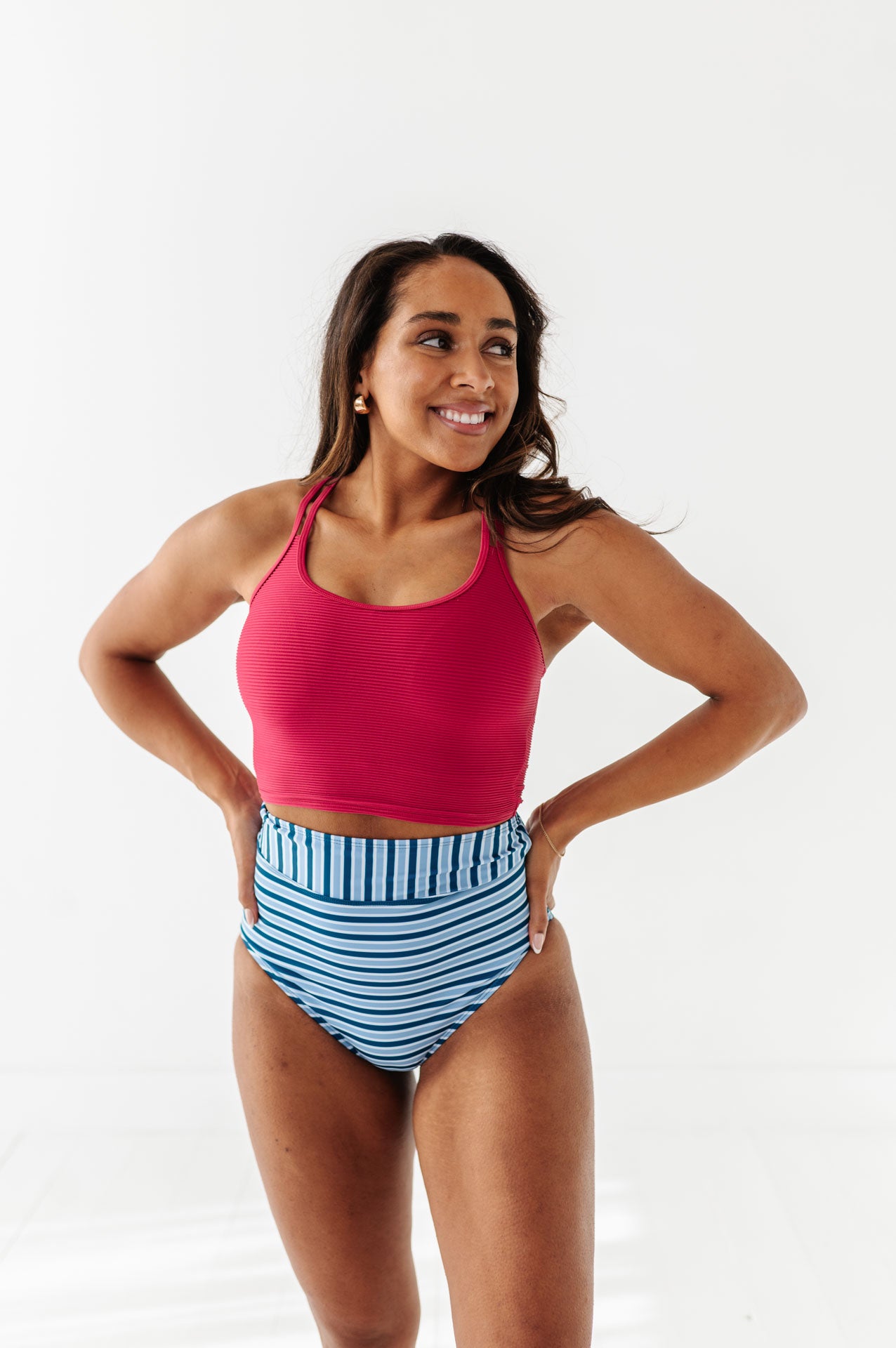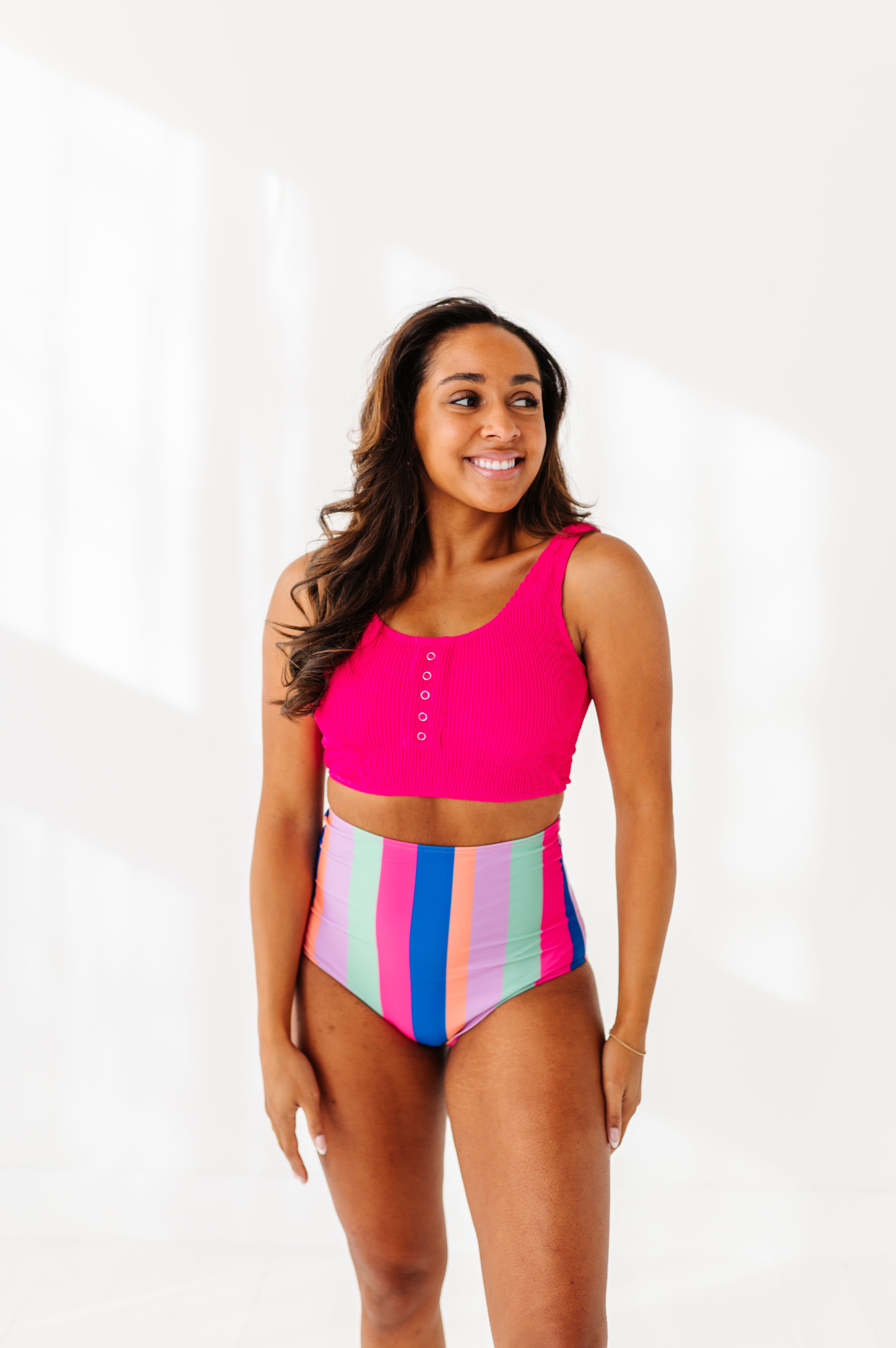 Just what I was looking for! Perfect rise just above belly button. I was looking for a swimsuit line that had pieces I felt comfortable in running around with my two young kids and this is it!