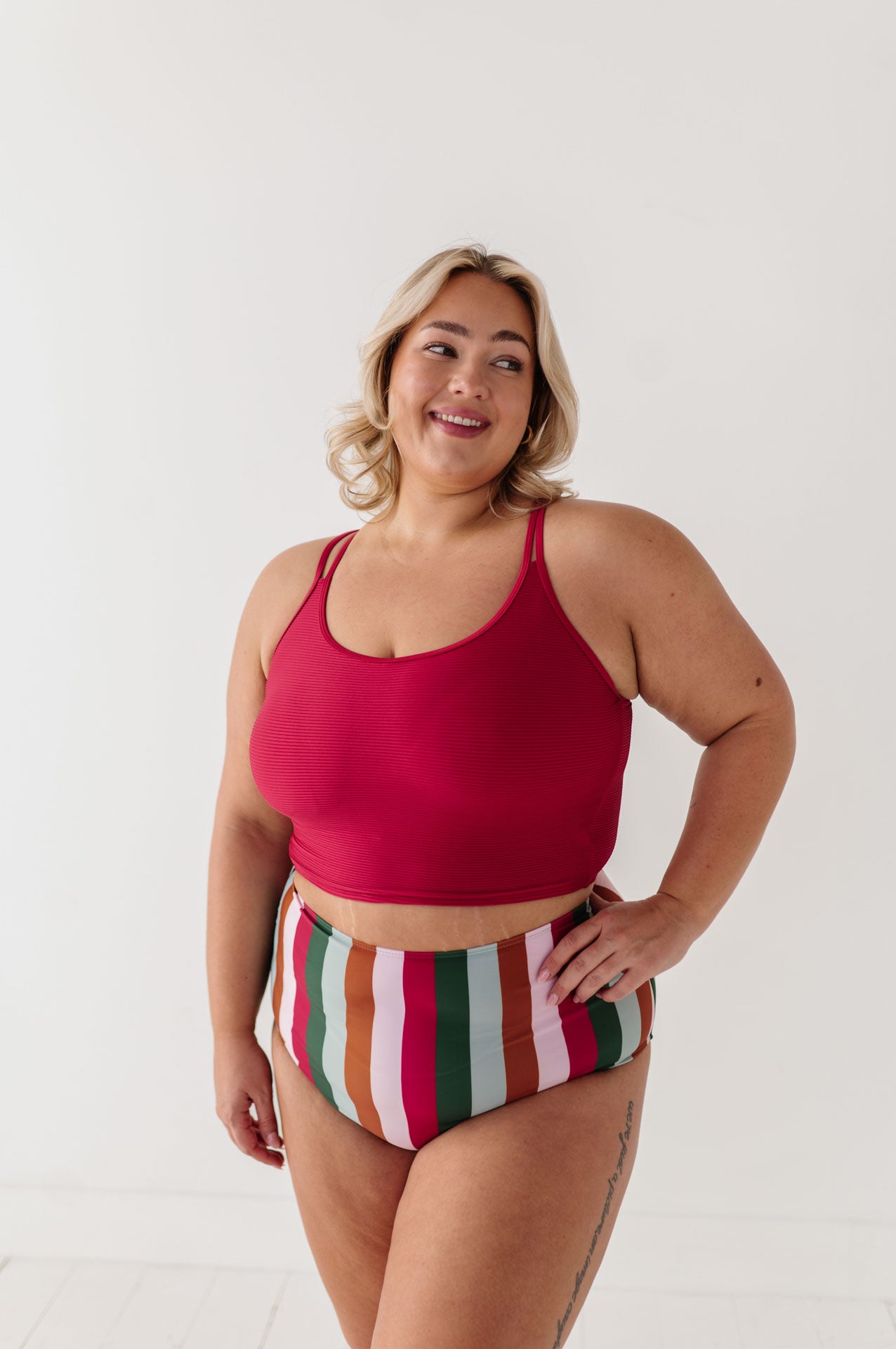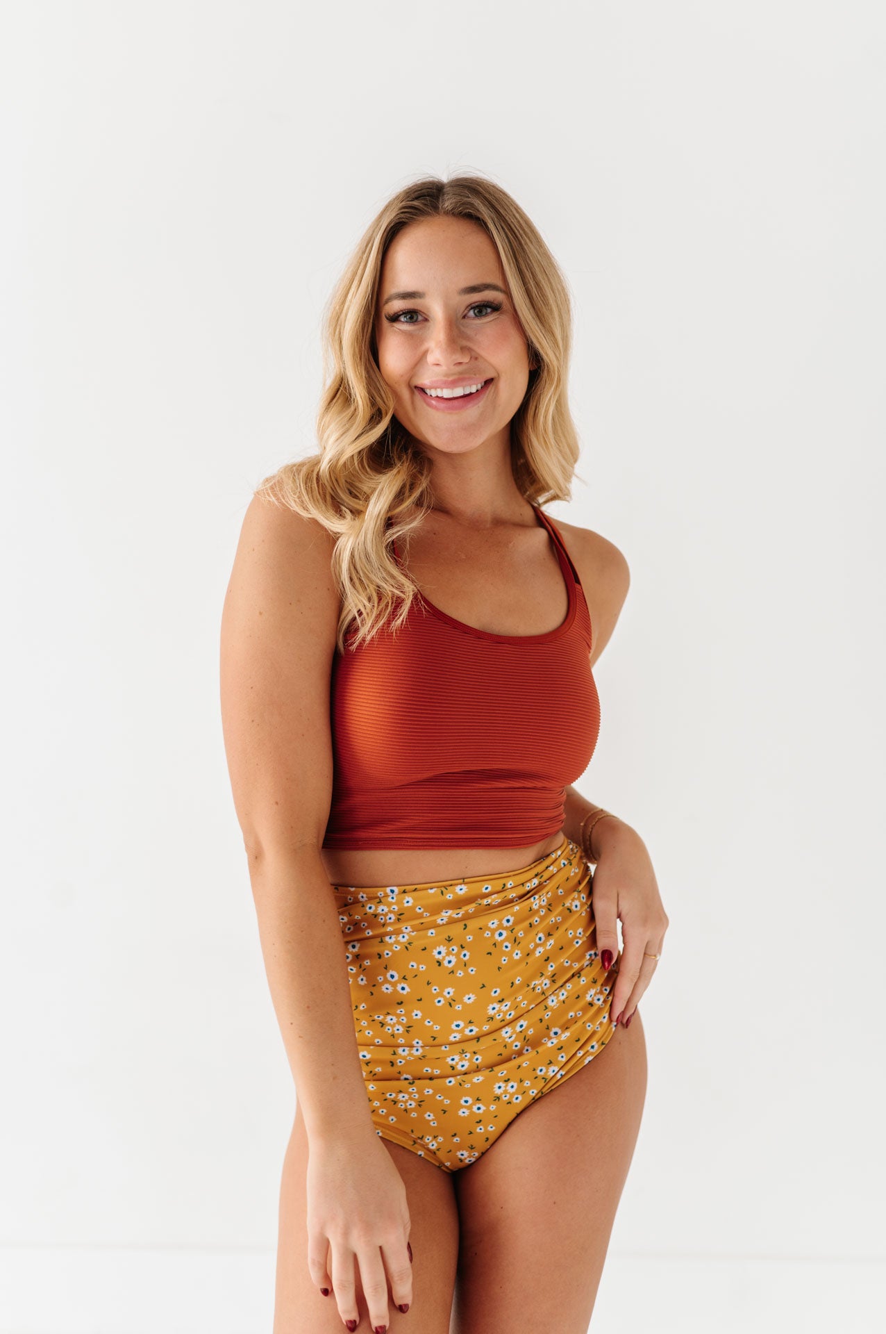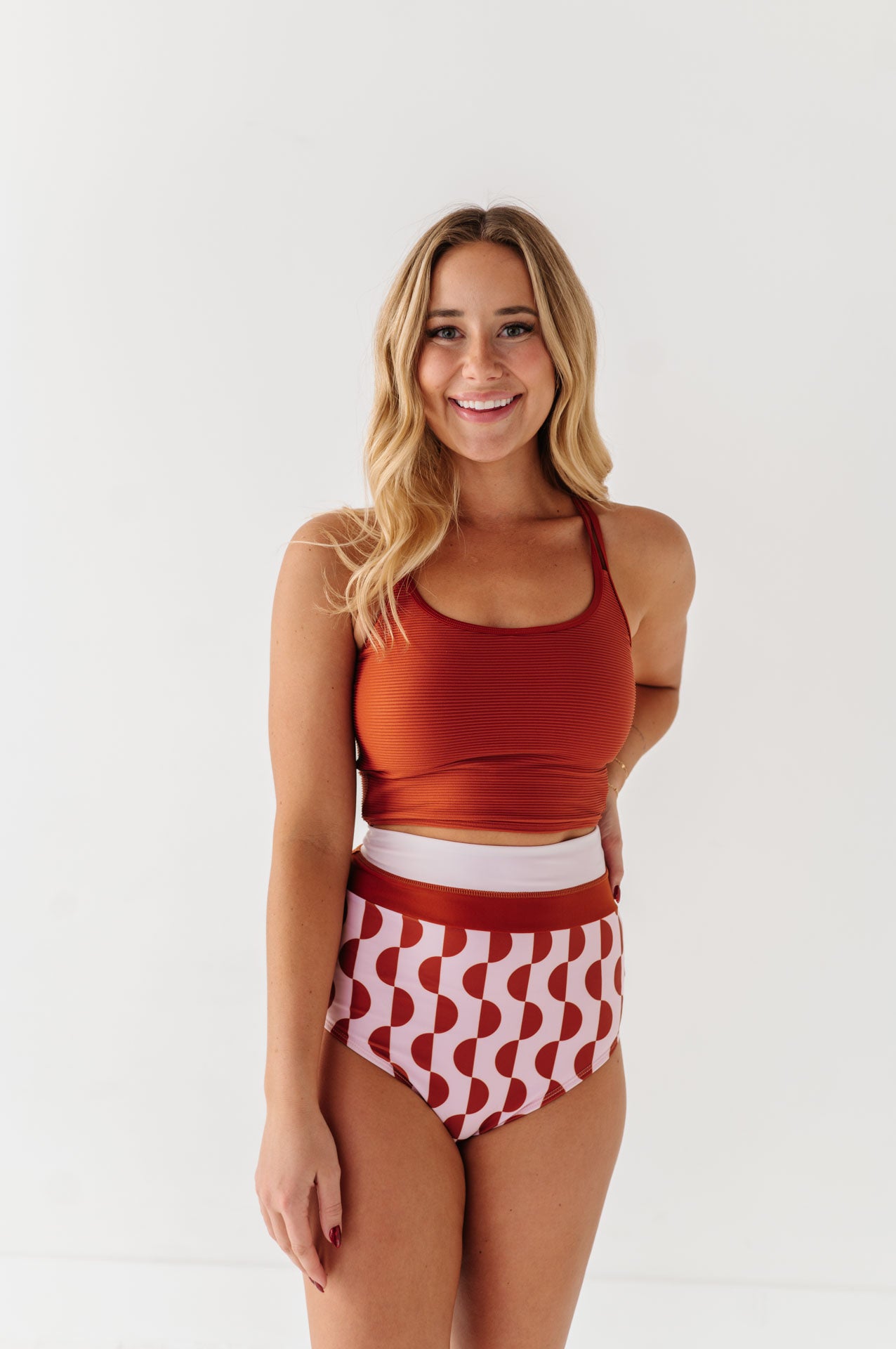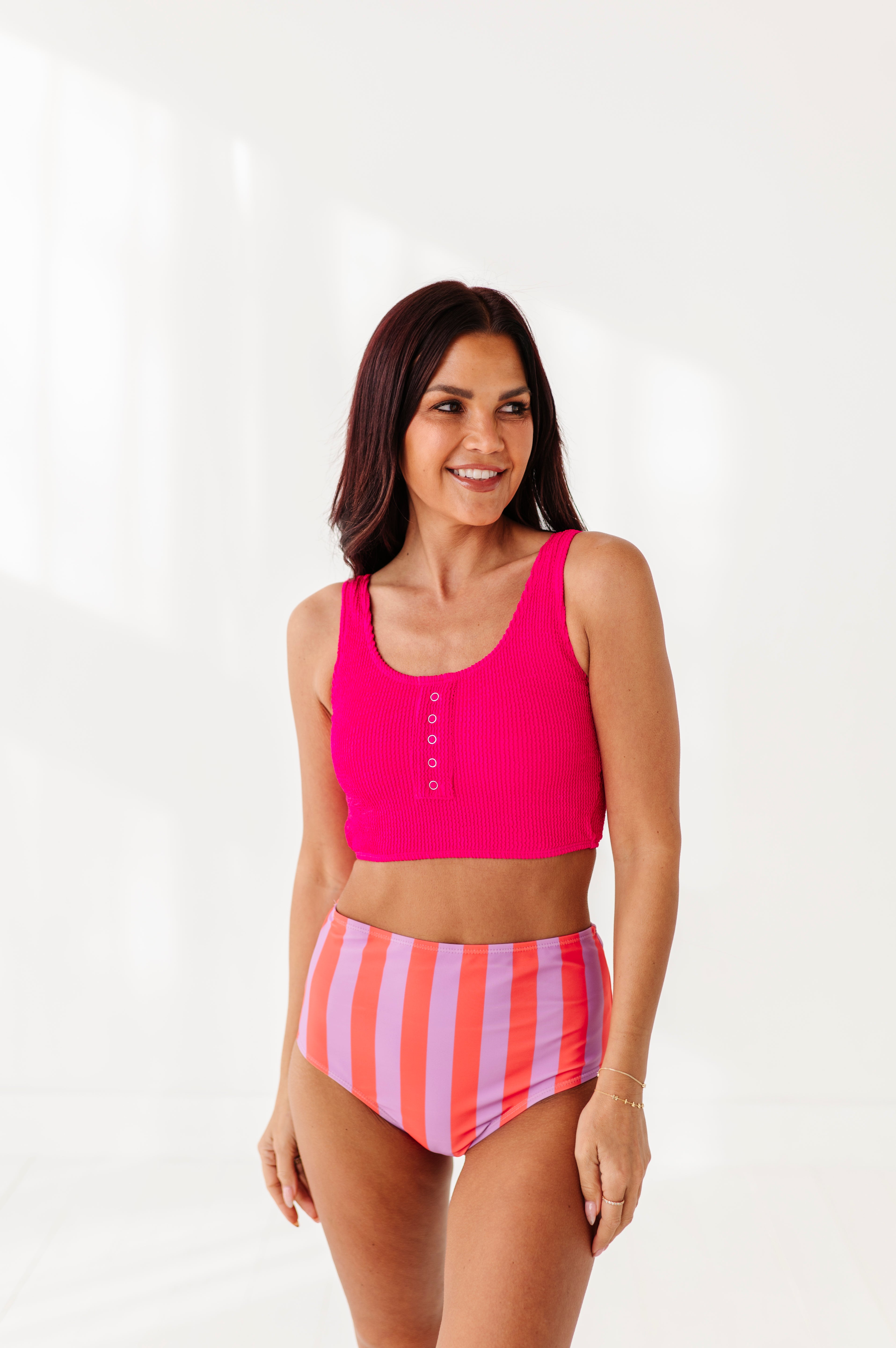 Just what I was looking for! Perfect rise just above belly button. I was looking for a swimsuit line that had pieces I felt comfortable in running around with my two young kids and this is it!