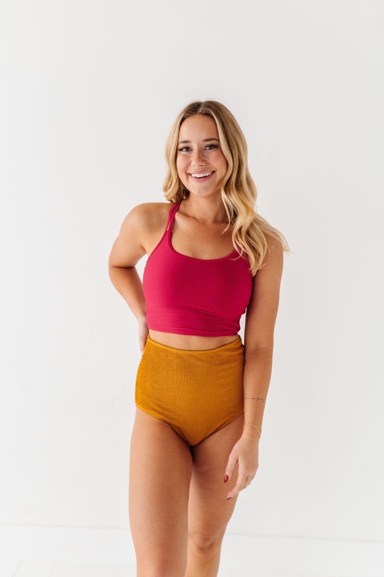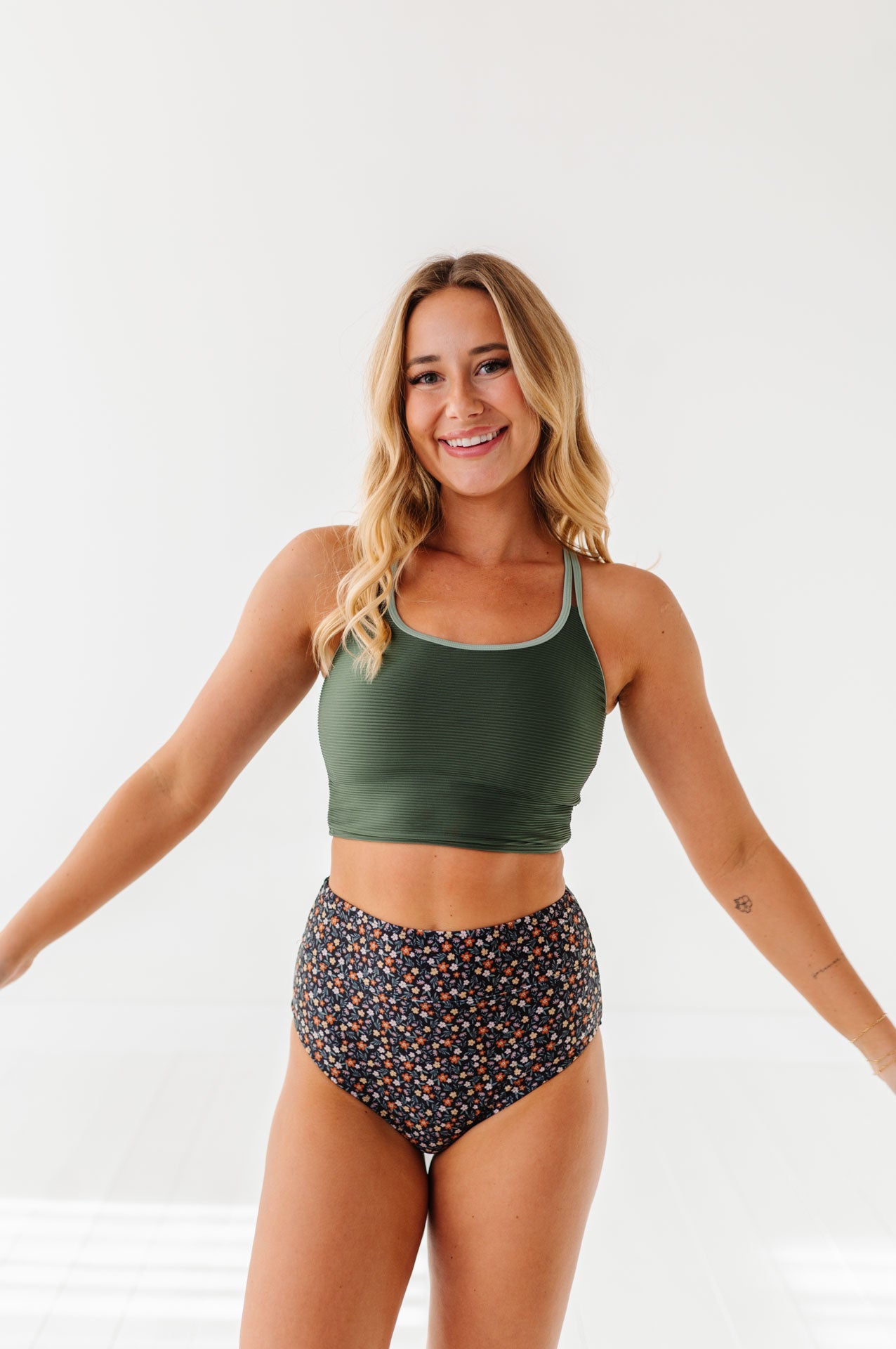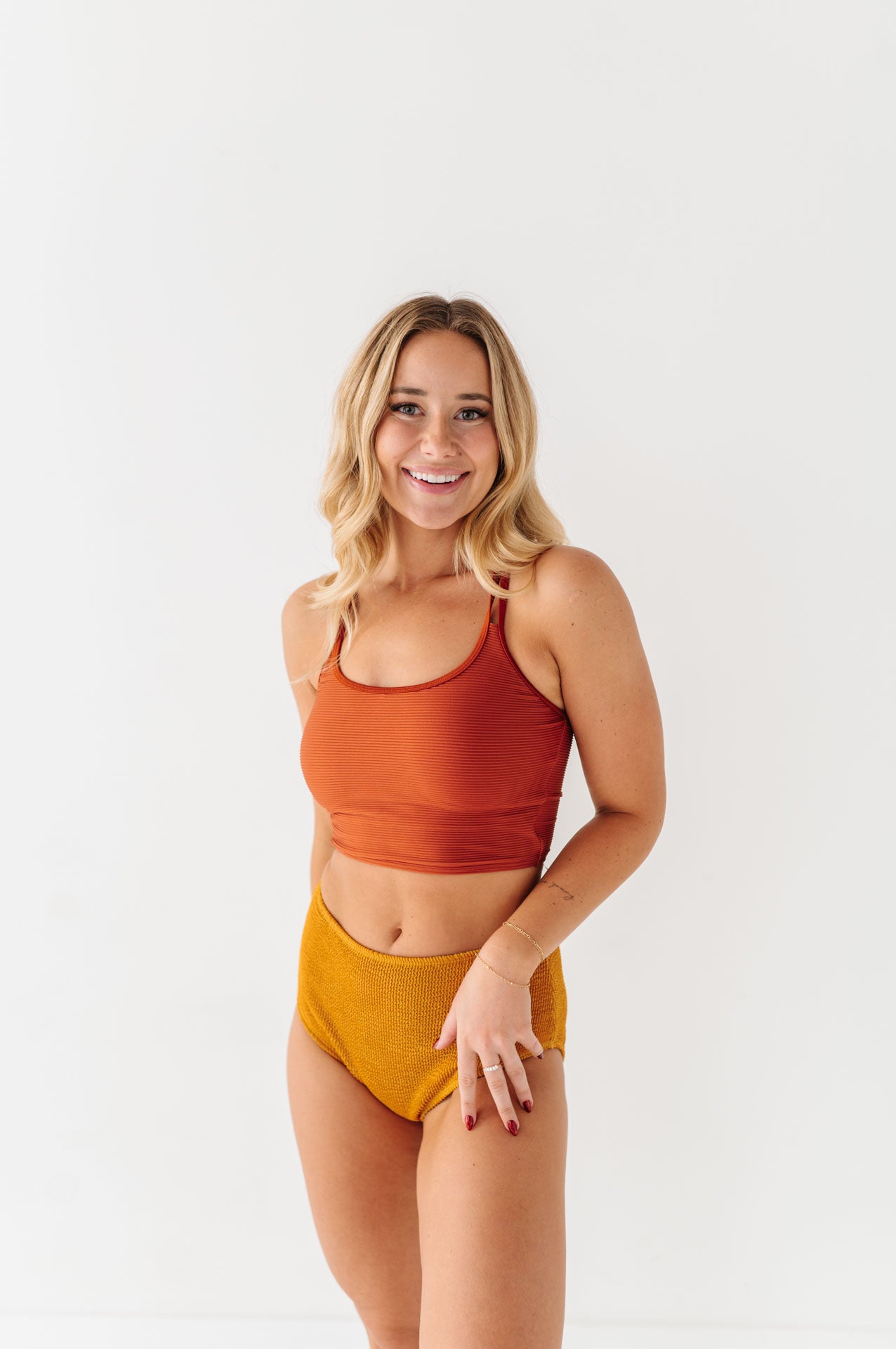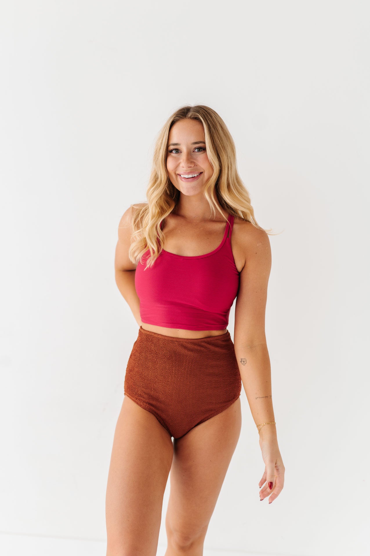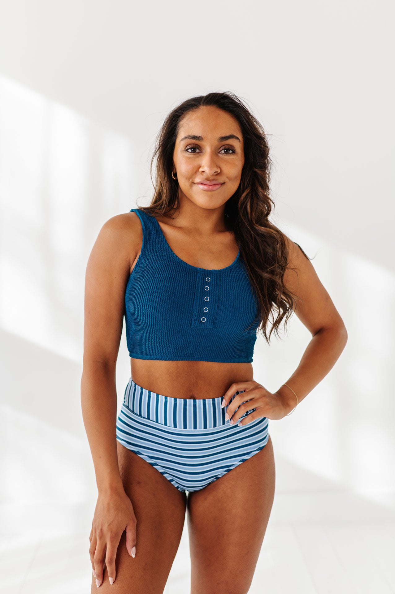 Just what I was looking for! Perfect rise just above belly button. I was looking for a swimsuit line that had pieces I felt comfortable in running around with my two young kids and this is it!