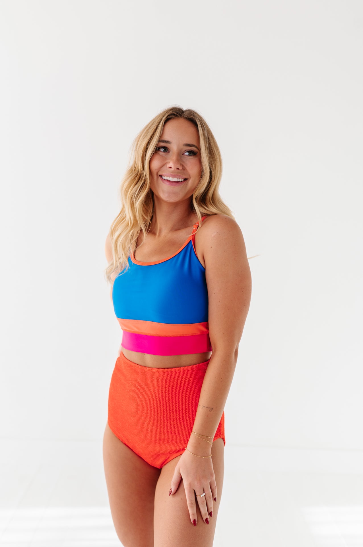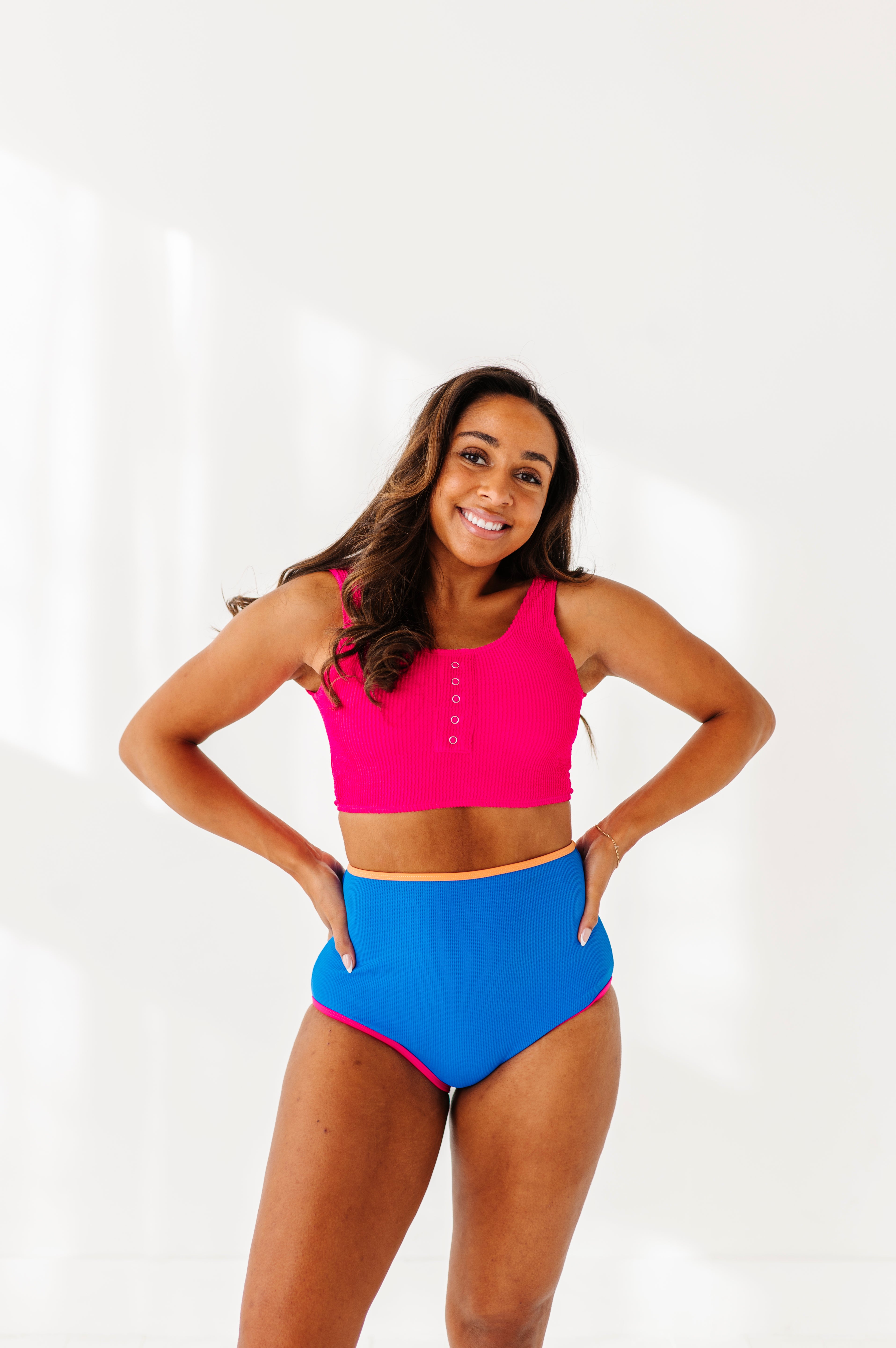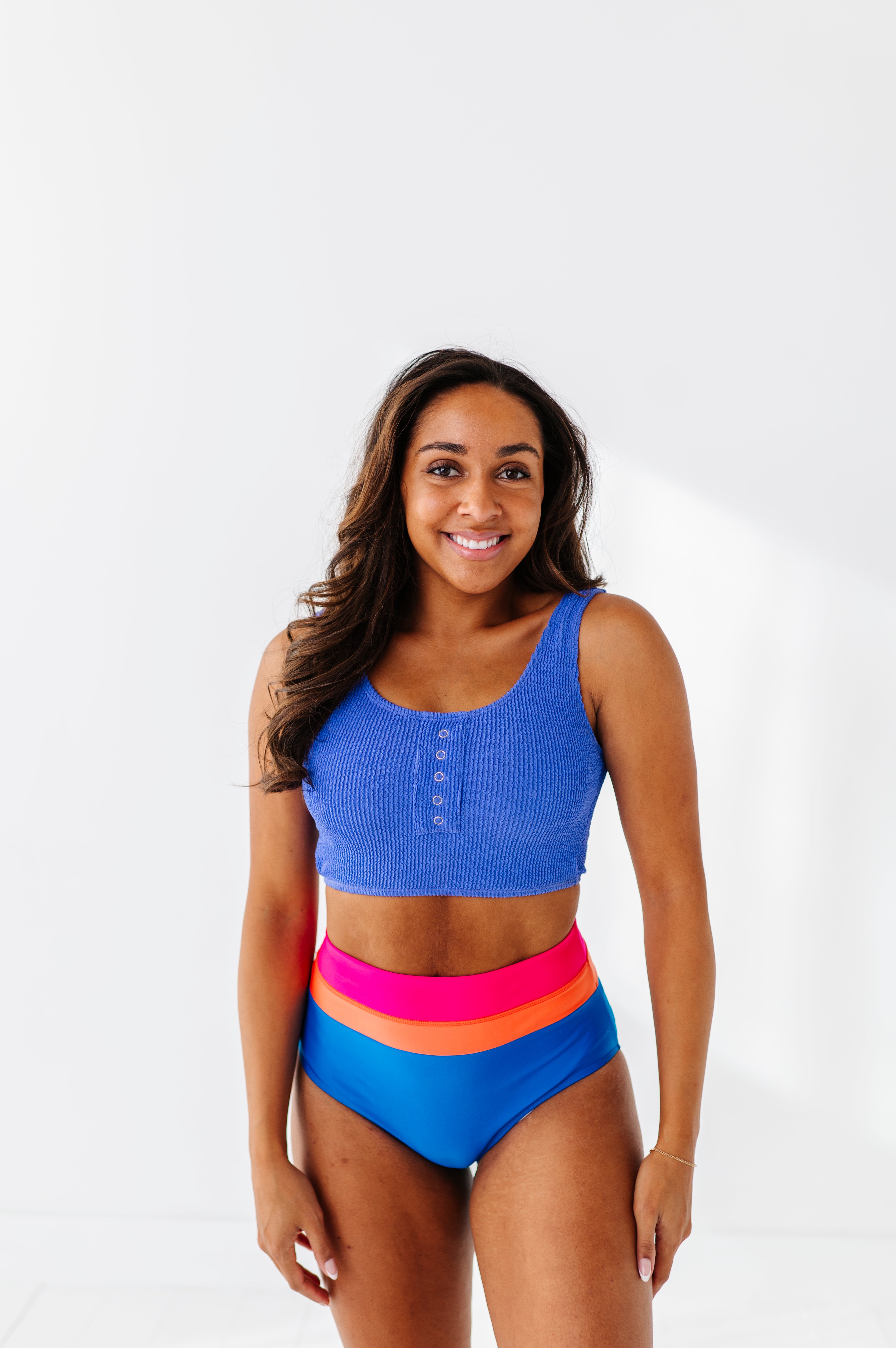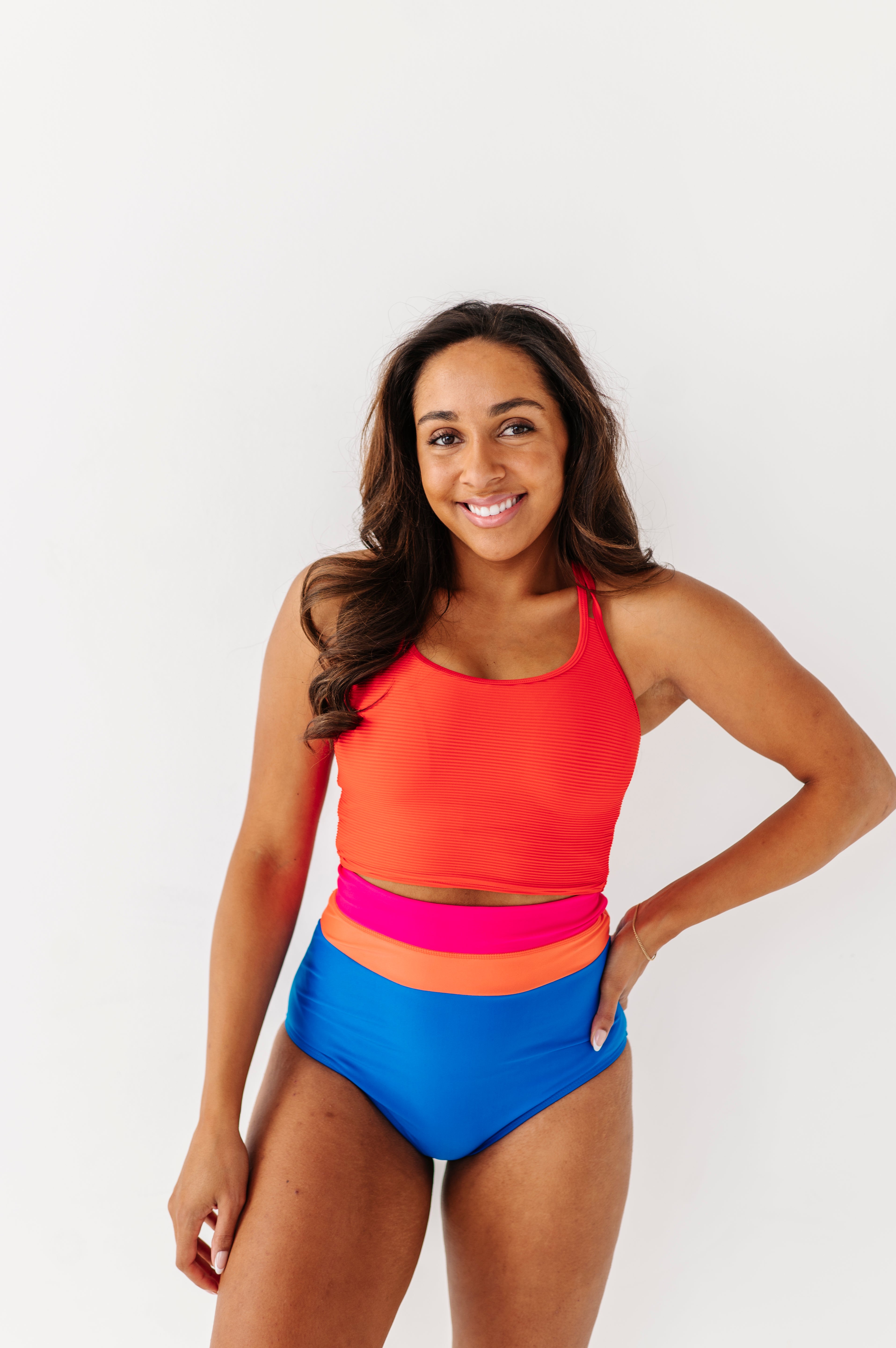 Beautiful vibrant colors. True to size. I have a short torso so with the high waisted bottoms my entire midsection is covered. I absolutely live this suit.It's very comfortable and modest.
