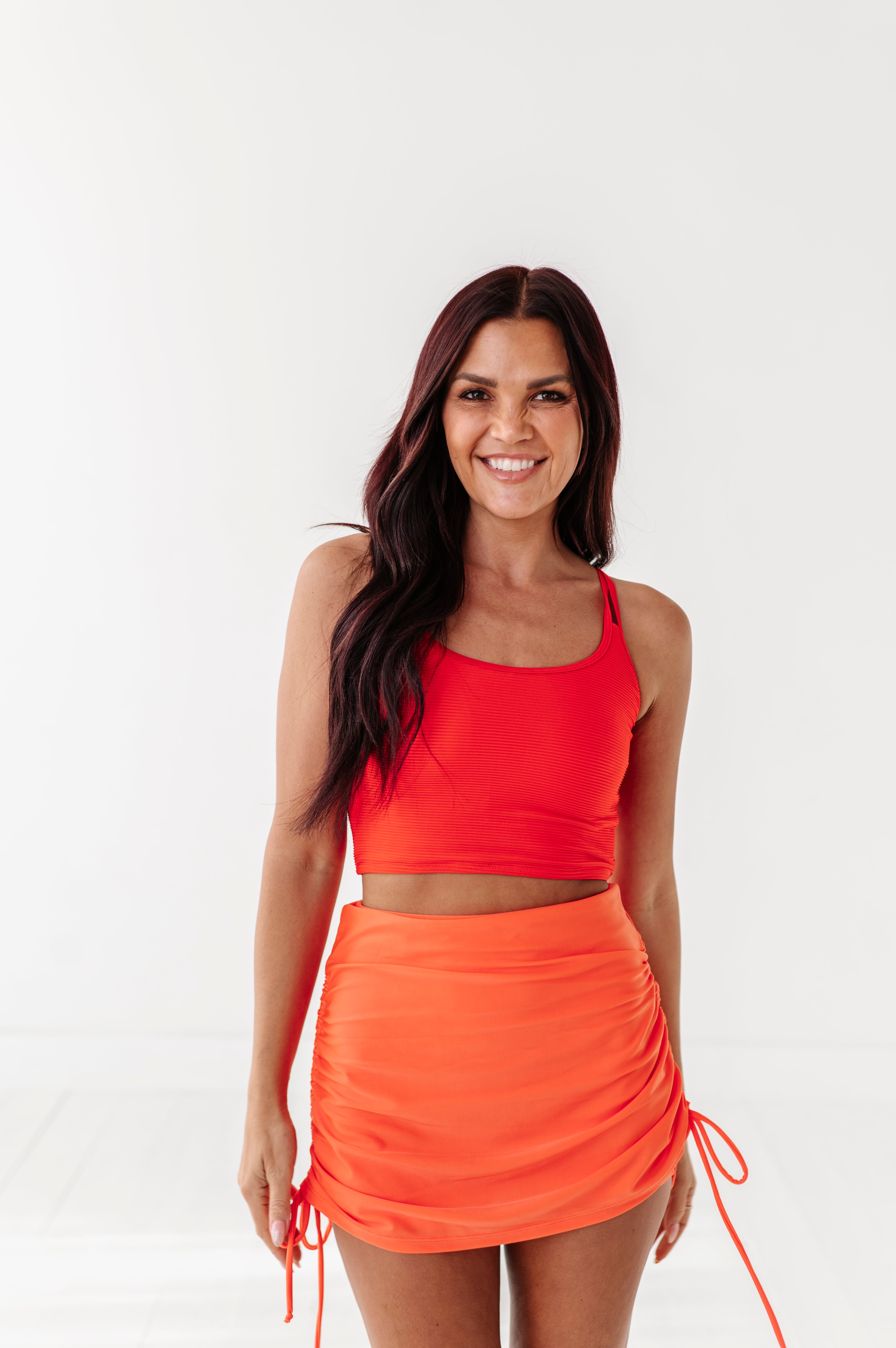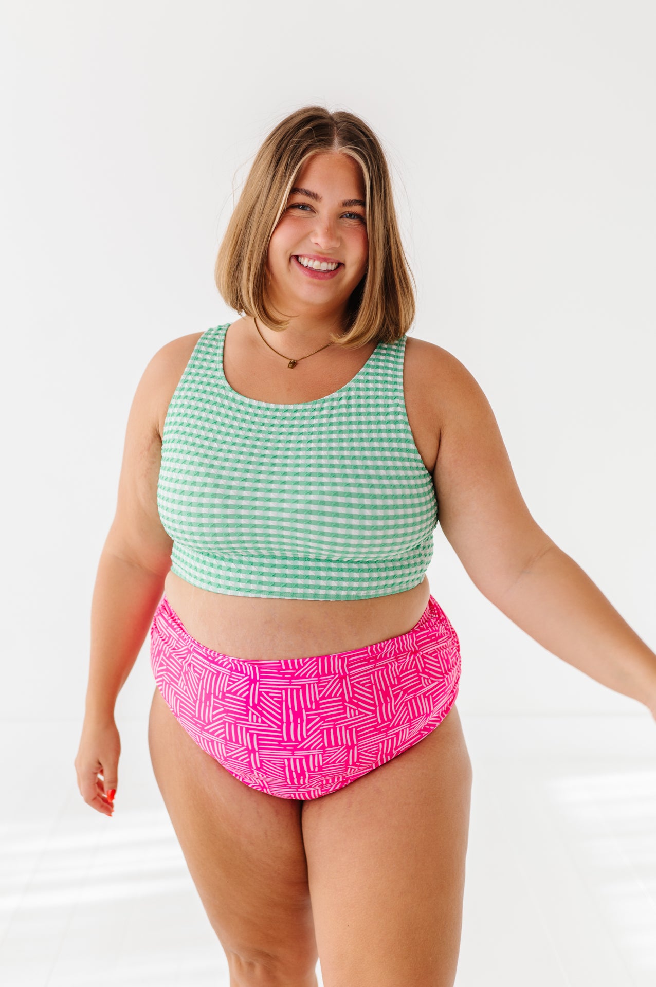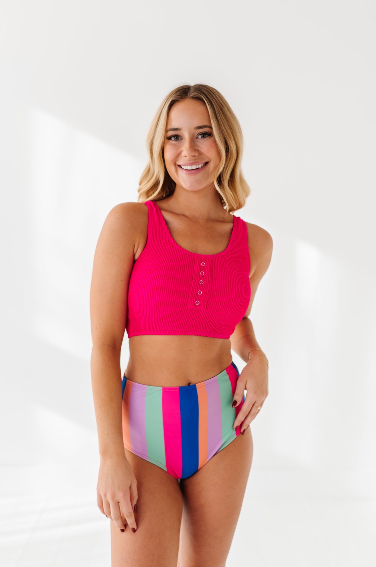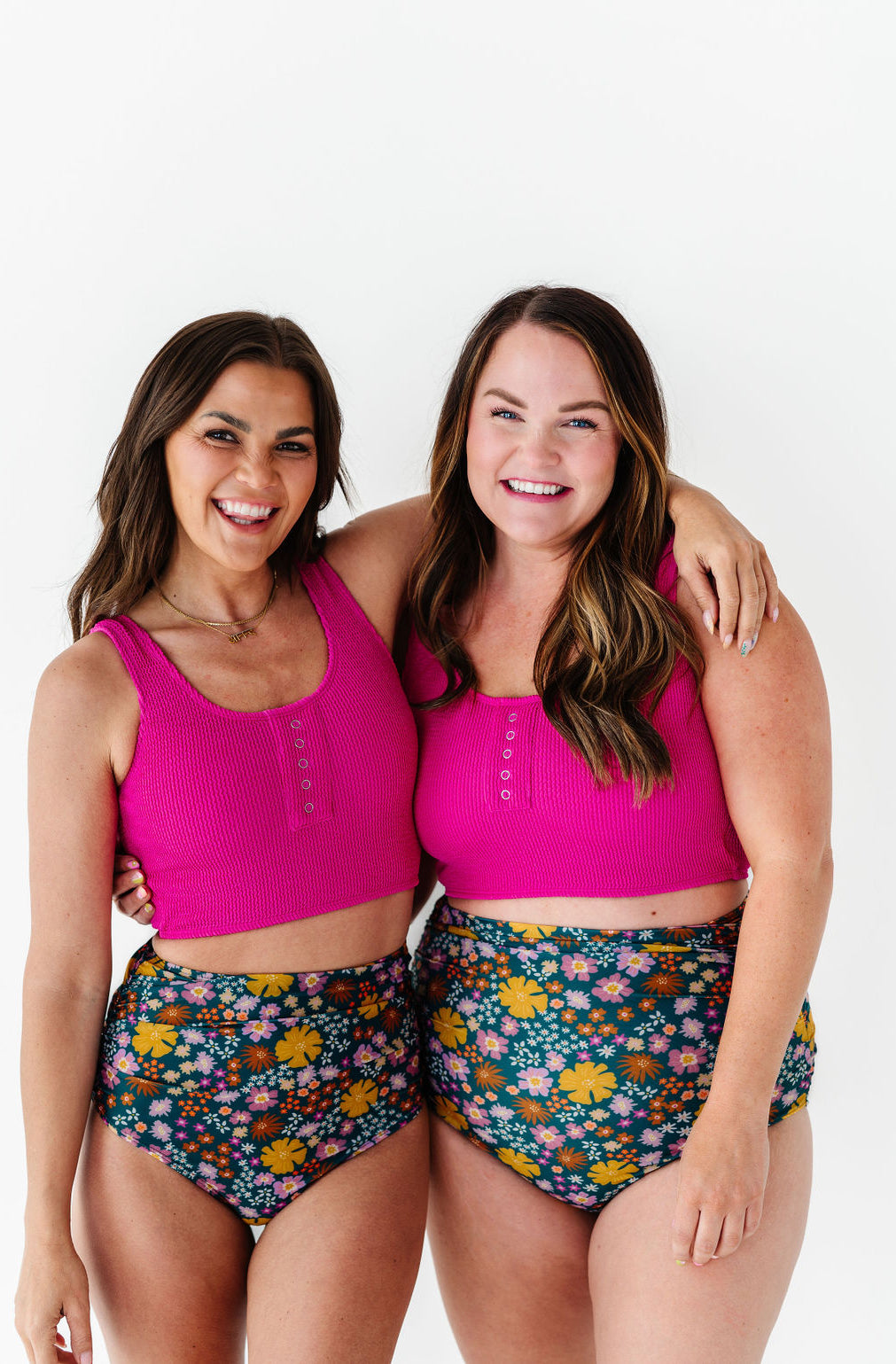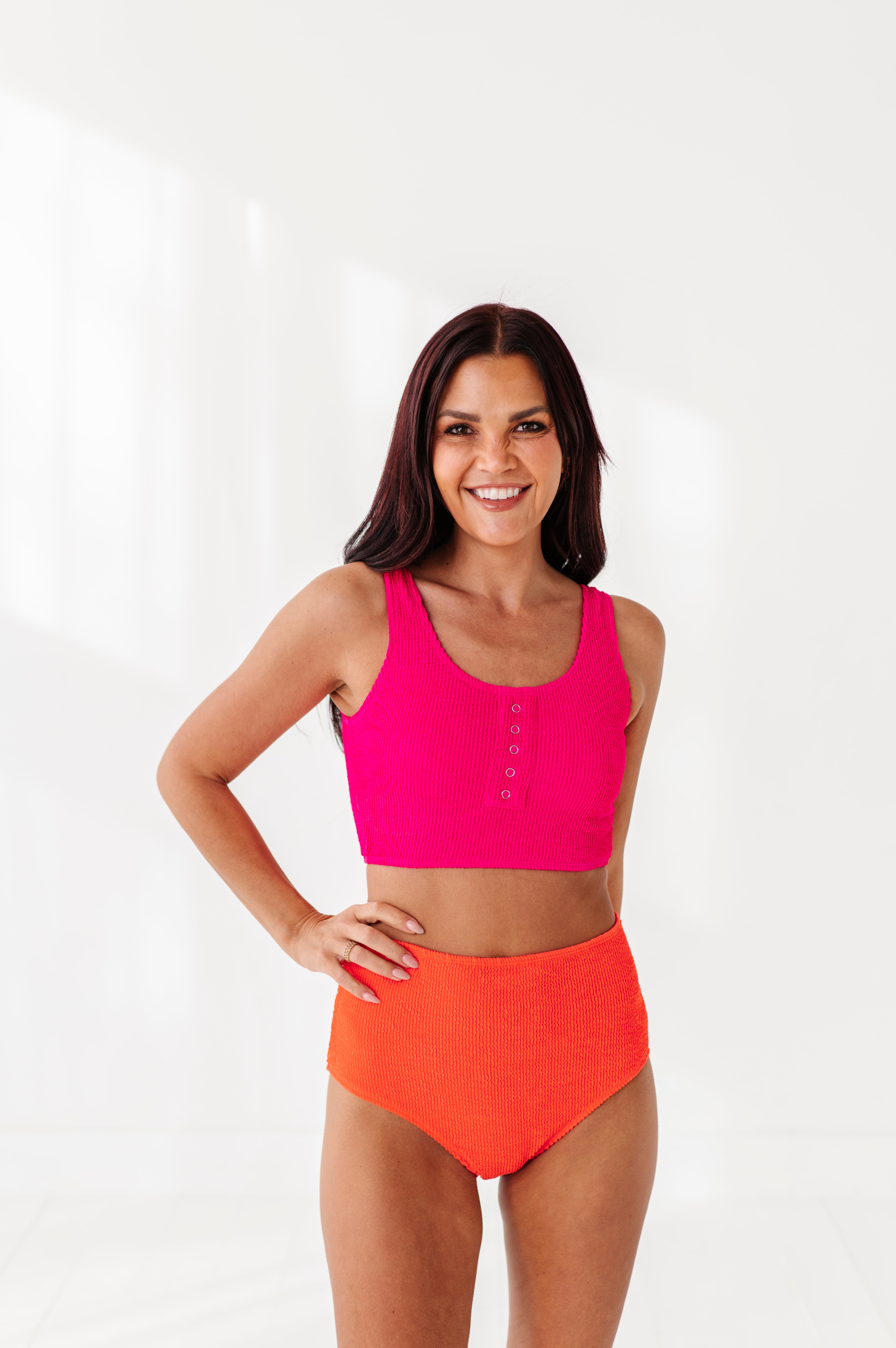 Beautiful vibrant colors. True to size. I have a short torso so with the high waisted bottoms my entire midsection is covered. I absolutely live this suit.It's very comfortable and modest.