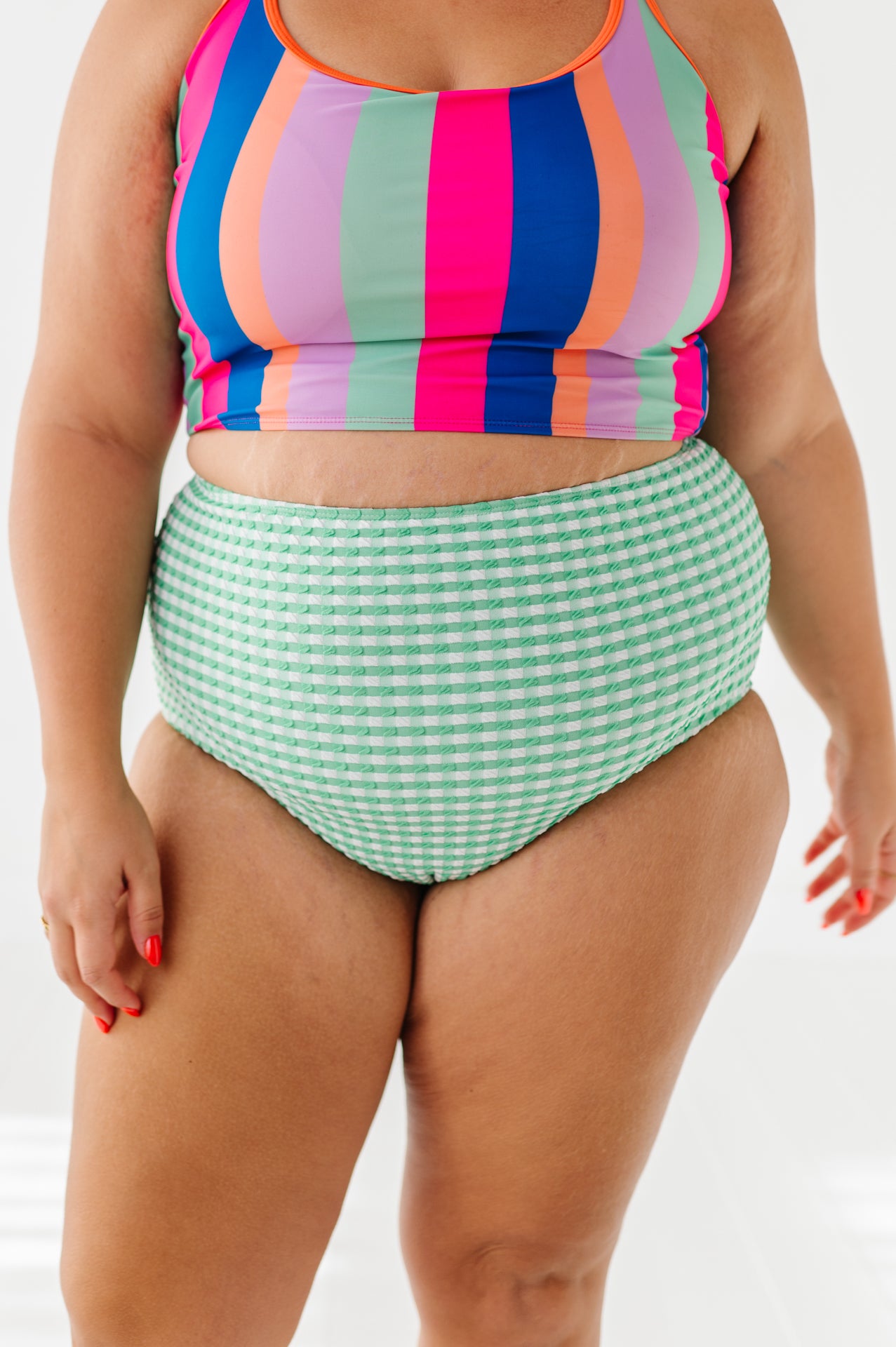 Love the pattern and material on these swim suit bottoms! I bought the bottoms with the matching cropped swim top and the pair is so so cute!! I also love the full coverage, I never had to worry about digging out a wedgie with these bottoms!