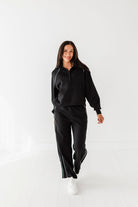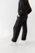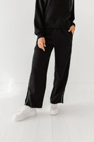 - Straight leg pants with elastic waistband and side pockets with zipper closure