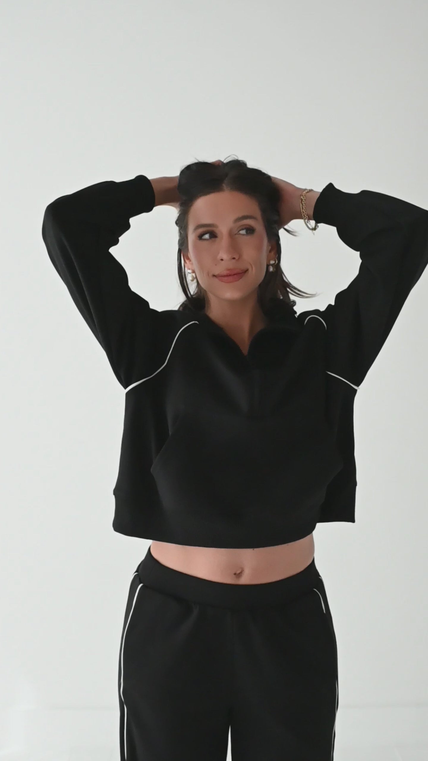 - Long sleeve top with mock neck, half zipper closure and front pocket