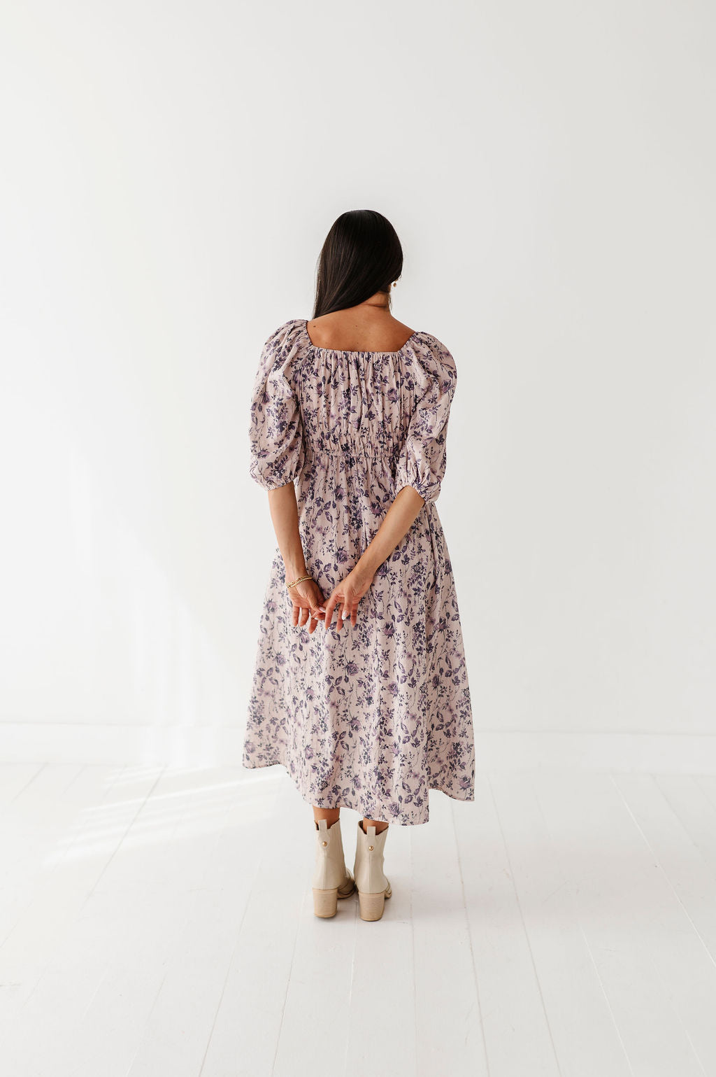 - 3/4 length puff sleeves with elastic cuff