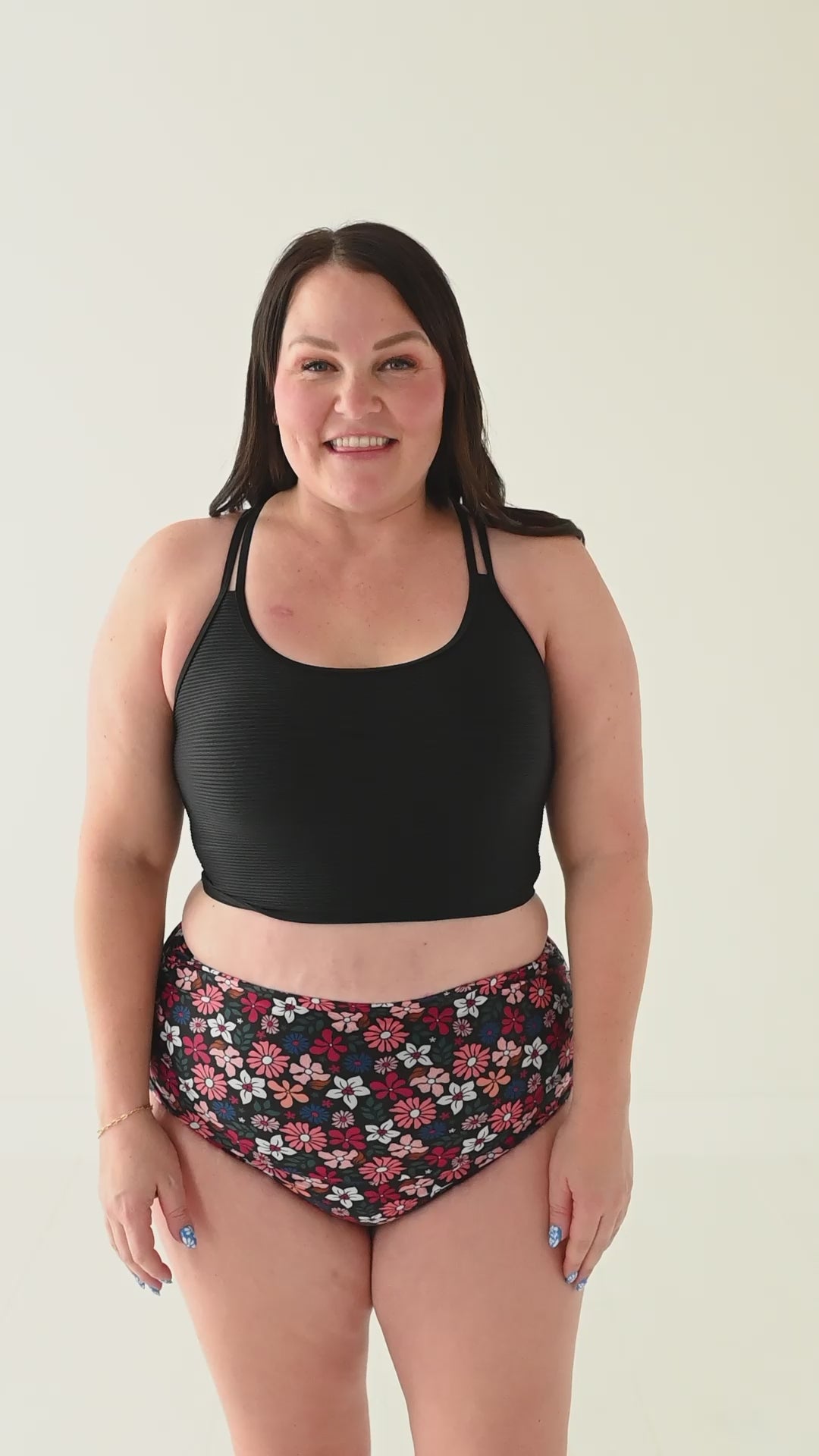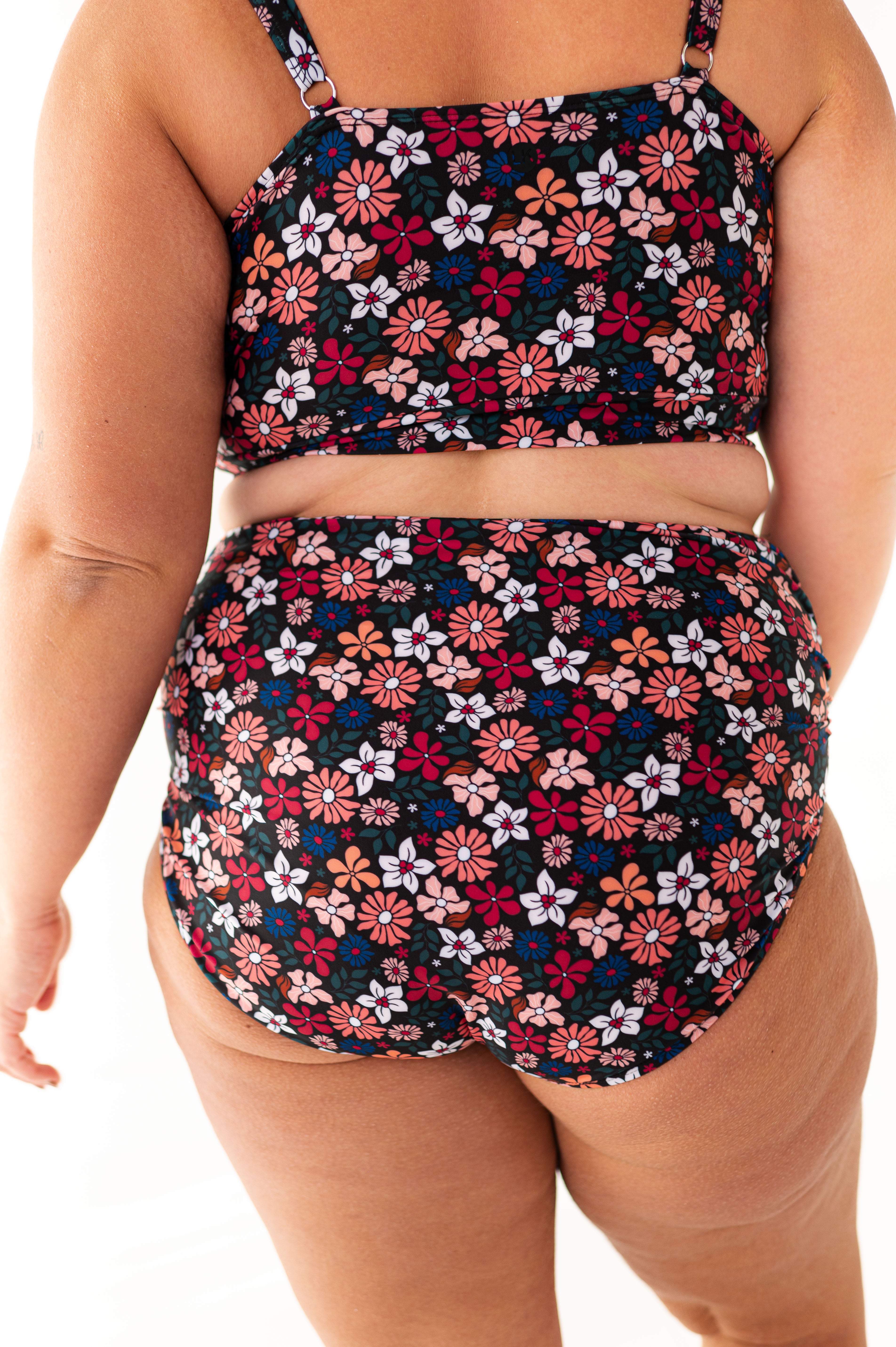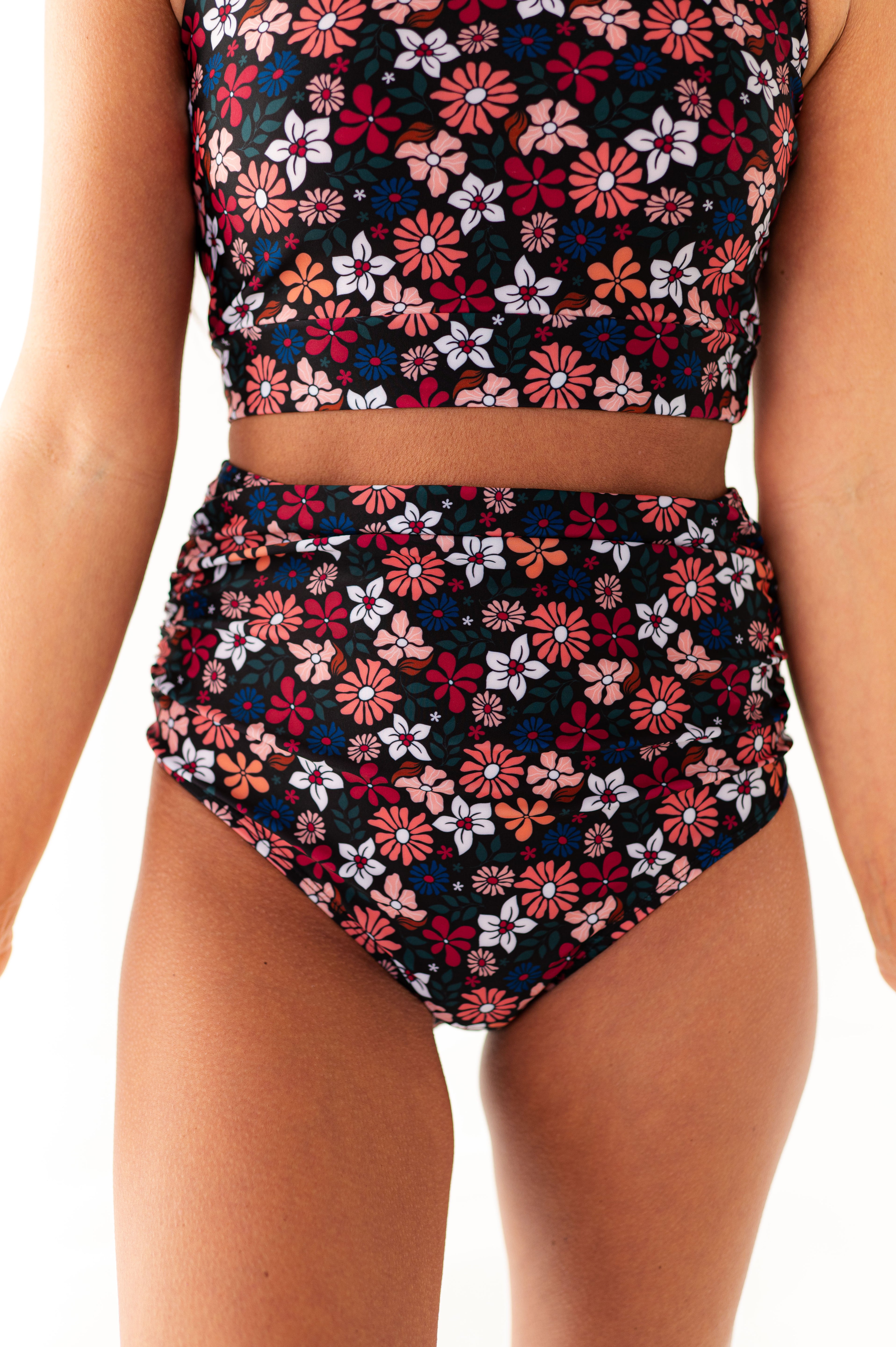 Basic Beach Mid Rise Ruched Bottoms in Midnight Floral