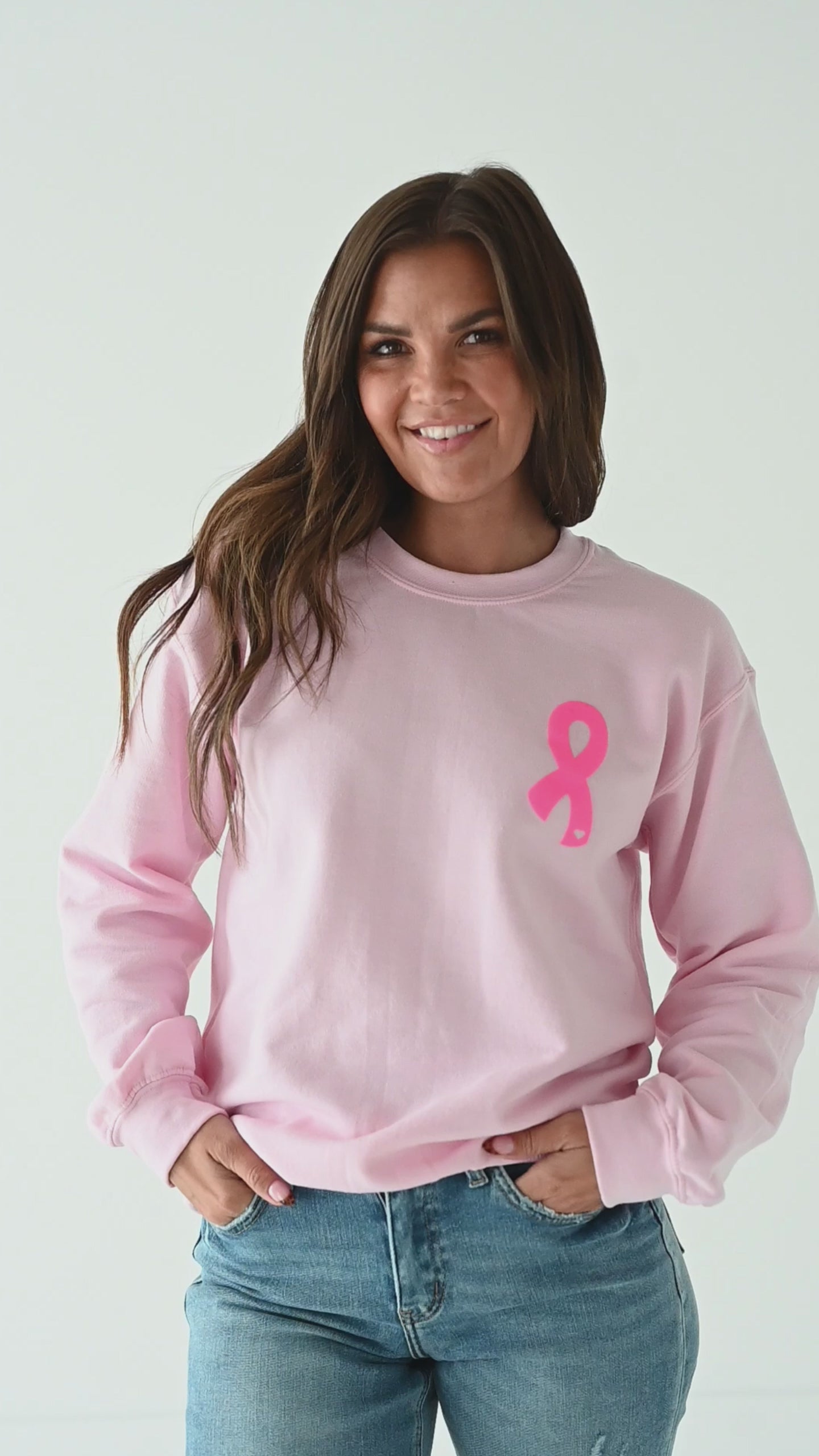 - Hot pink, Breast Cancer Ribbon graphic on front upper left chest