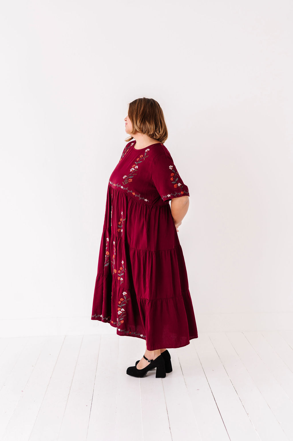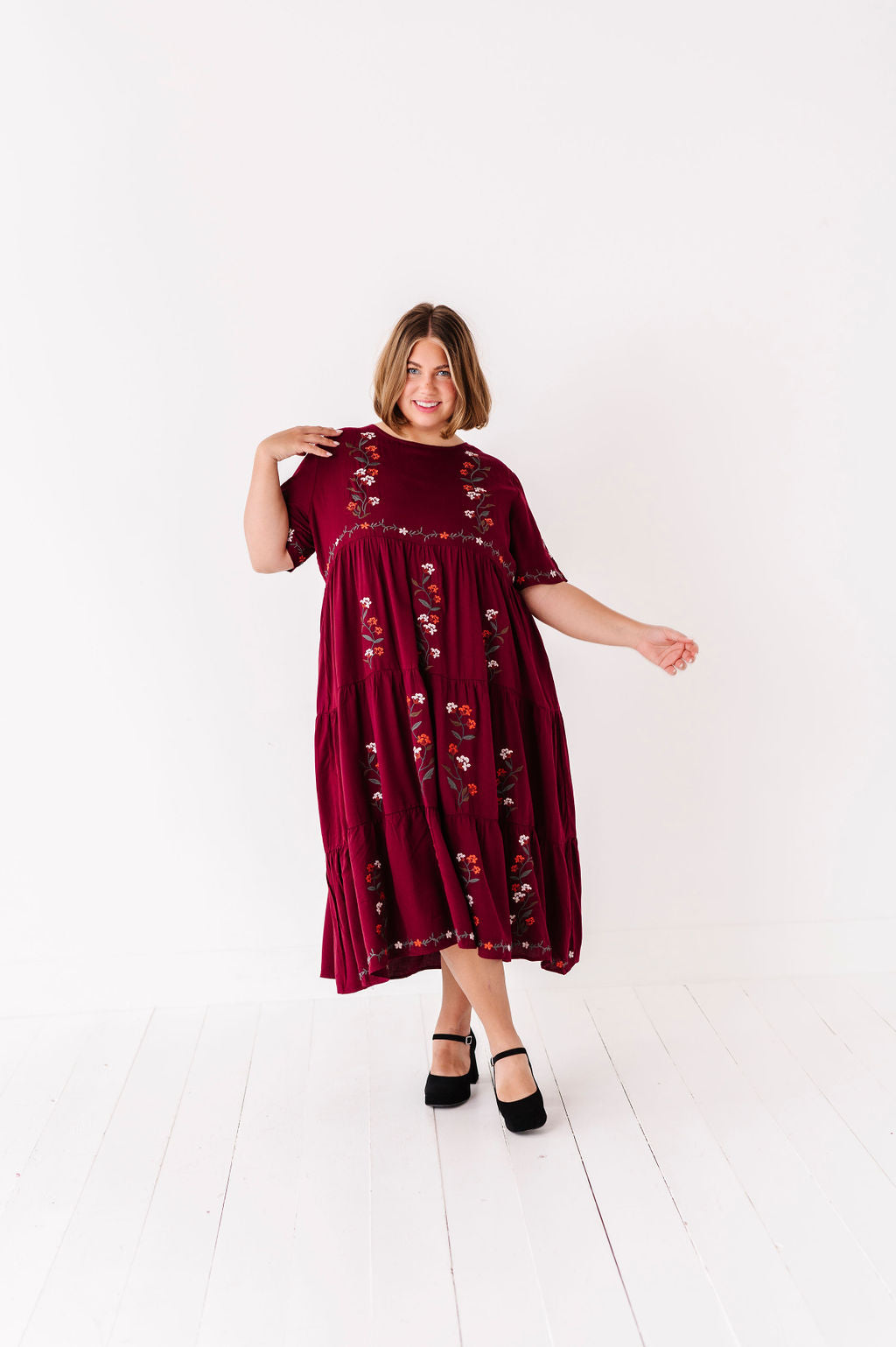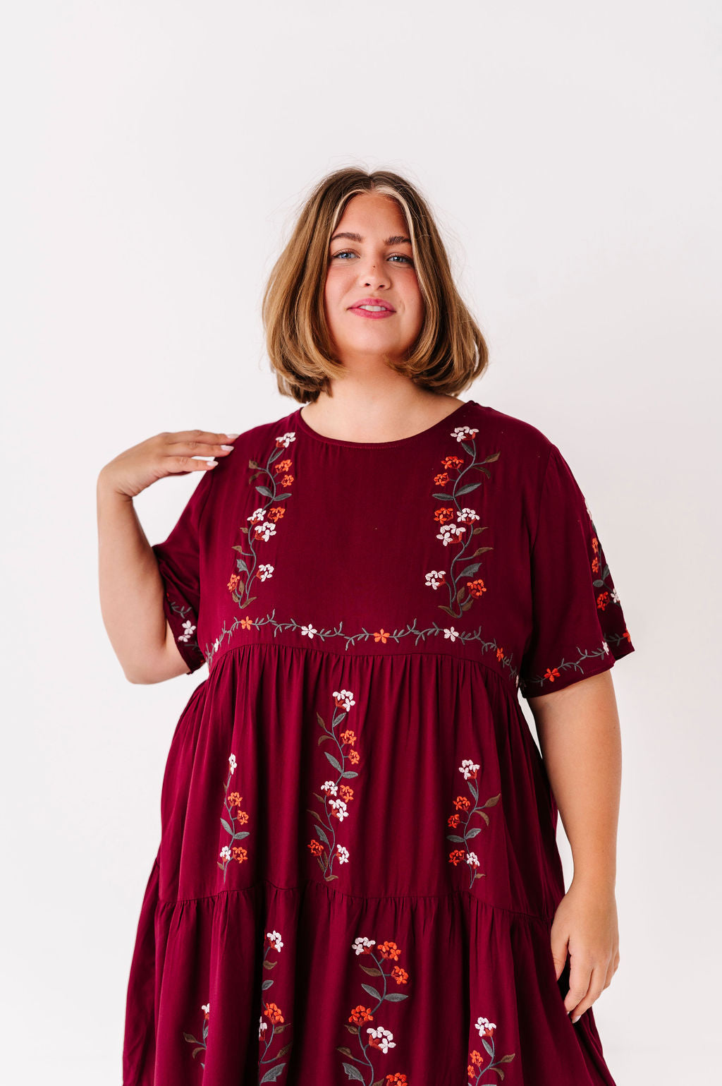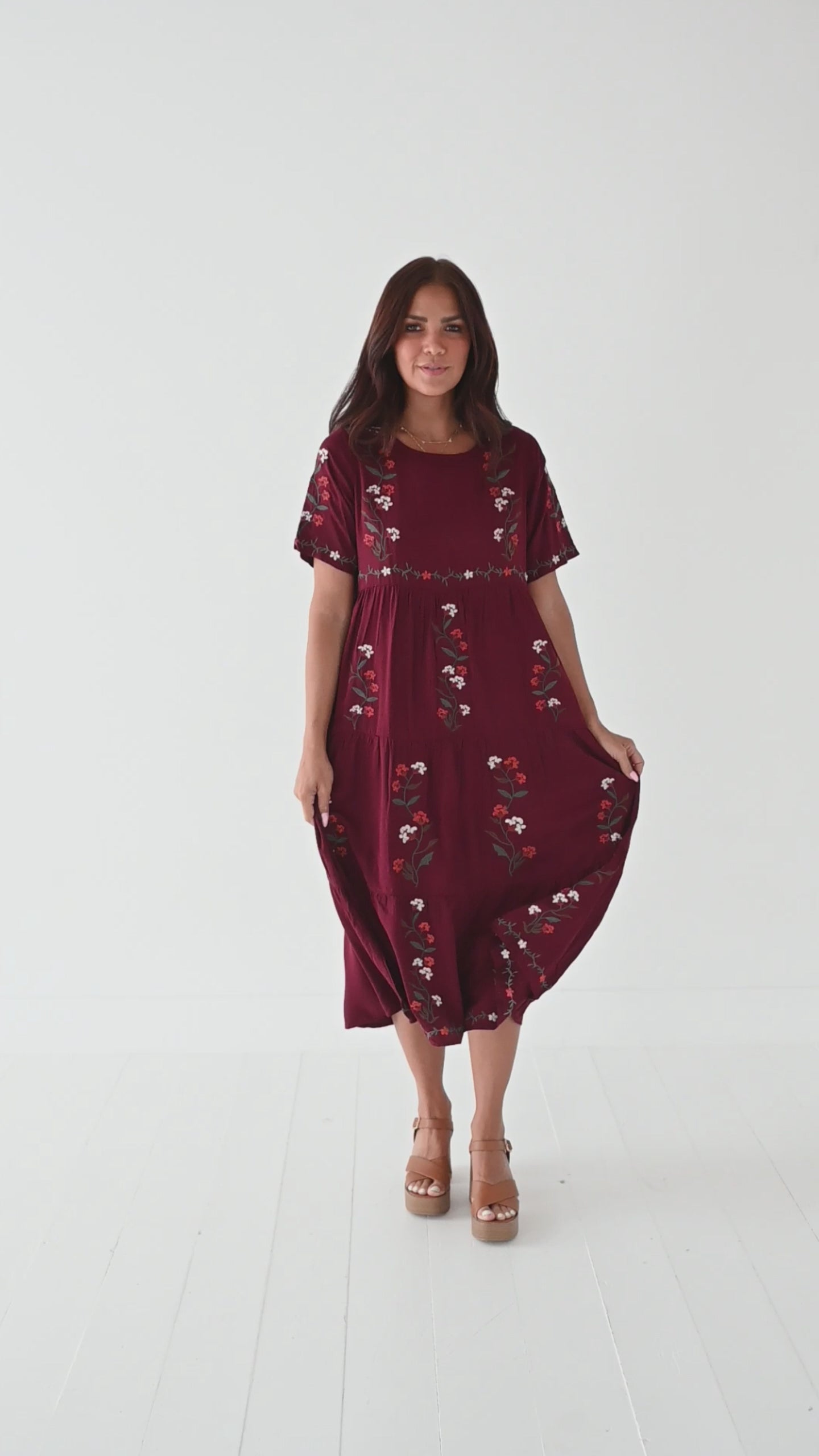 • Plum color with olive, sage, maroon, bright rust and cream floral embroidered details