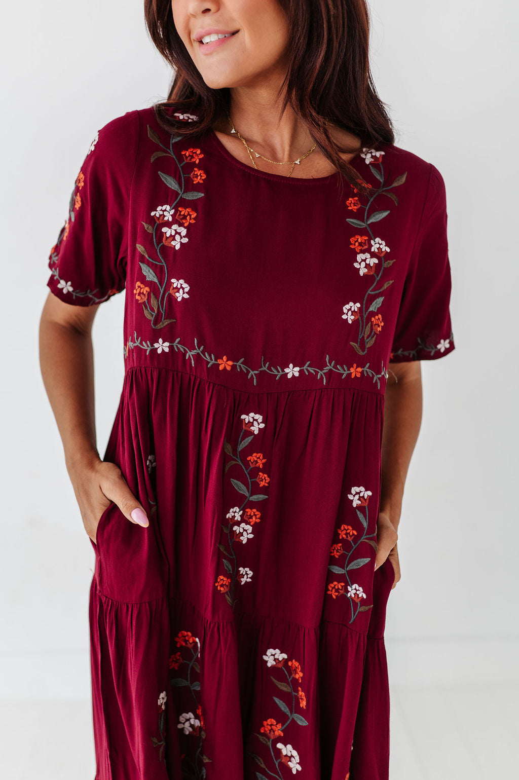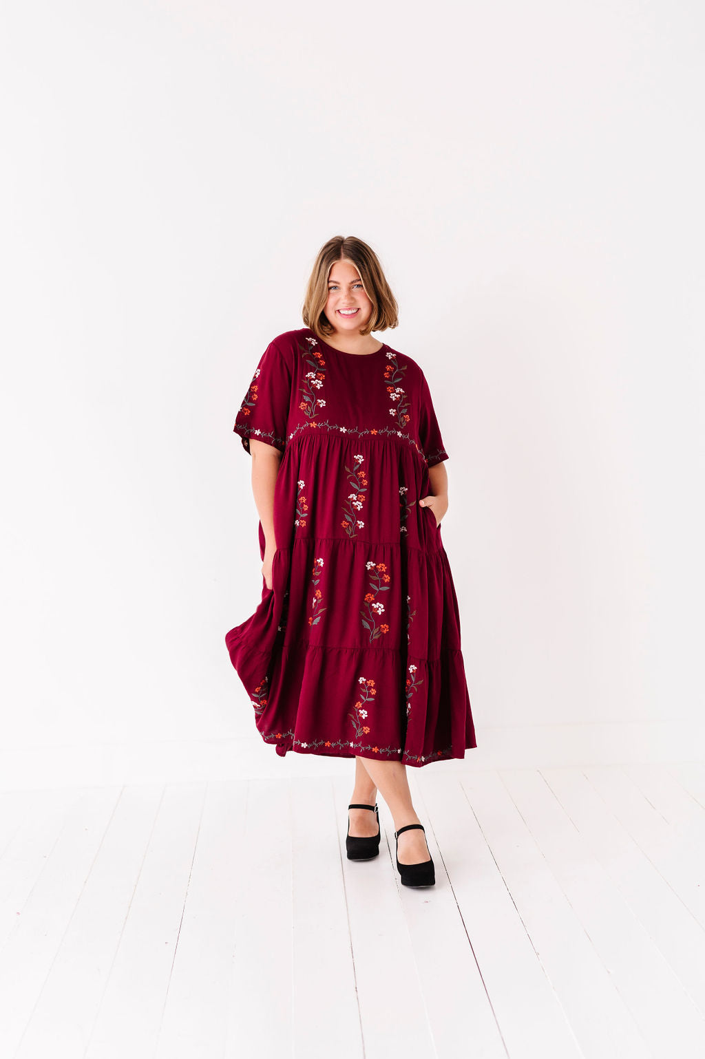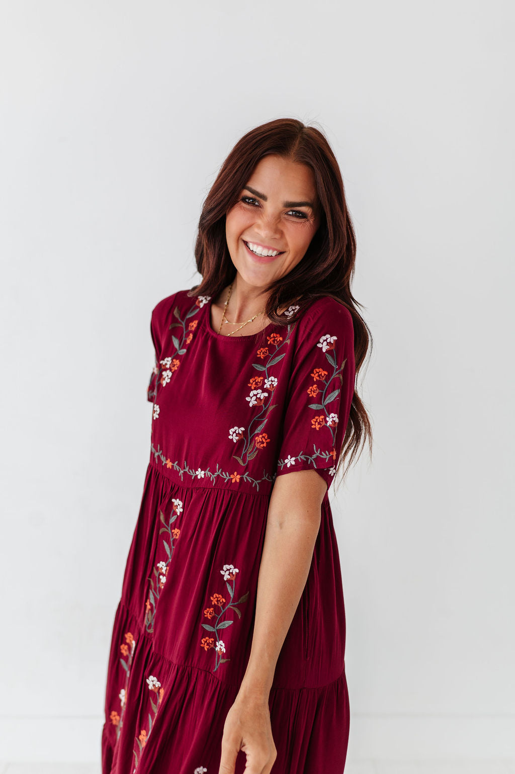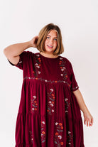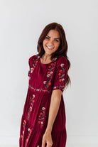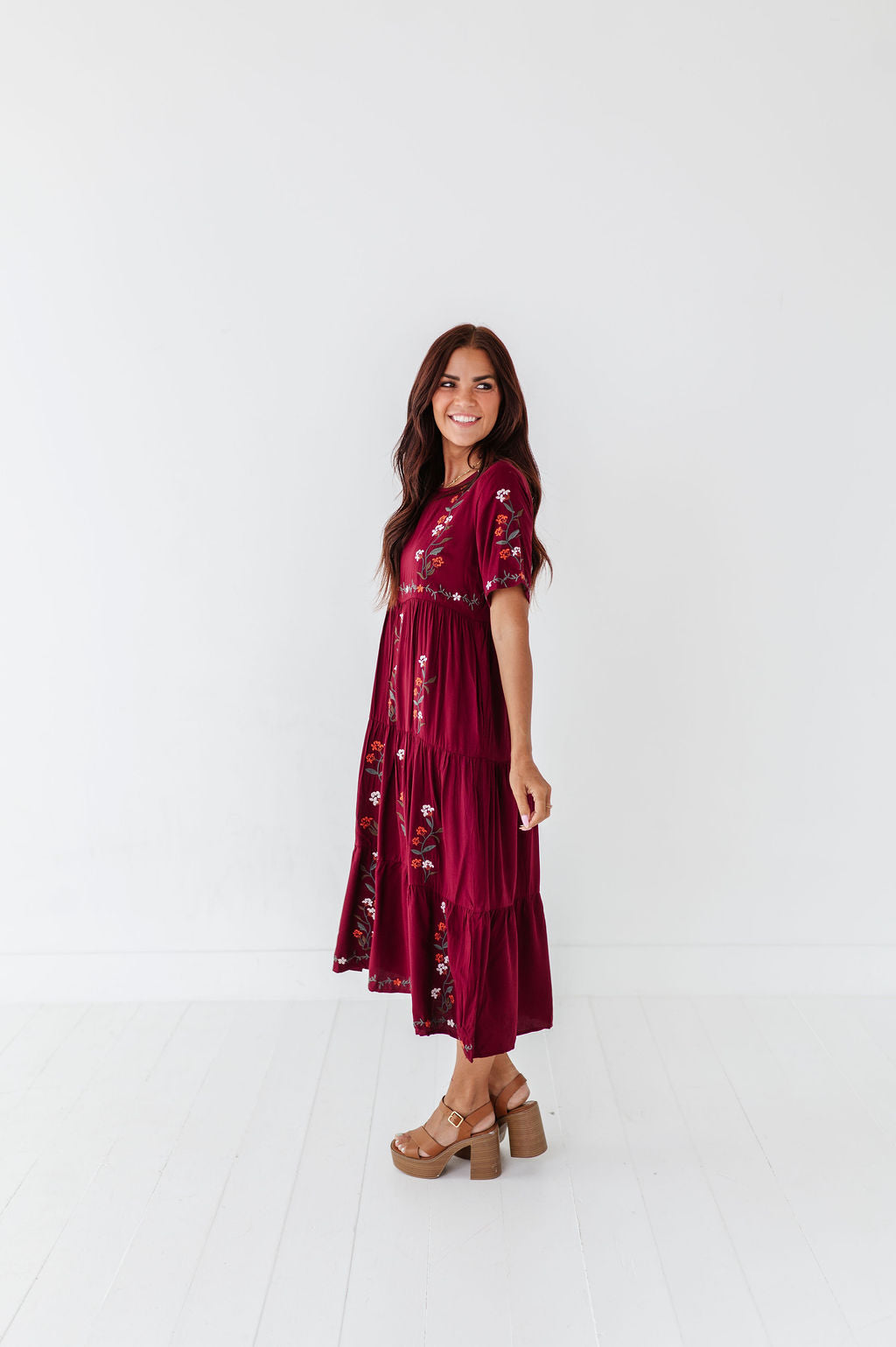 • Plum color with olive, sage, maroon, bright rust and cream floral embroidered details