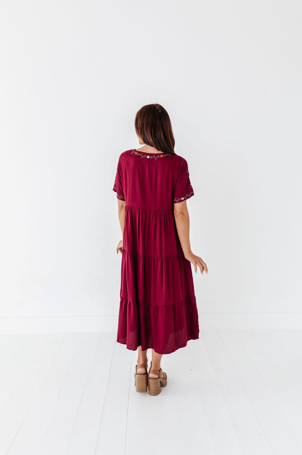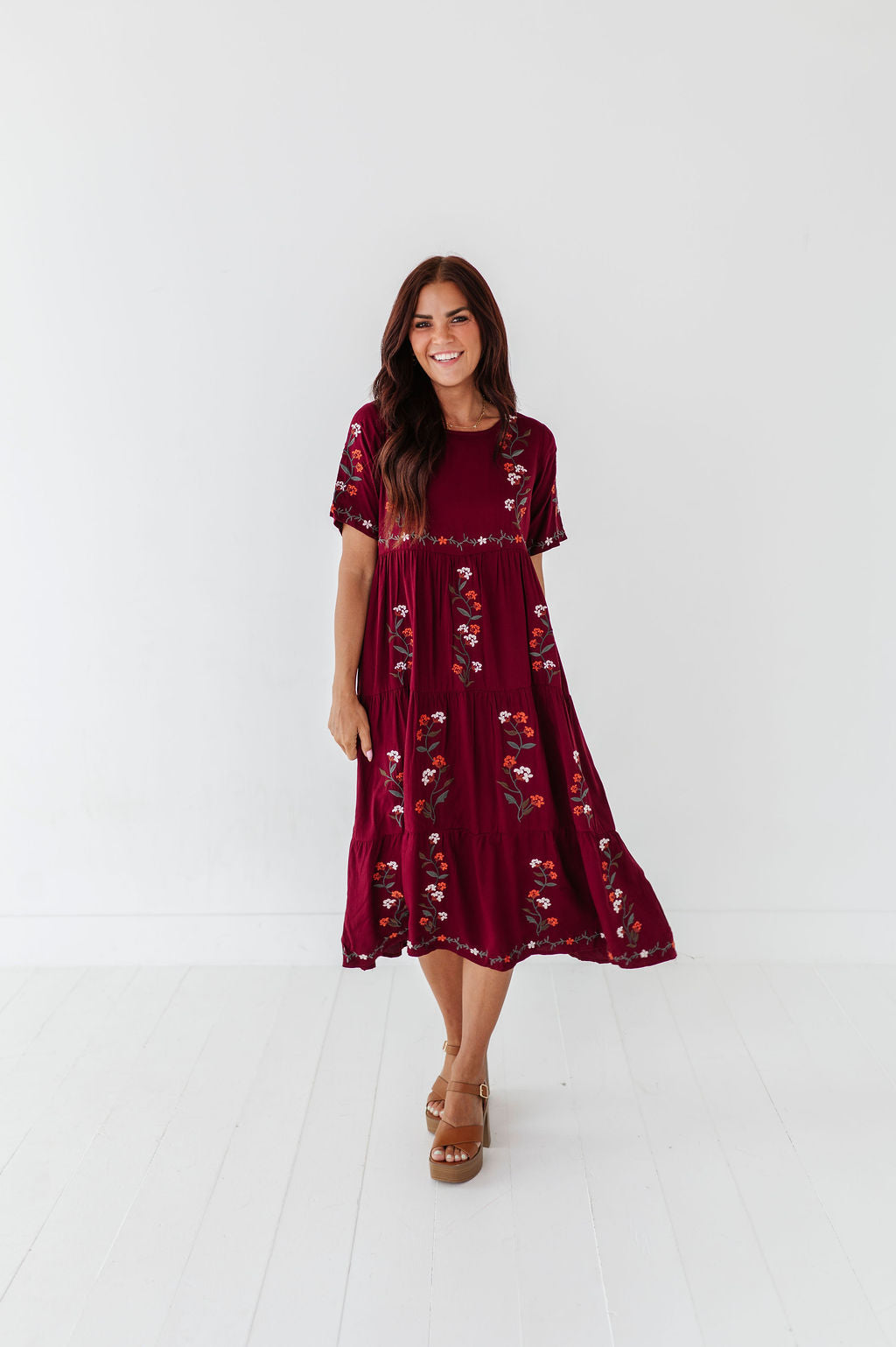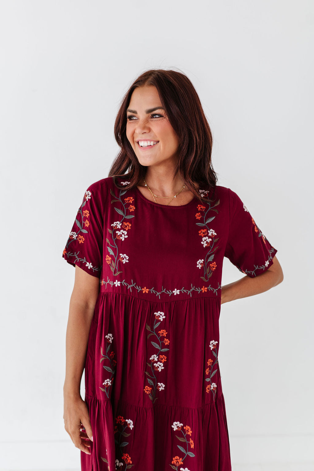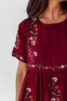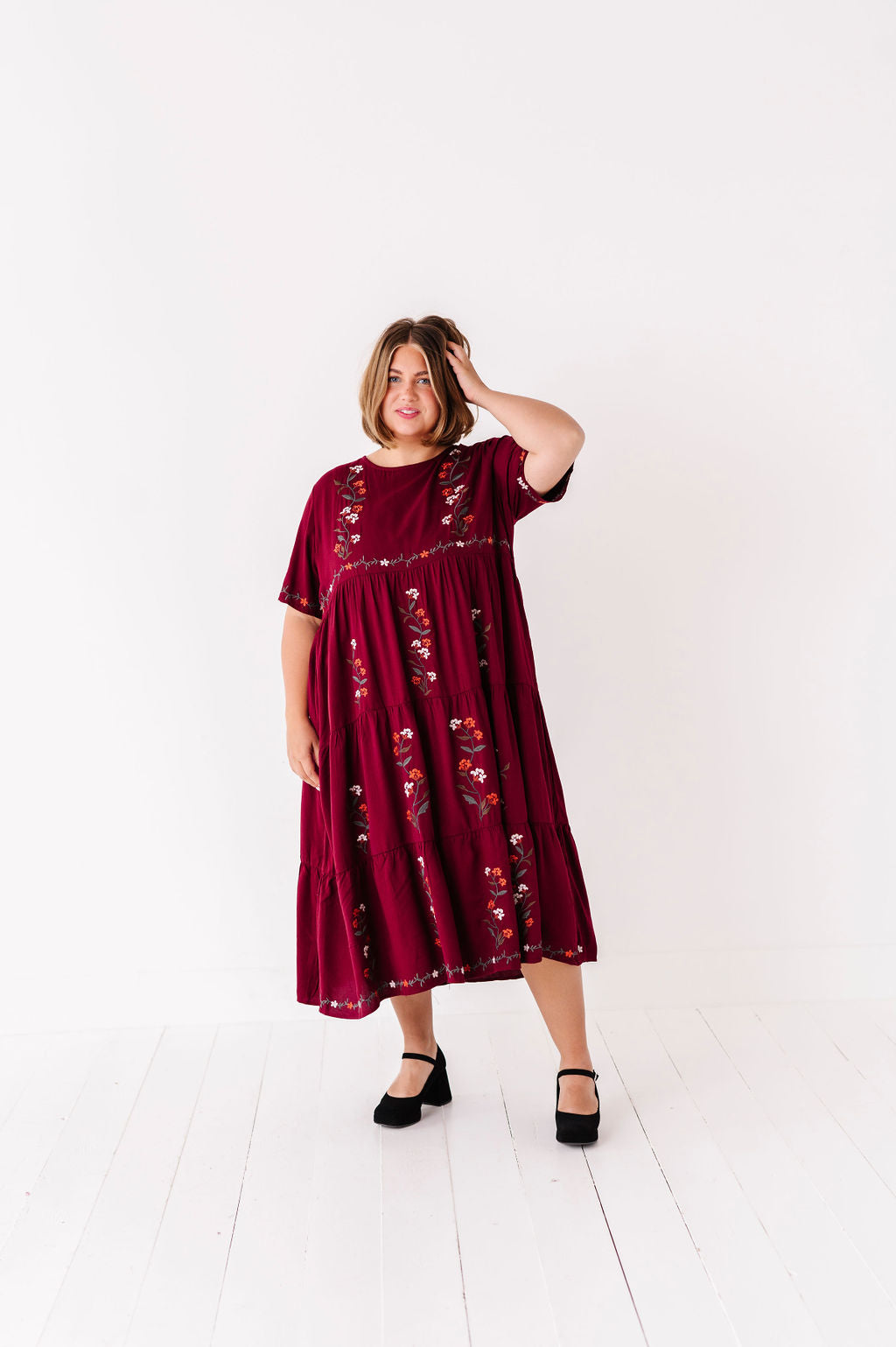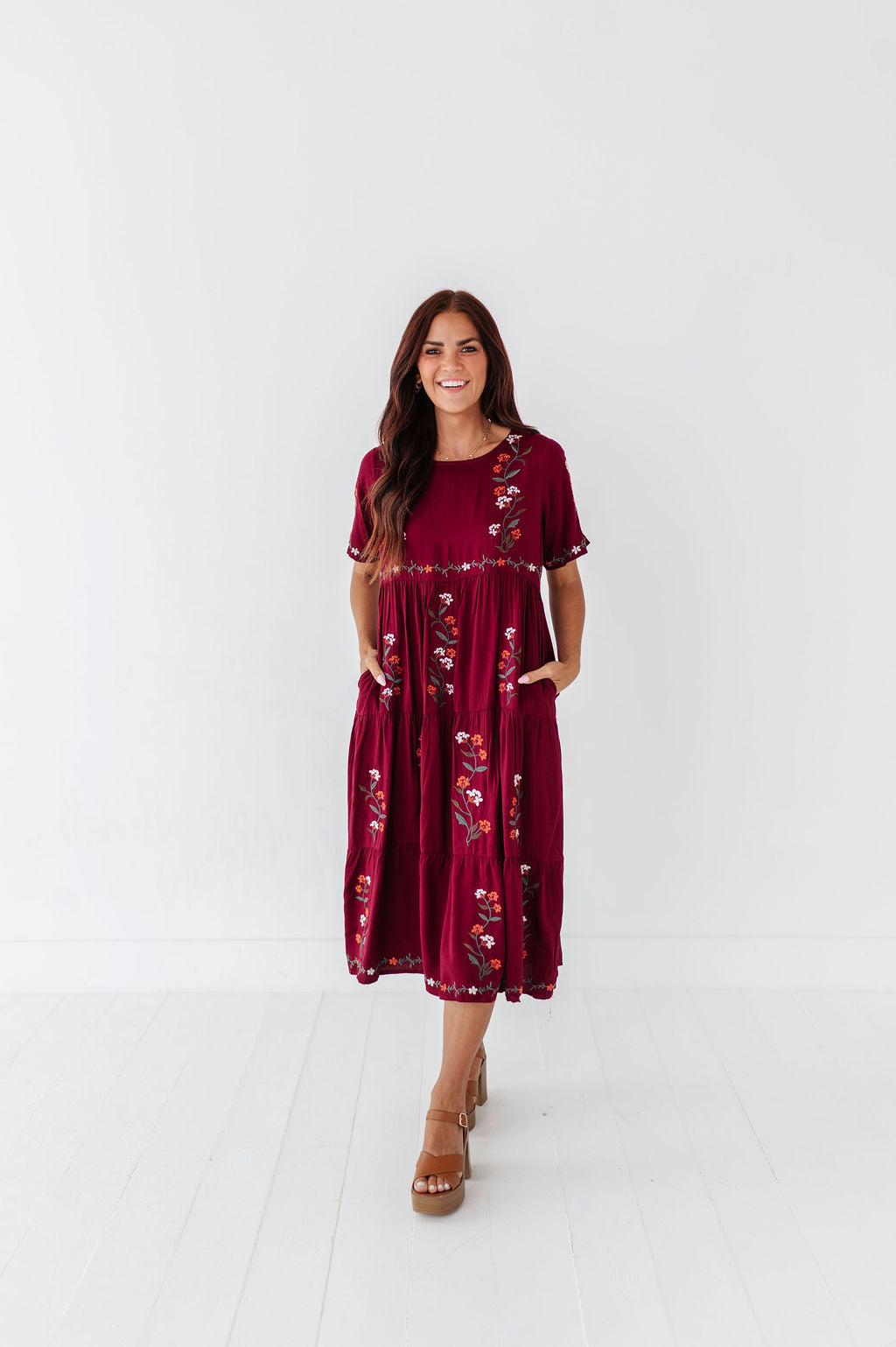 • Plum color with olive, sage, maroon, bright rust and cream floral embroidered details