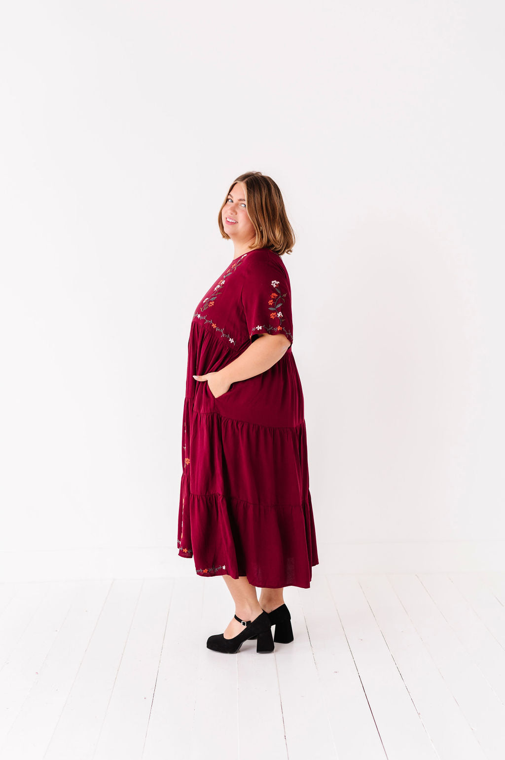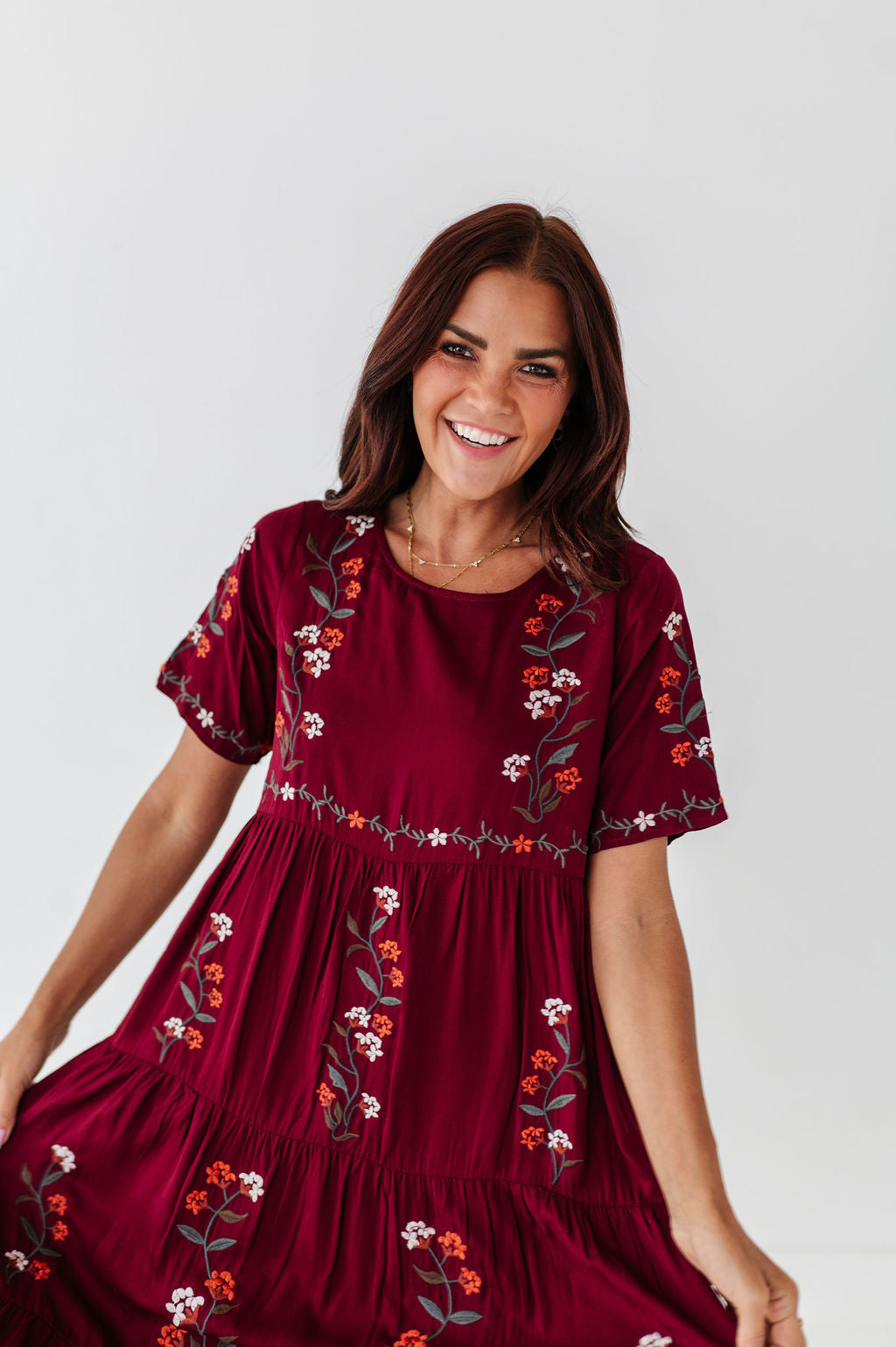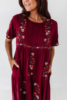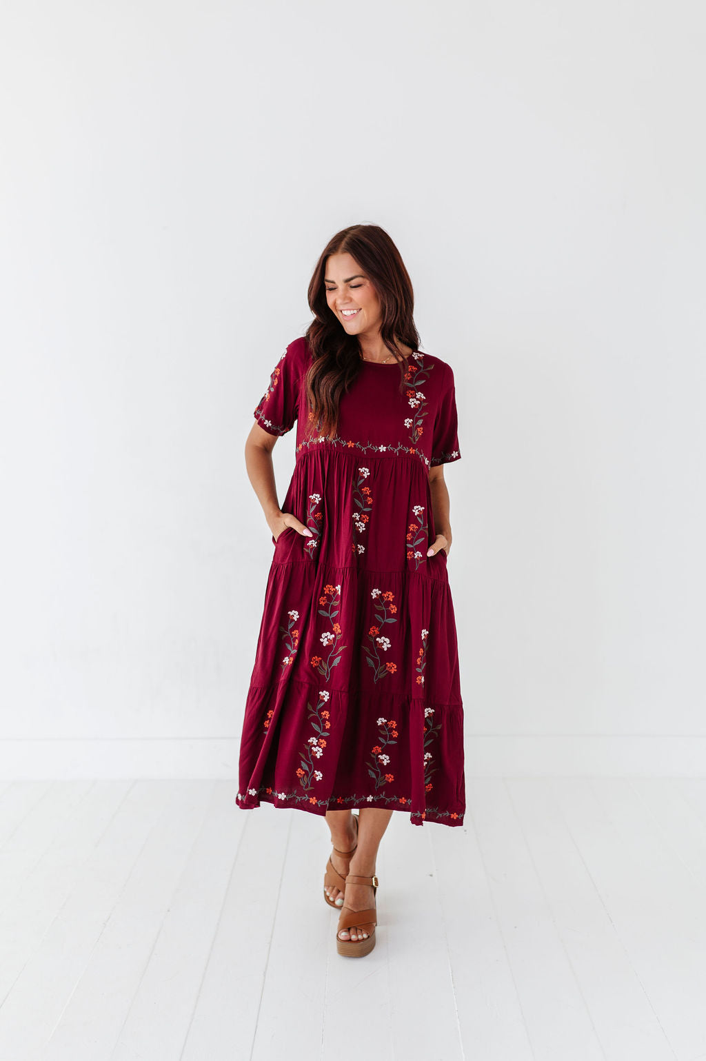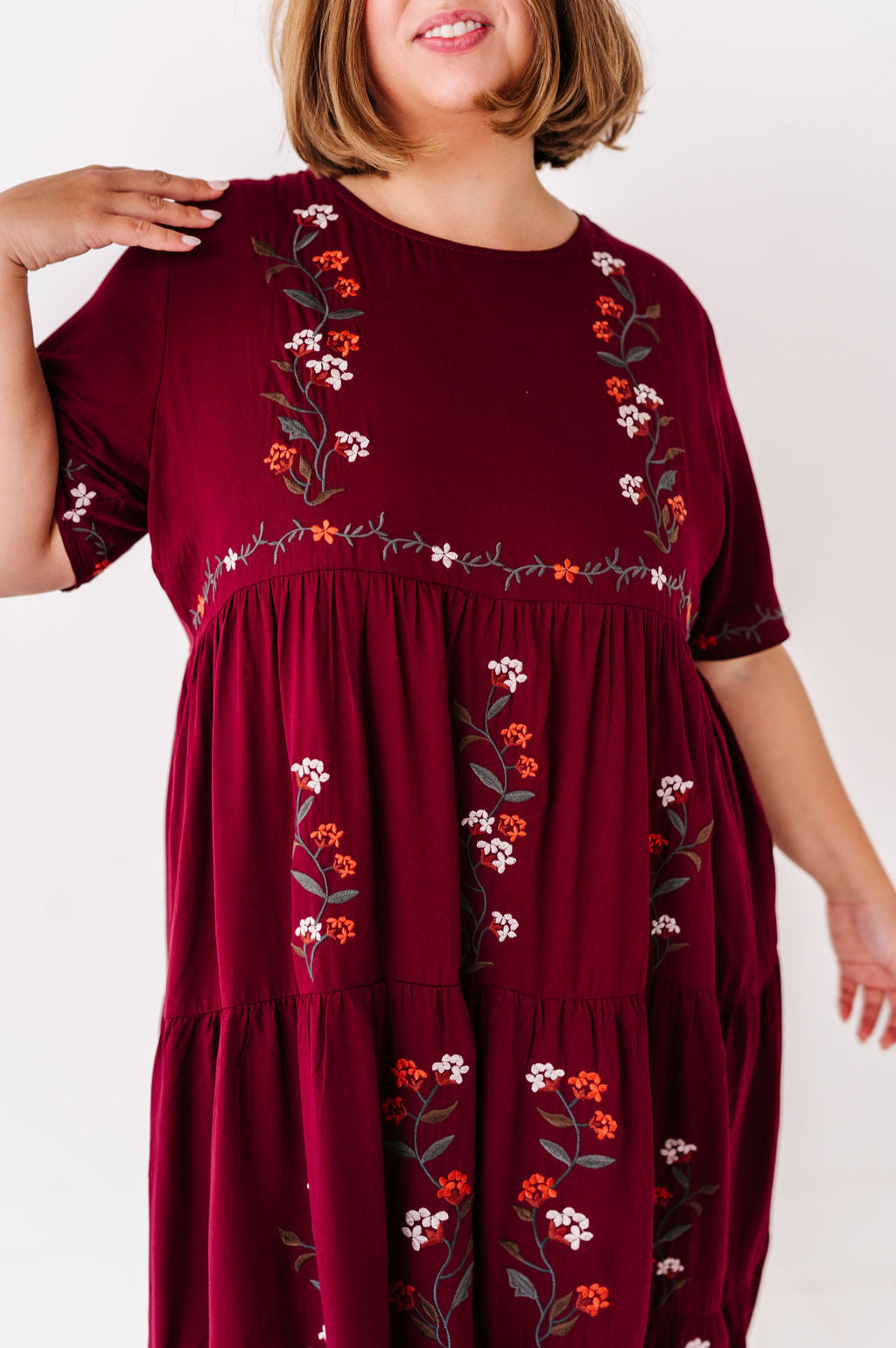 • Plum color with olive, sage, maroon, bright rust and cream floral embroidered details