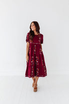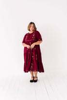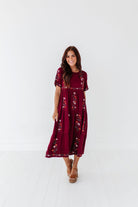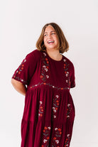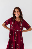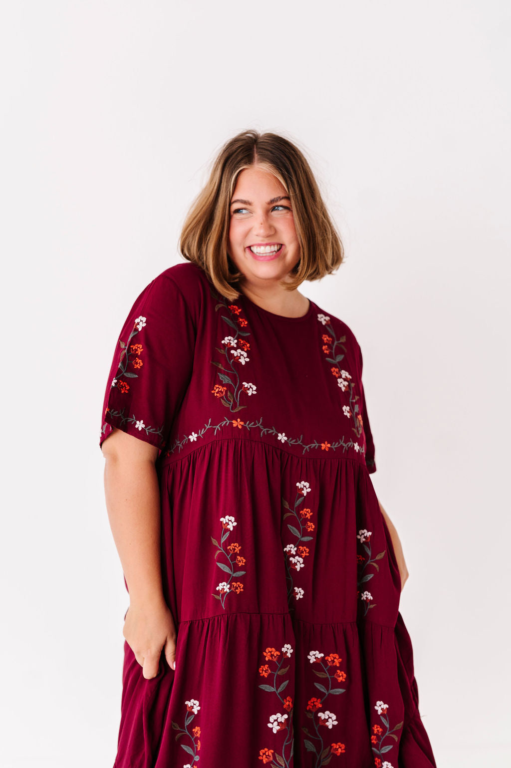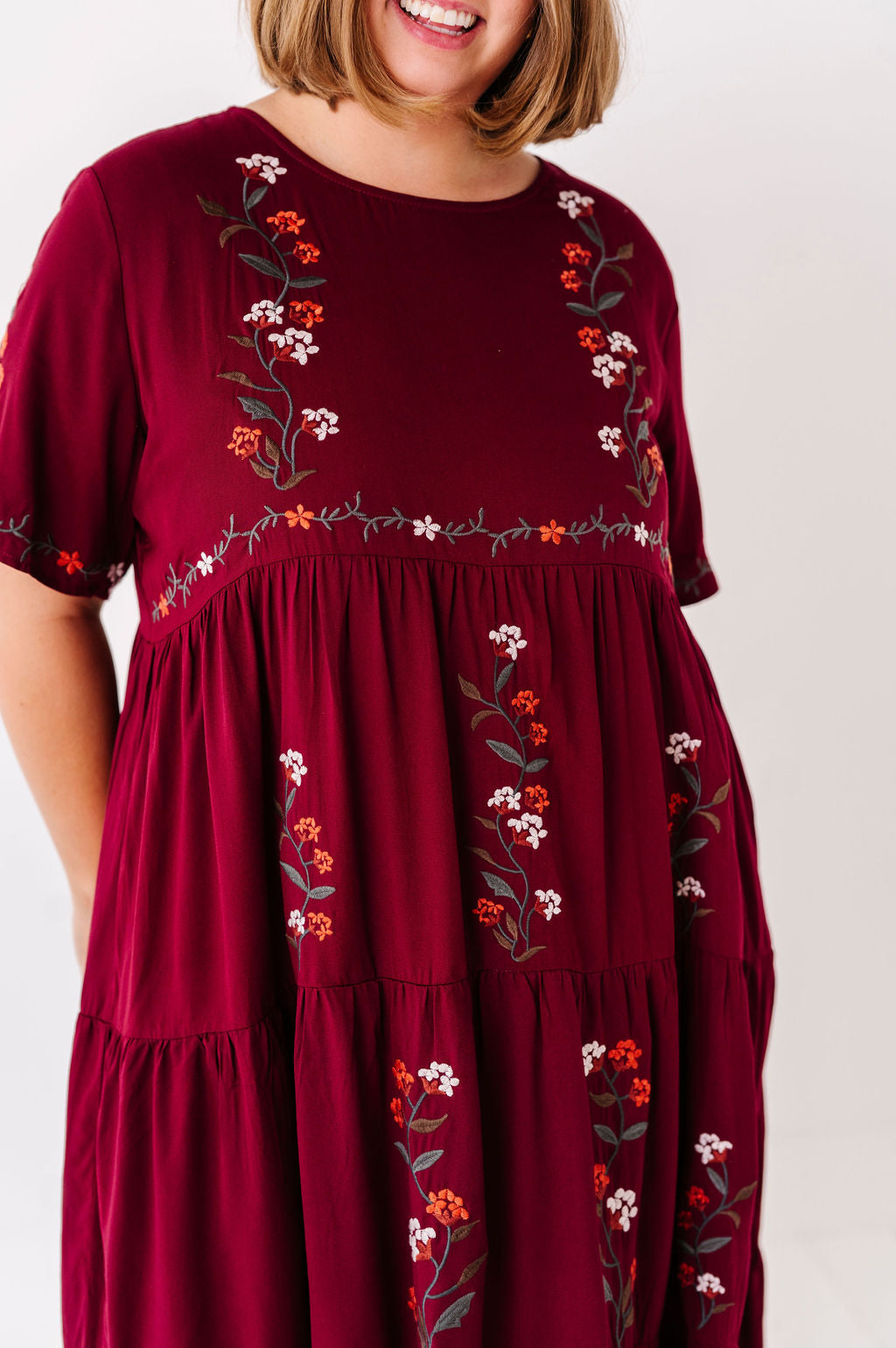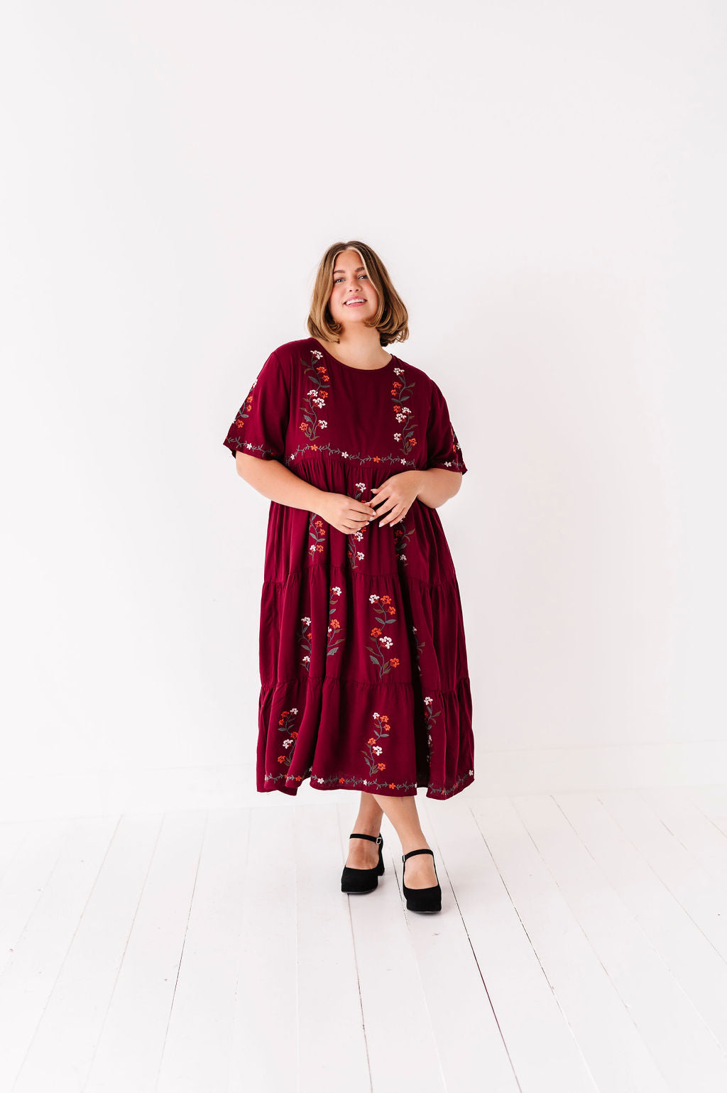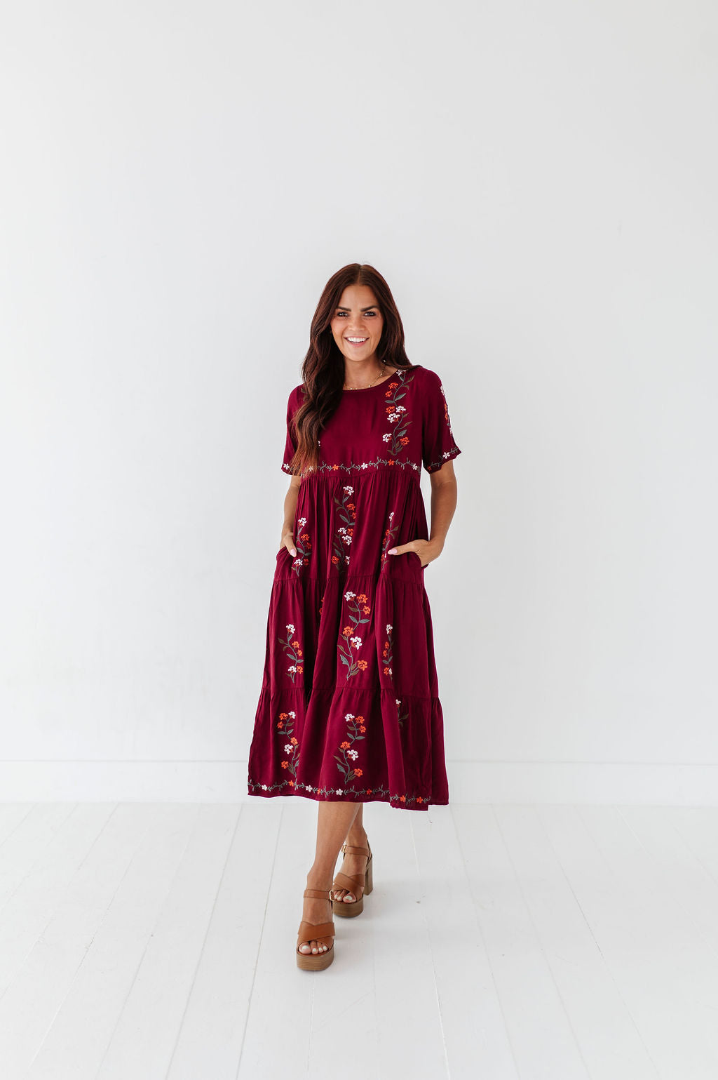 • Plum color with olive, sage, maroon, bright rust and cream floral embroidered details