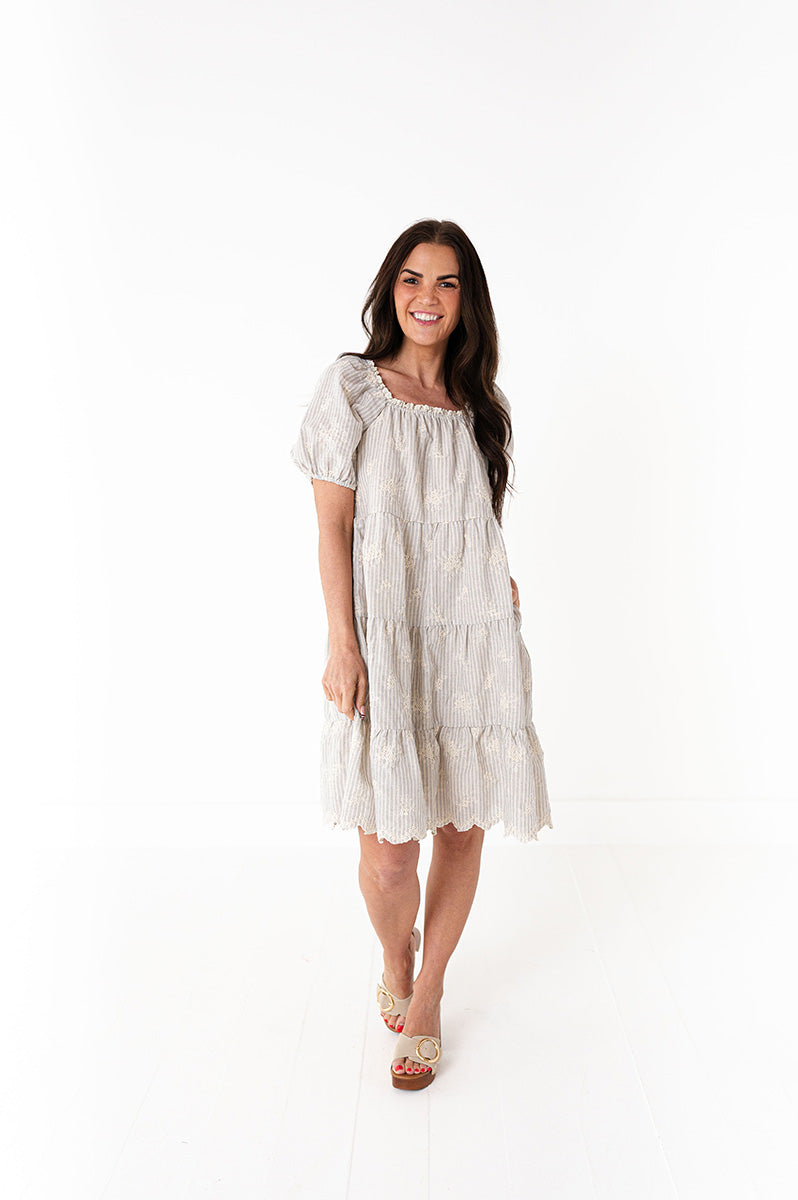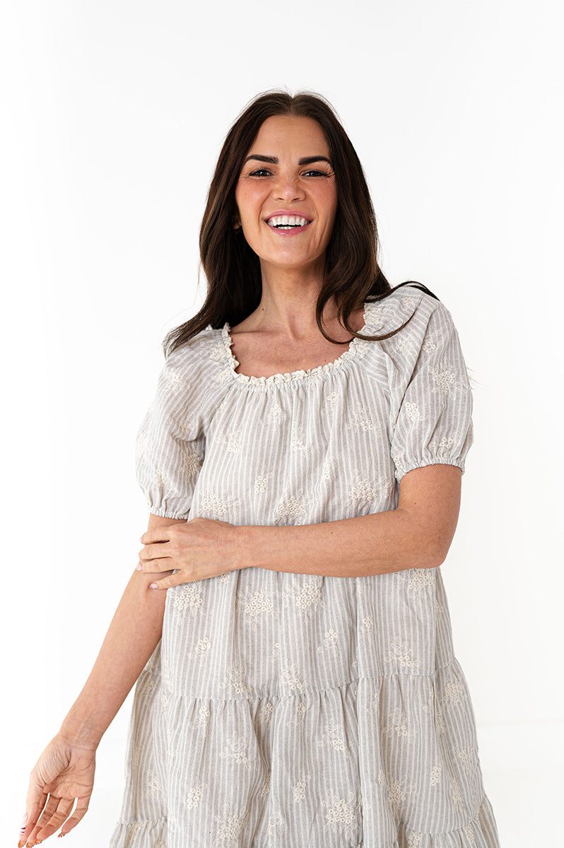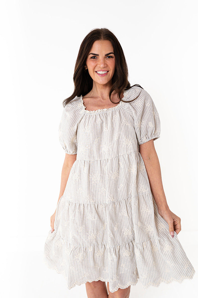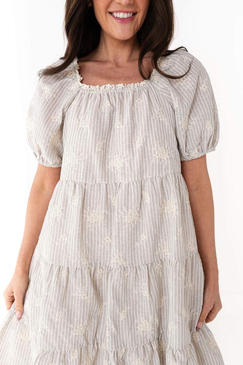 - Light gray-blue and white stripes with ivory embroidered detailing