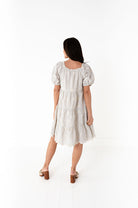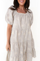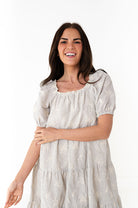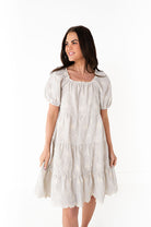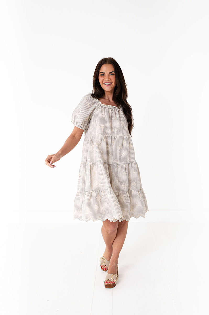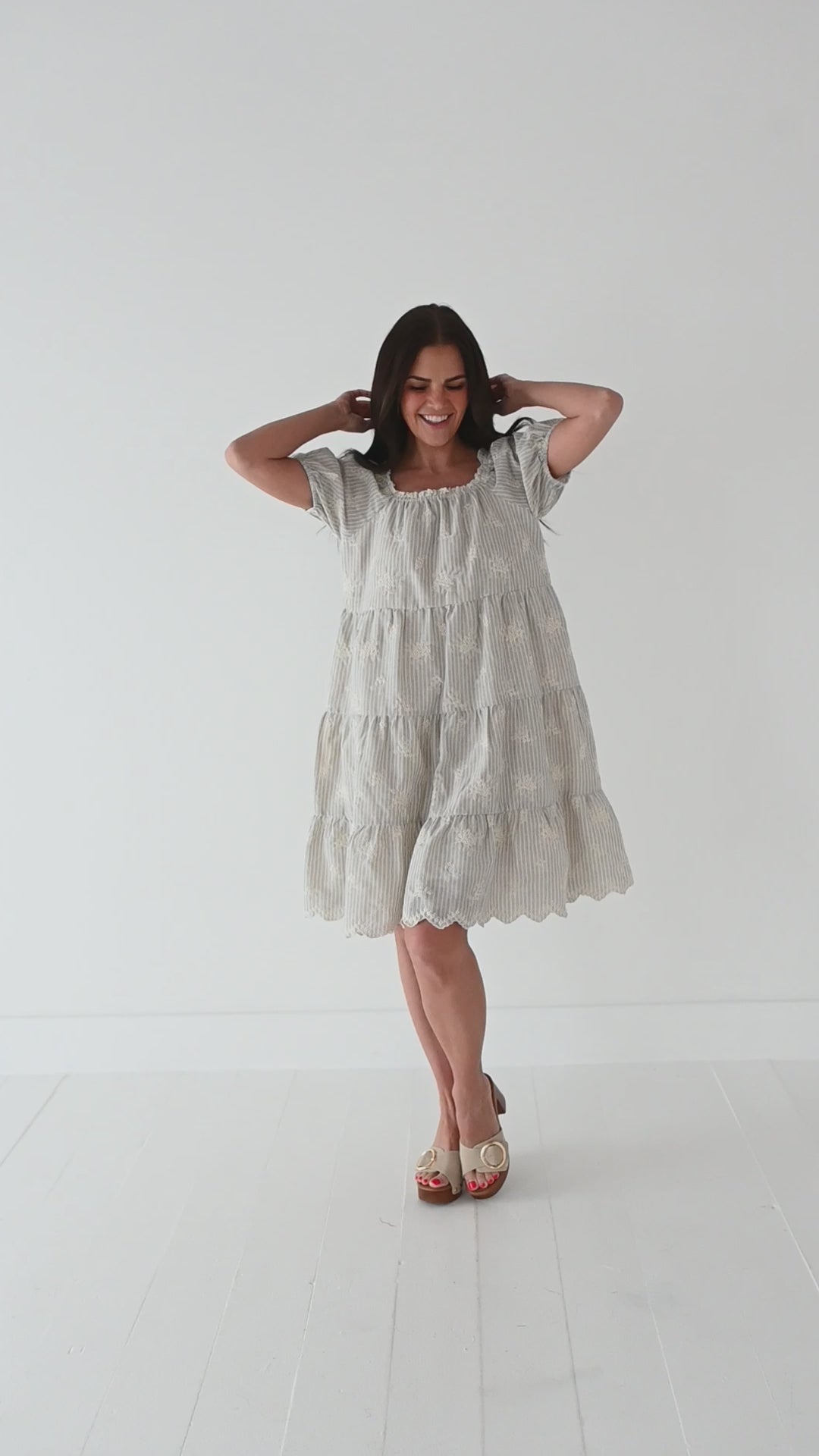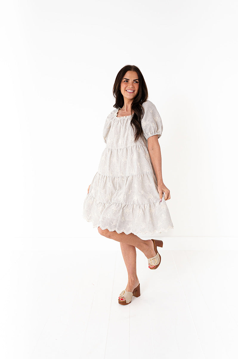 - Light gray-blue and white stripes with ivory embroidered detailing