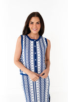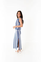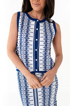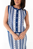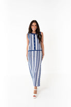 - White with cobalt blue geometric print
