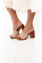 - Stone colored faux suede upper with brown heel
