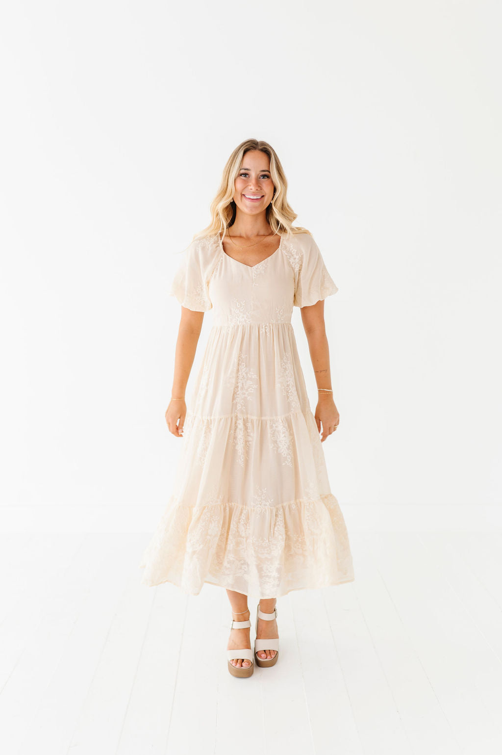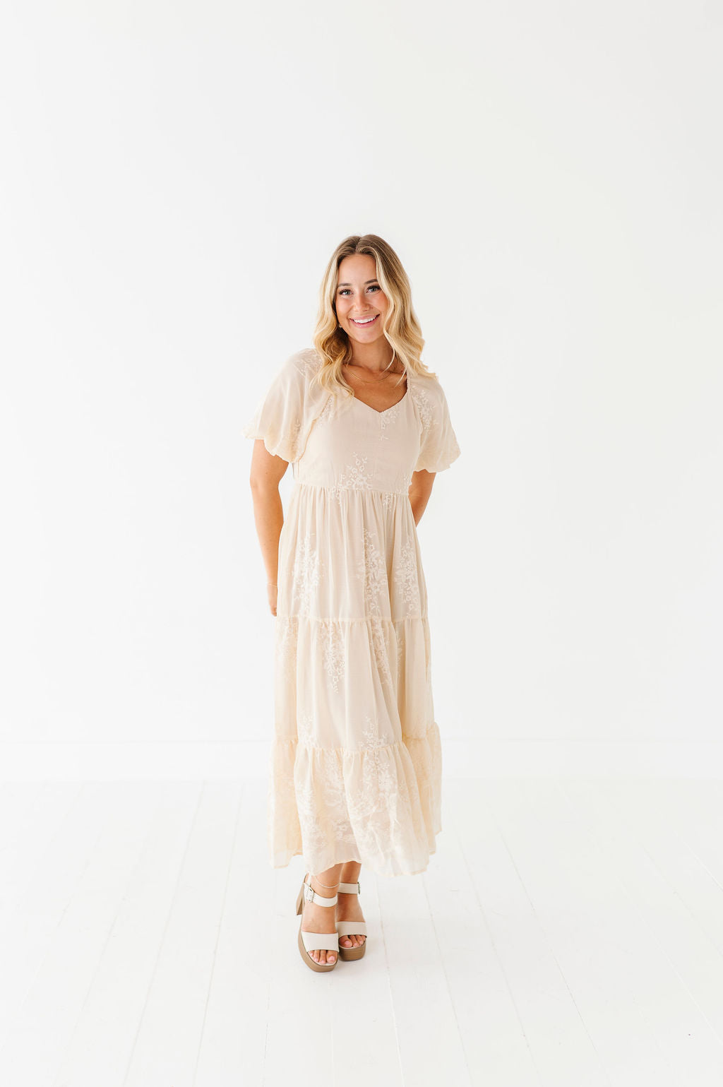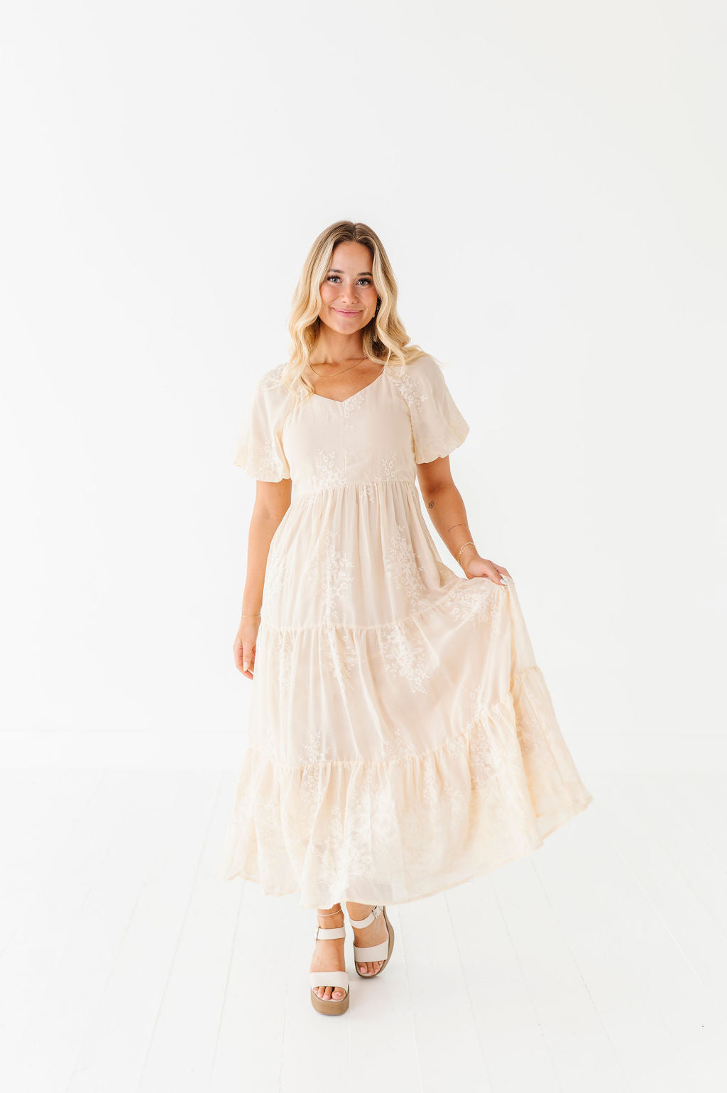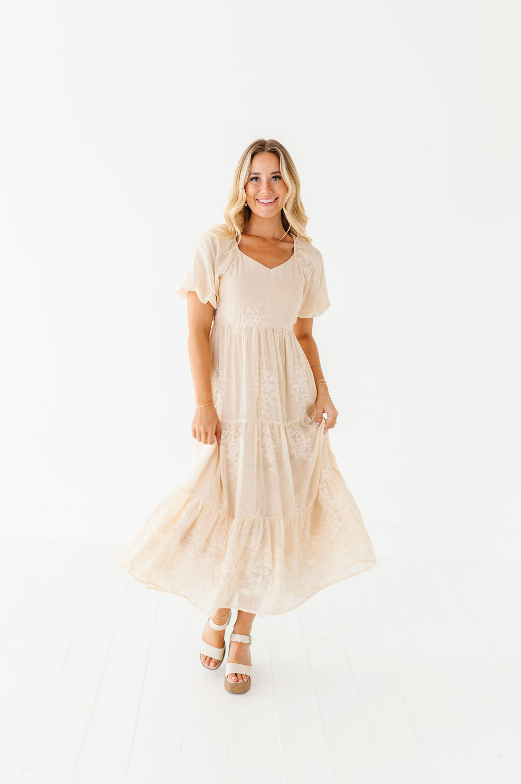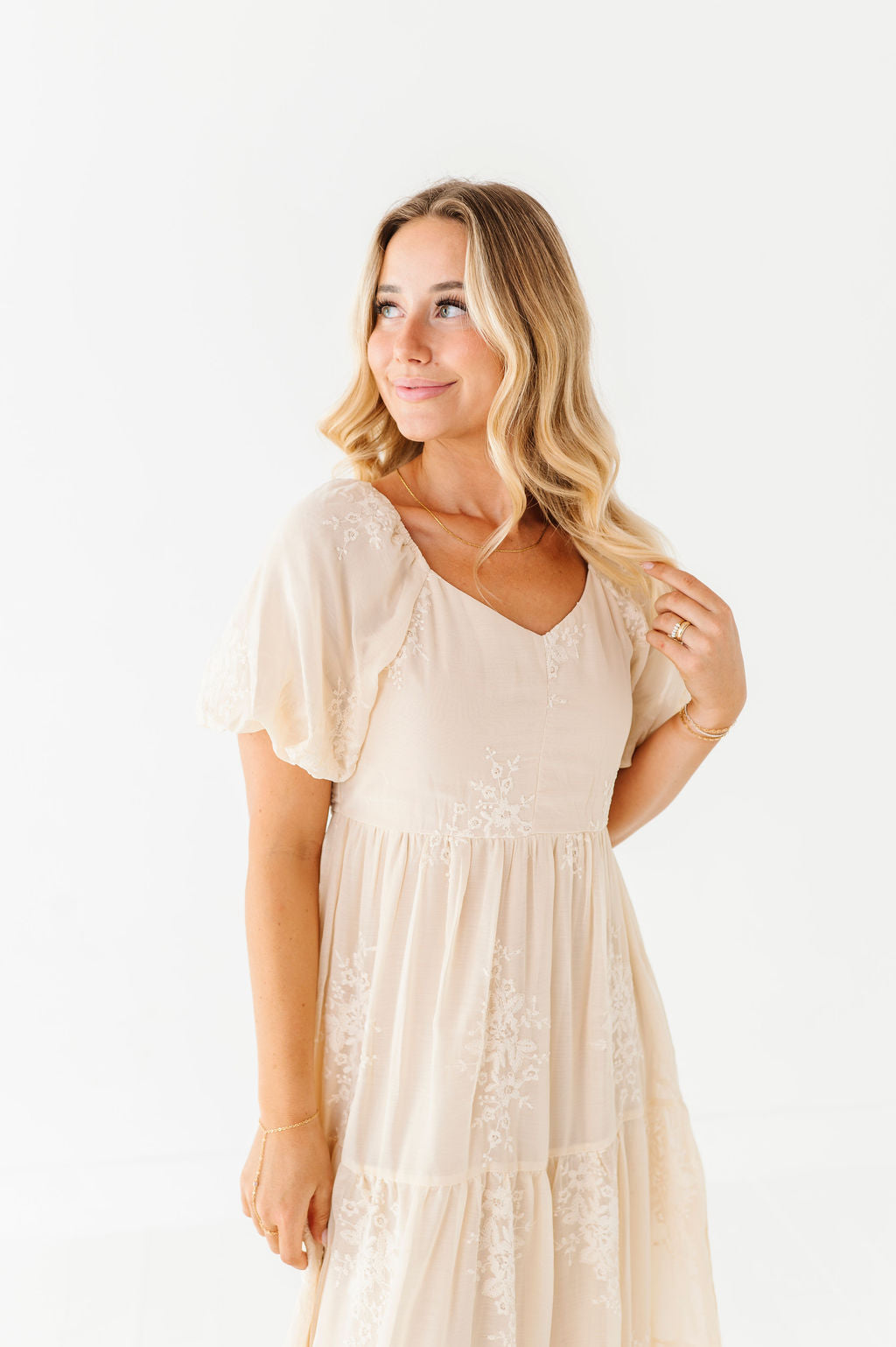 - Champagne colored chiffon with embroidered floral detailing