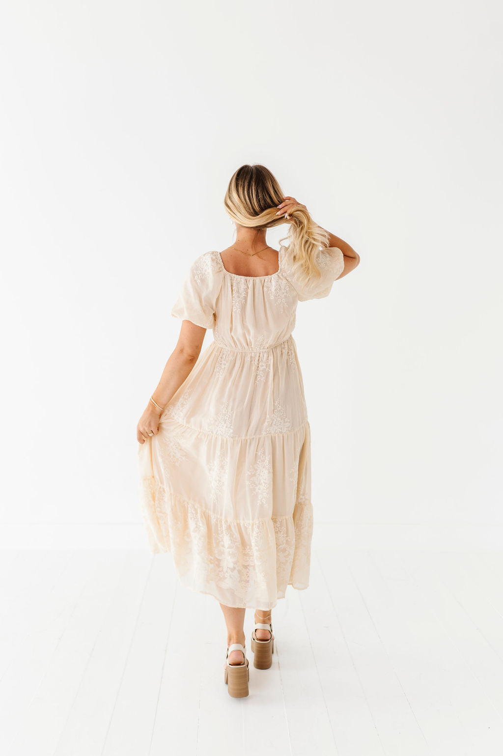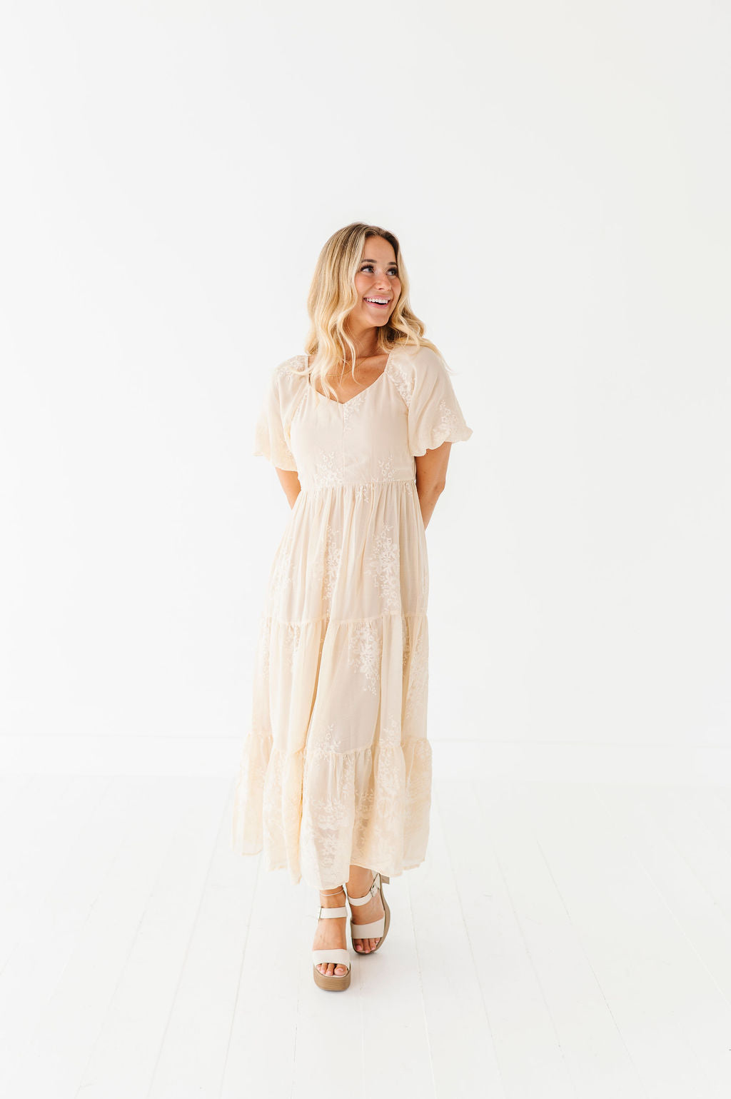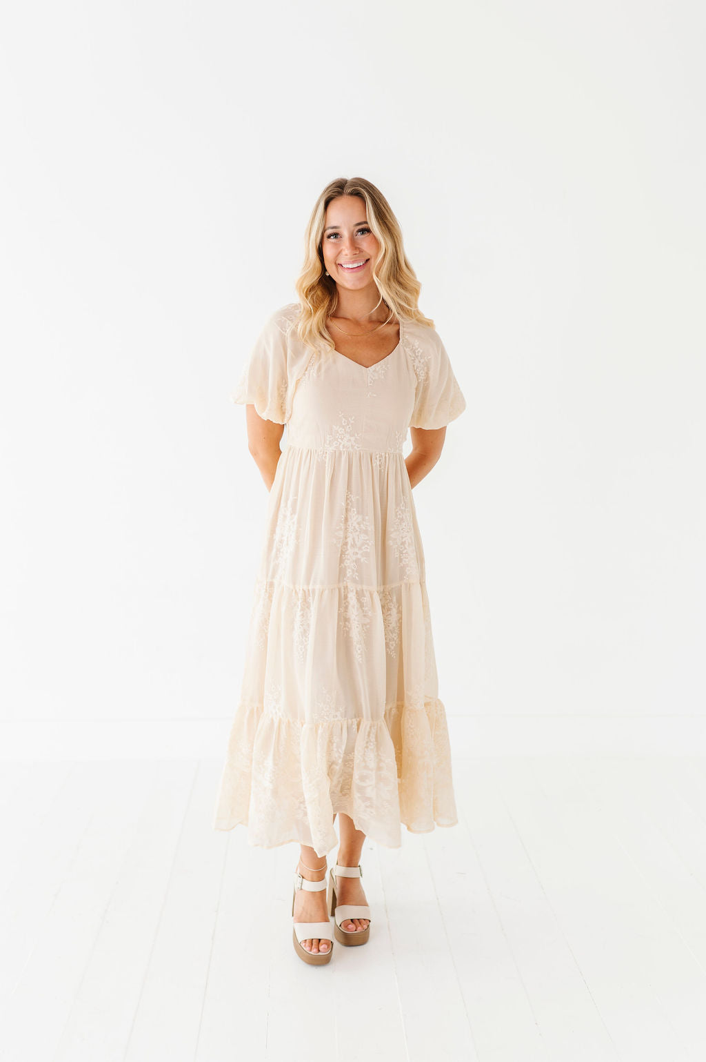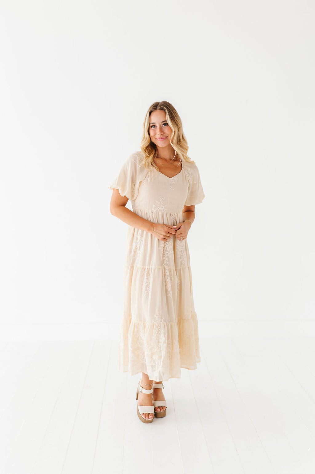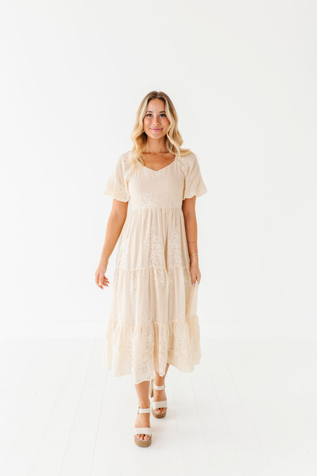 - Champagne colored chiffon with embroidered floral detailing