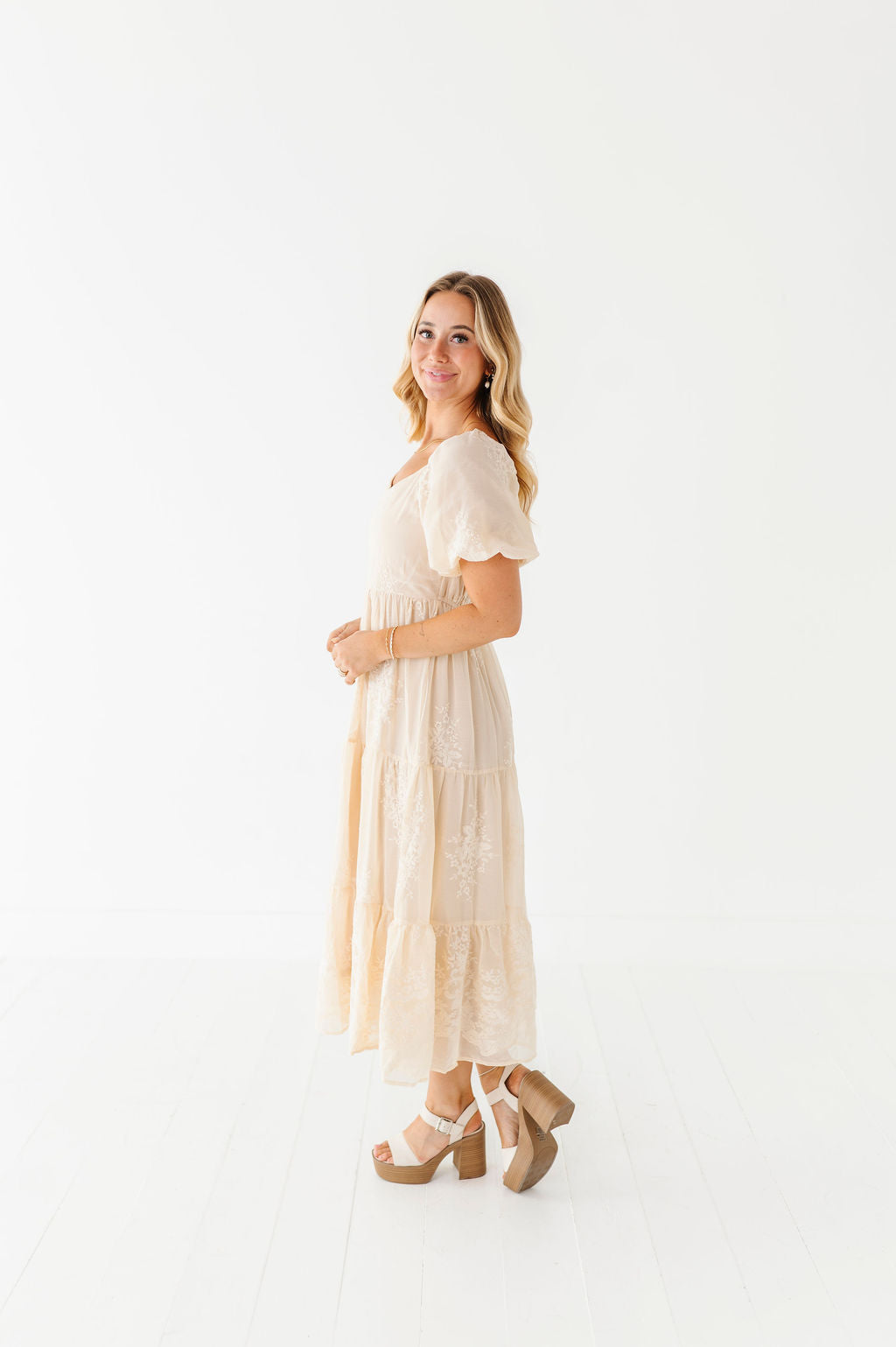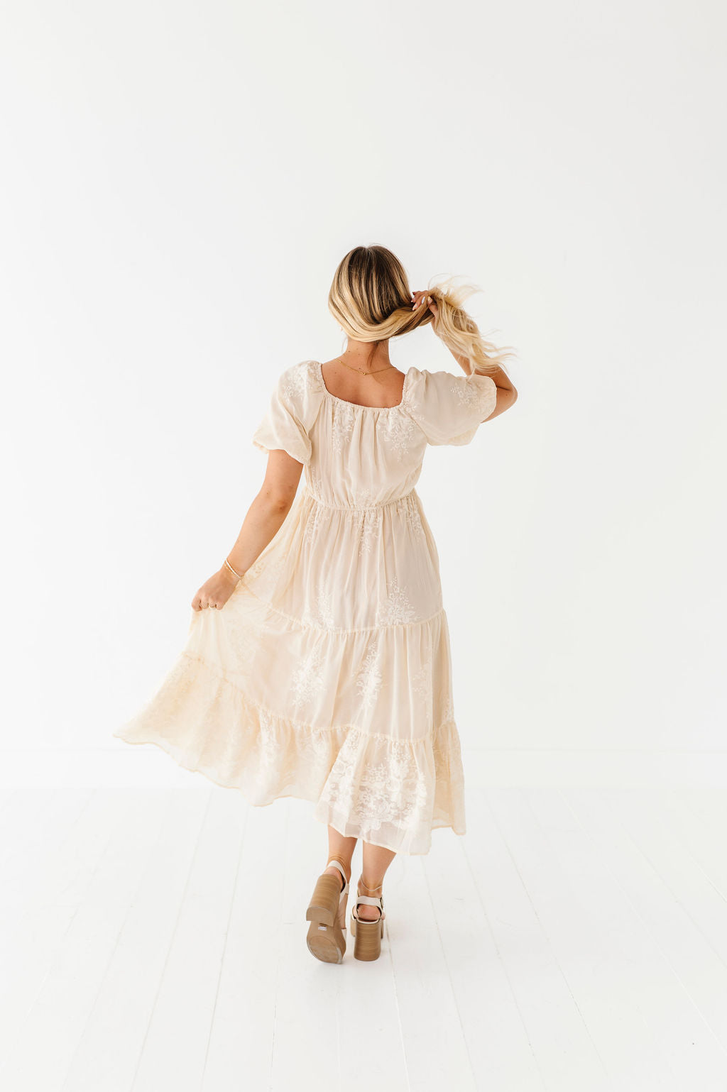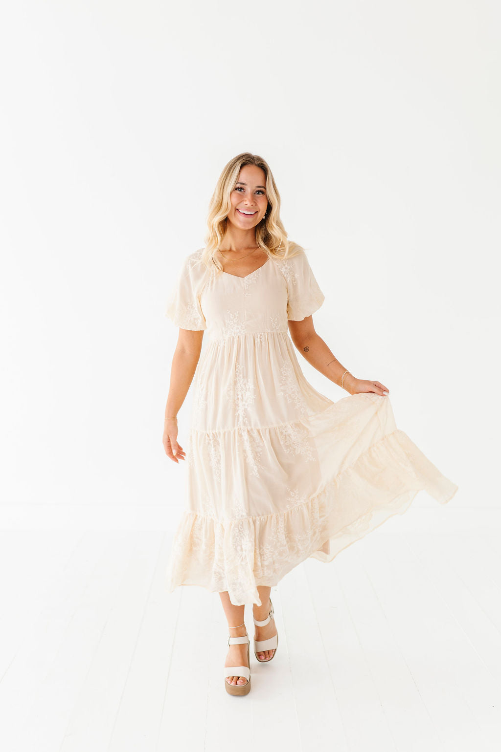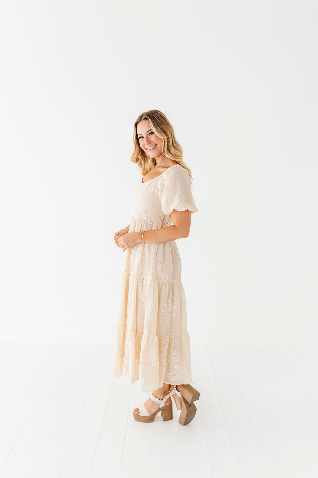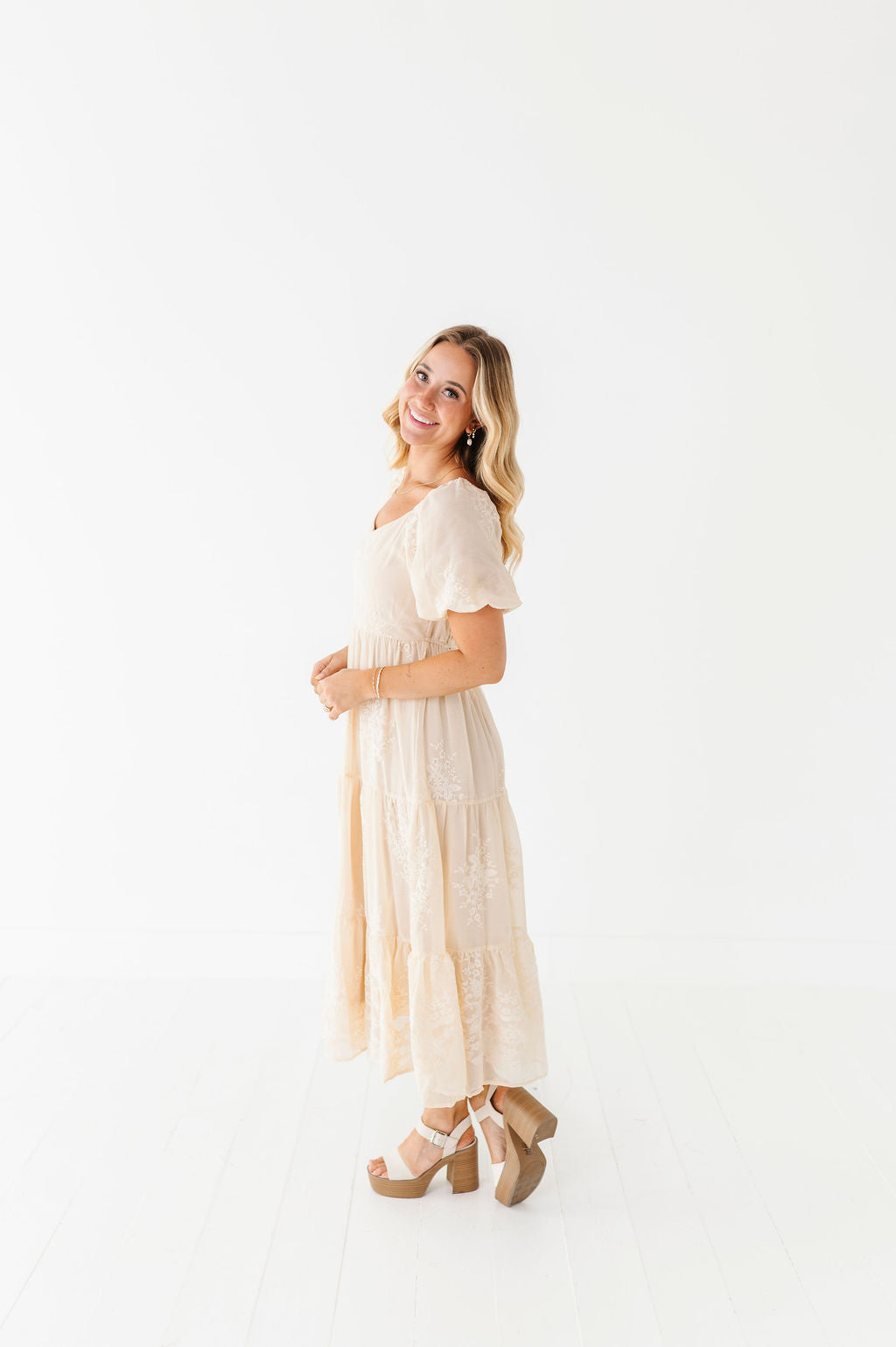 - Champagne colored chiffon with embroidered floral detailing