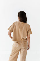 - Short sleeve top with round neck, exposed seam detail, and chest pocket