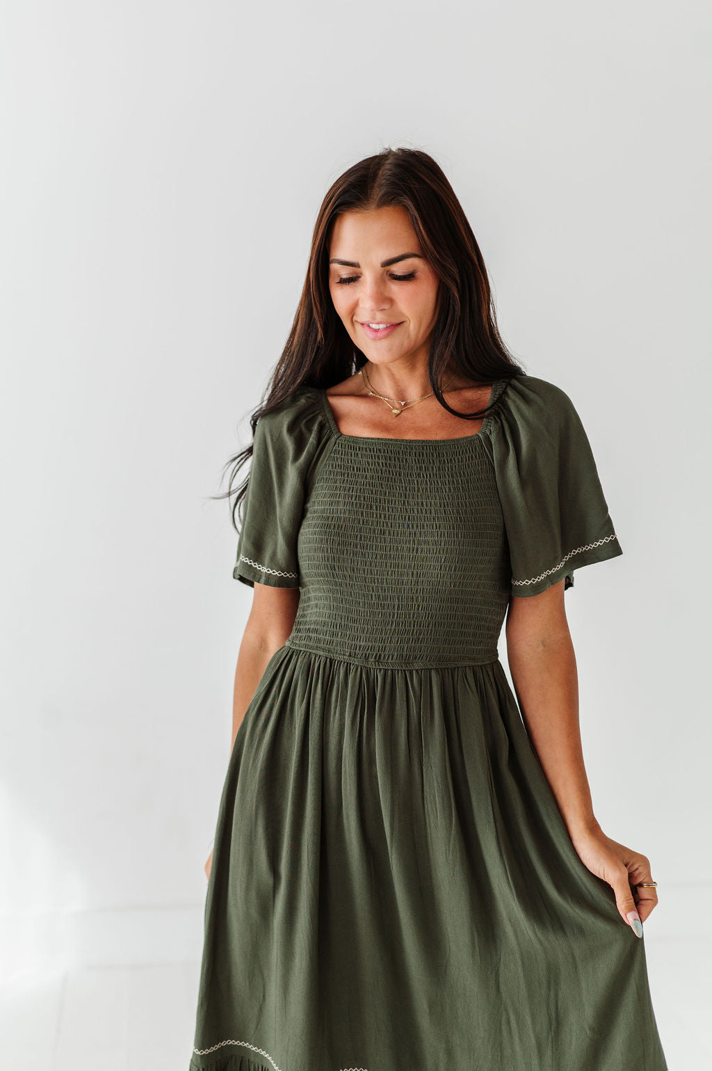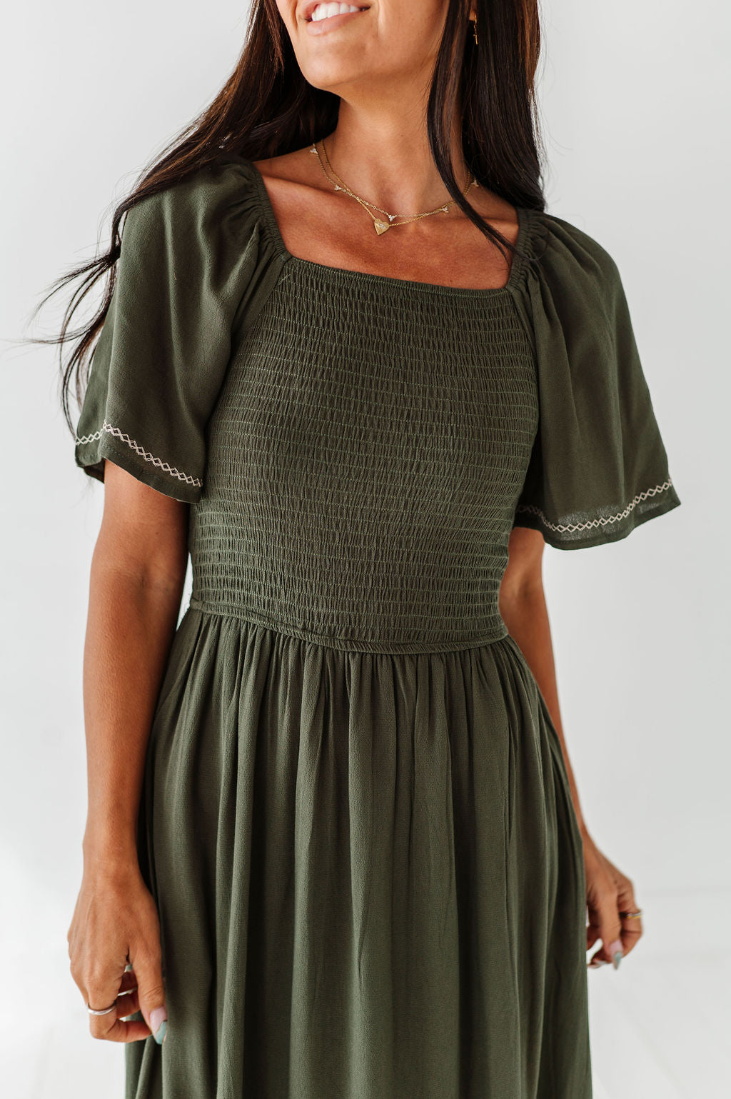 - Smocked bodice with stretch