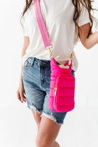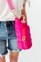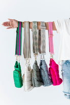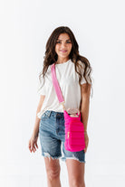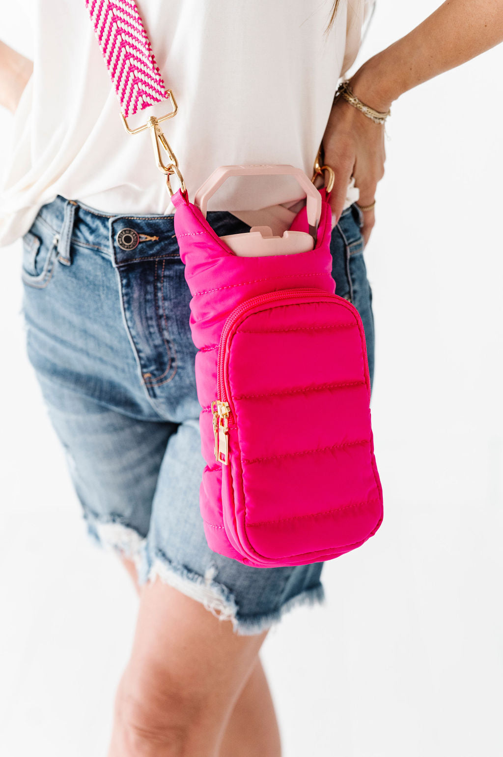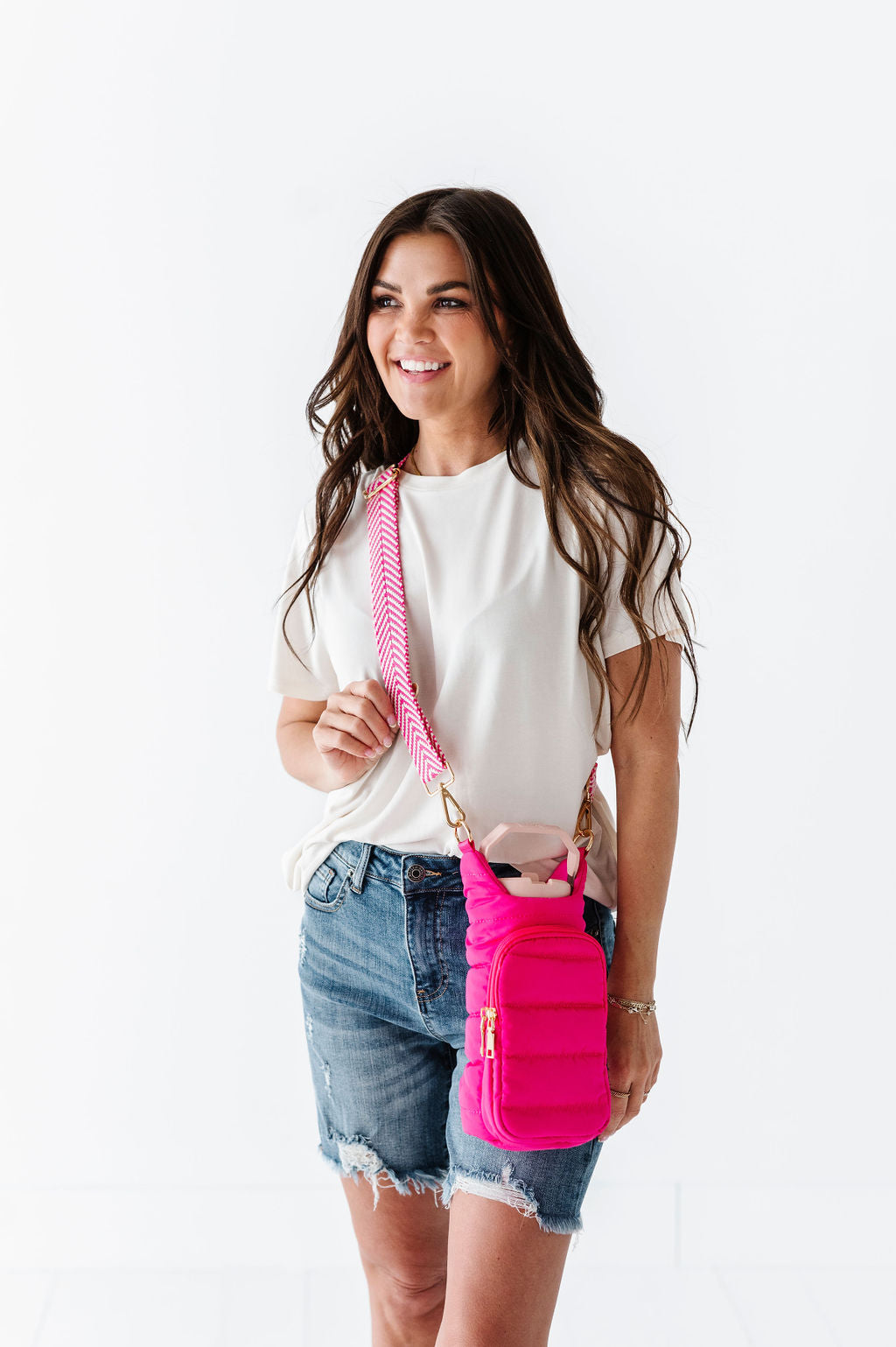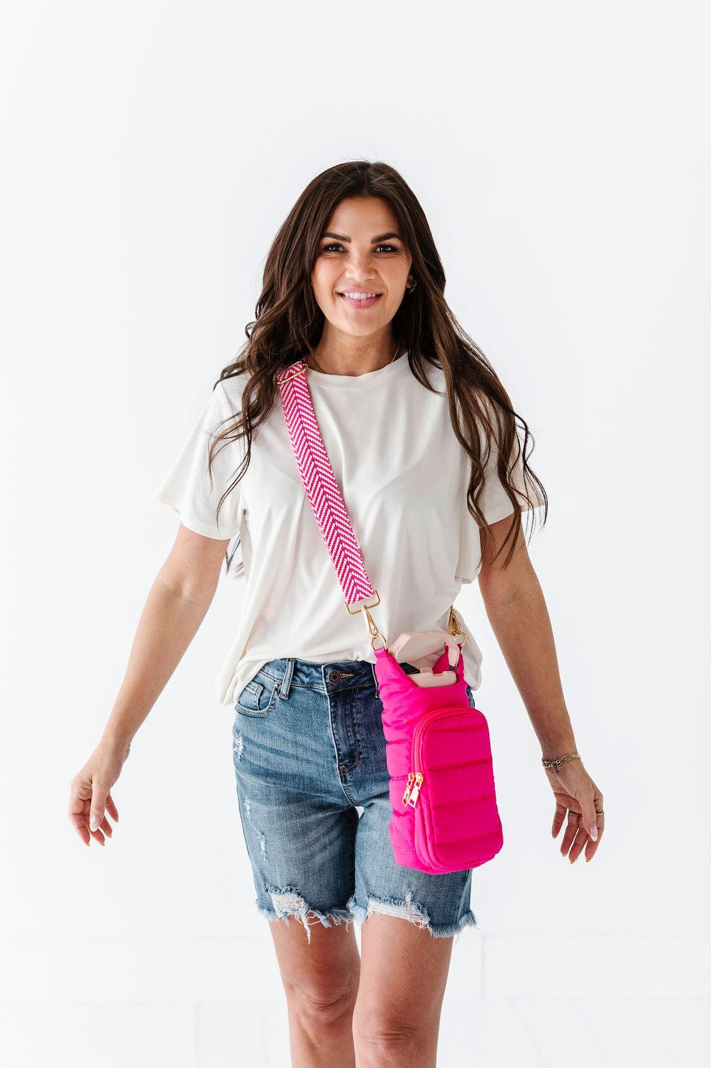 - Dark pink fabric with dark pink/taupe chevron print strap