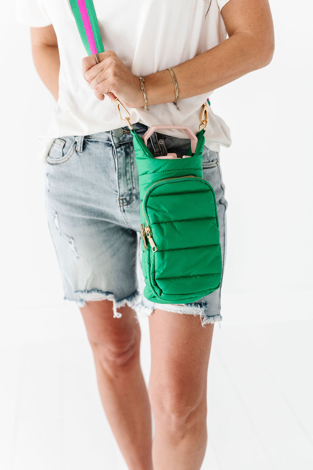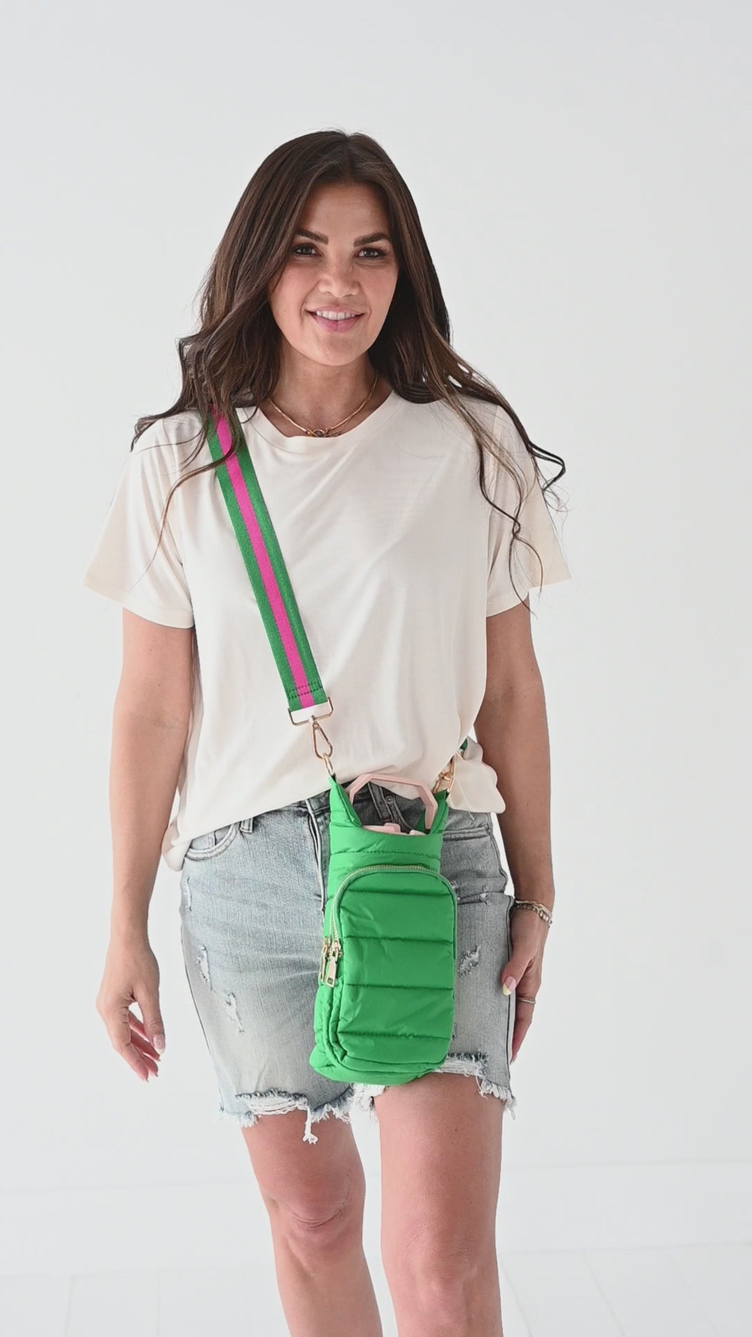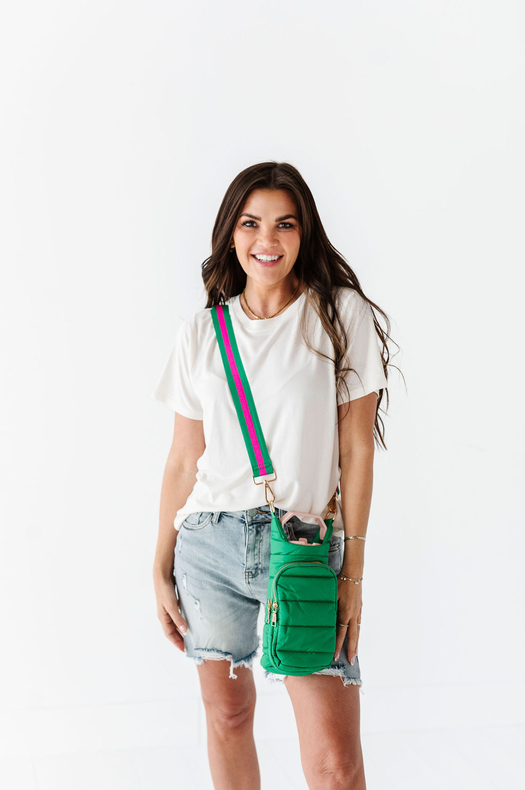 - Kelly green fabric with kelly green/dark pink strap