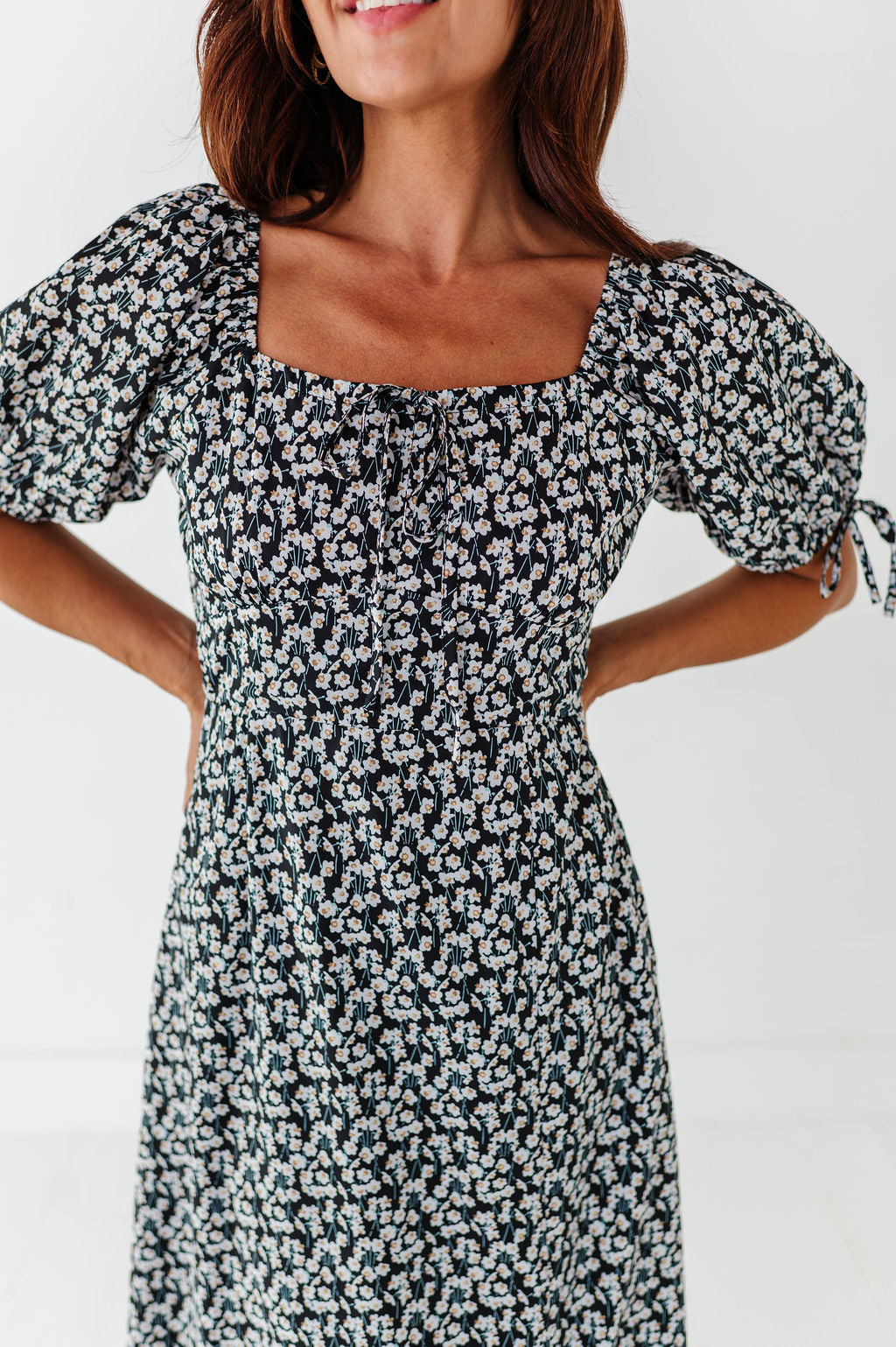 - Short puff sleeve with elastic and decorative tie