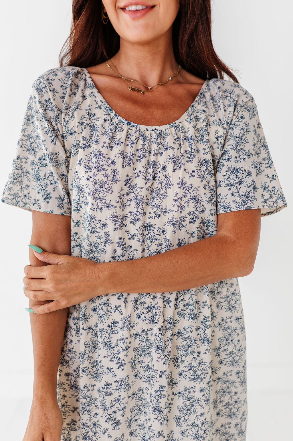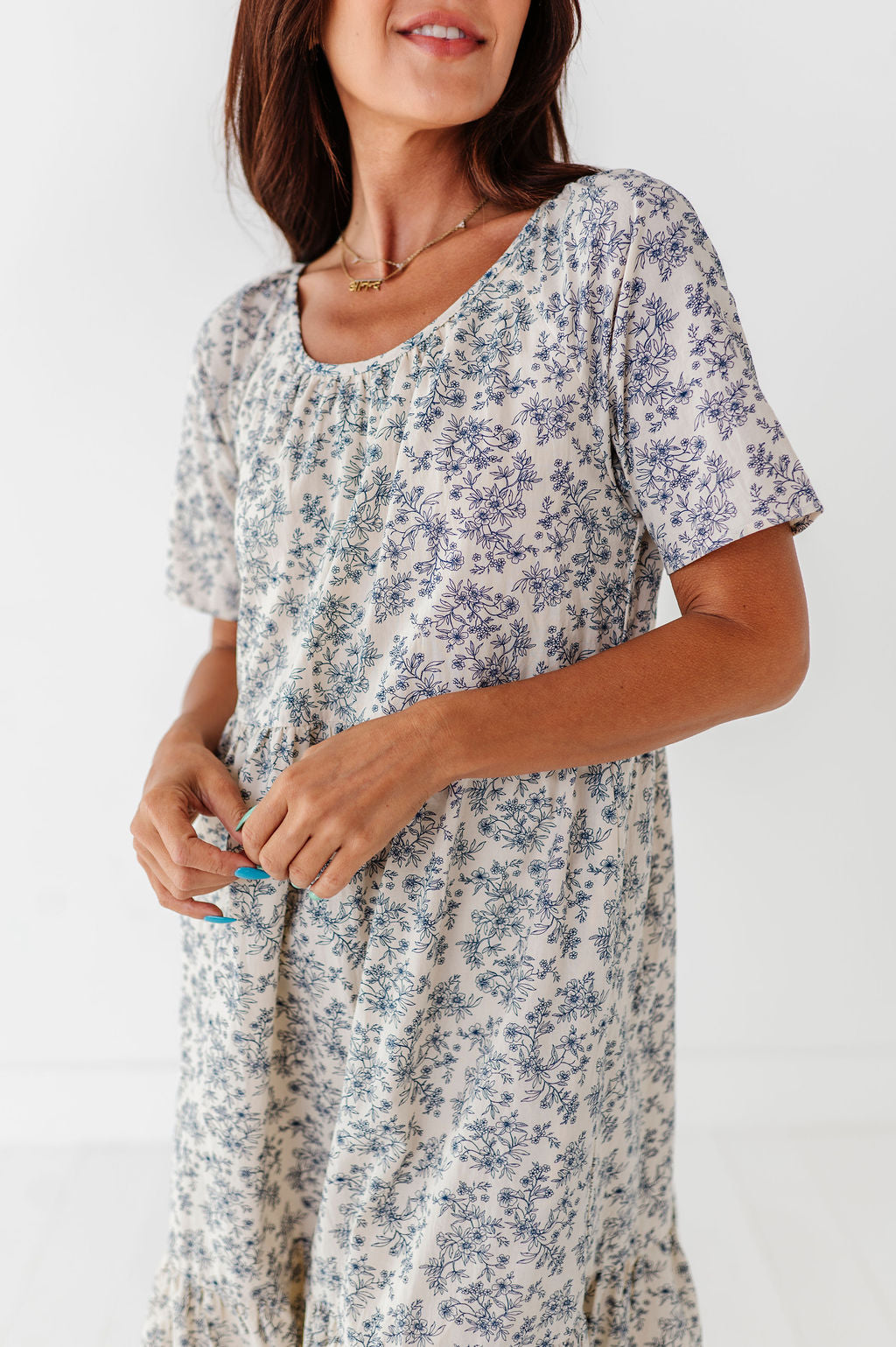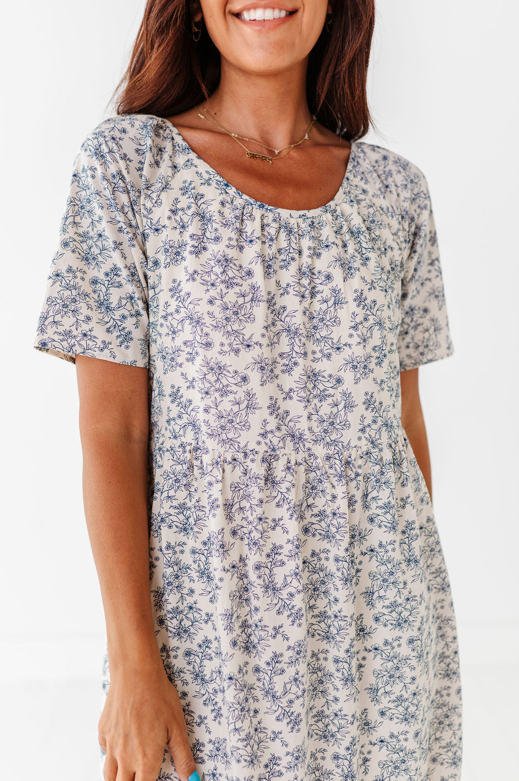 • Cream with navy floral and leaf print