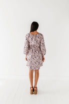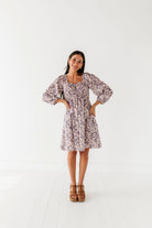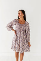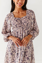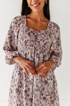 - Textured ivory fabric with gray undertones; purple and charcoal floral print