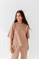 - Short sleeve, drop shoulder, slightly cropped crewneck top with relaxed fit