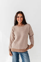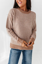 - Cream with camel brown checkerboard and stripe colorblock