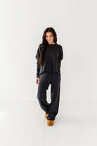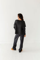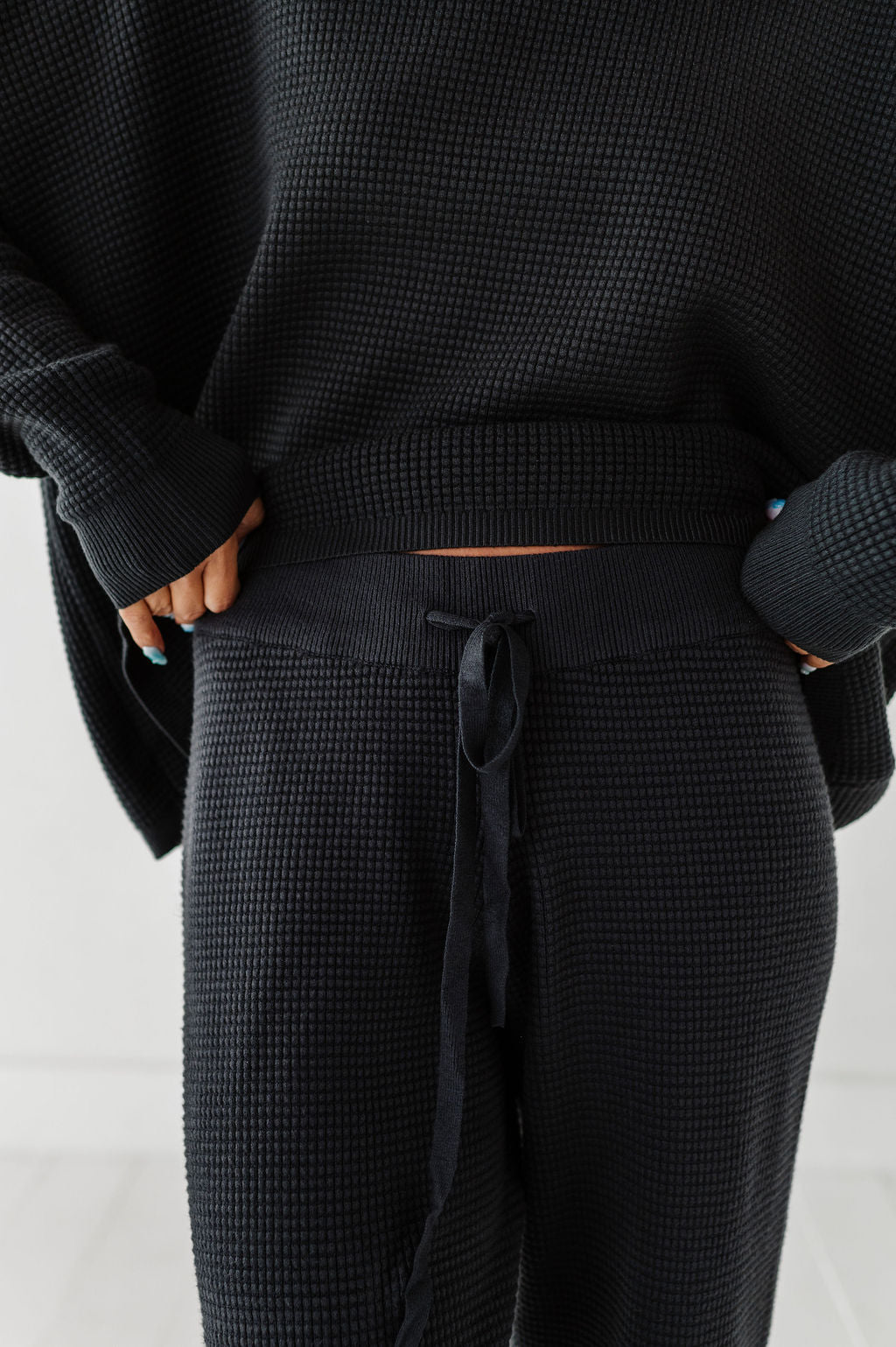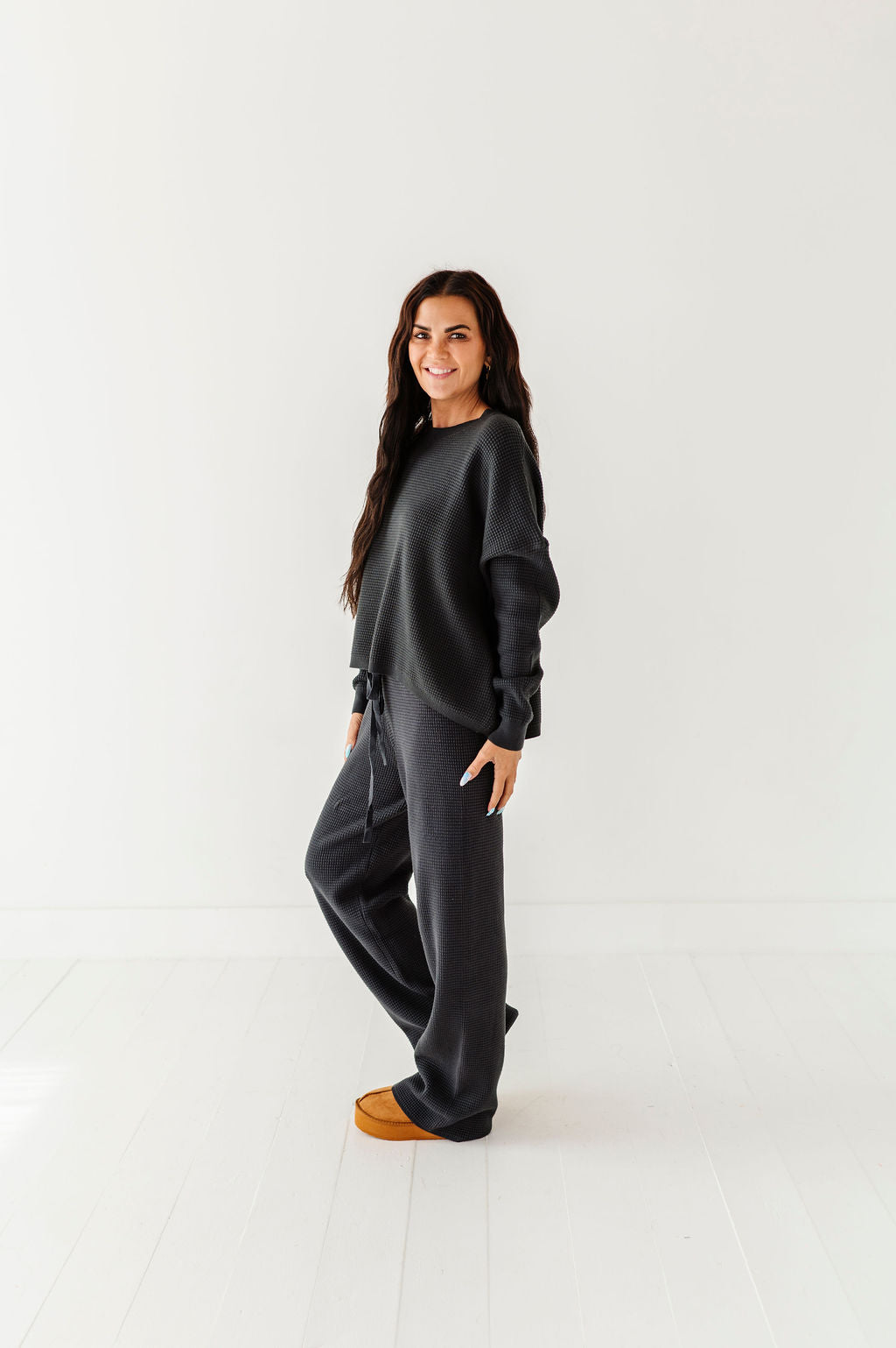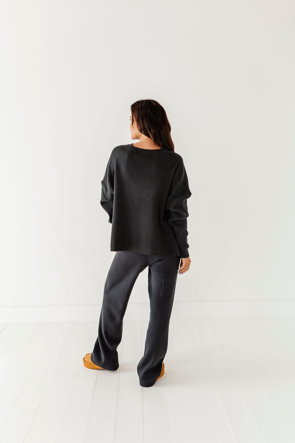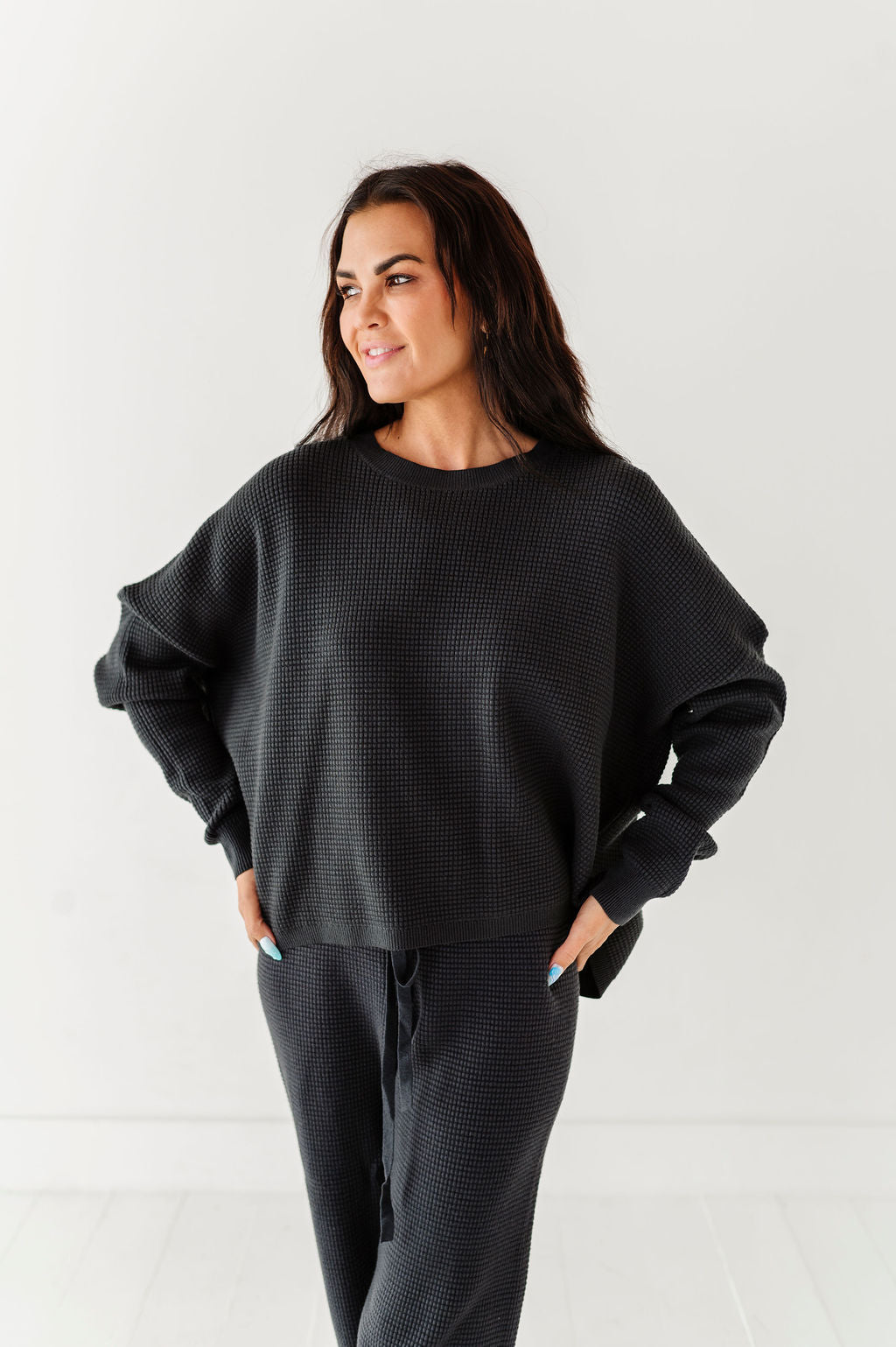 - Long sleeve top with round neckline, drop shoulder, and waffle textured fabric