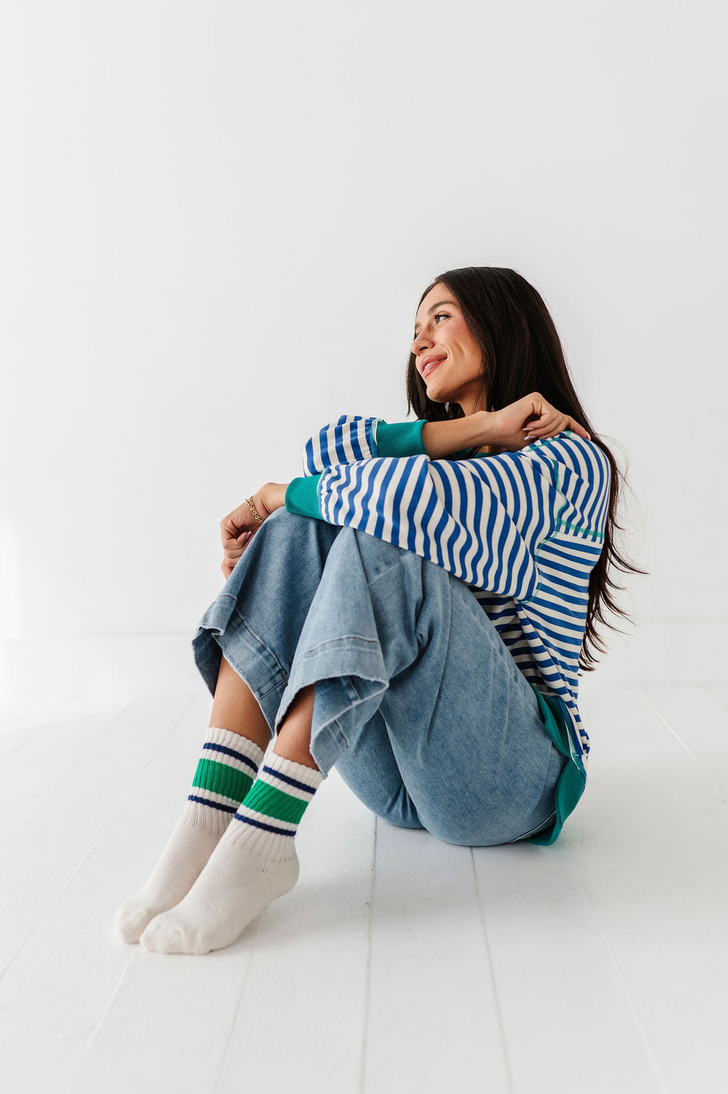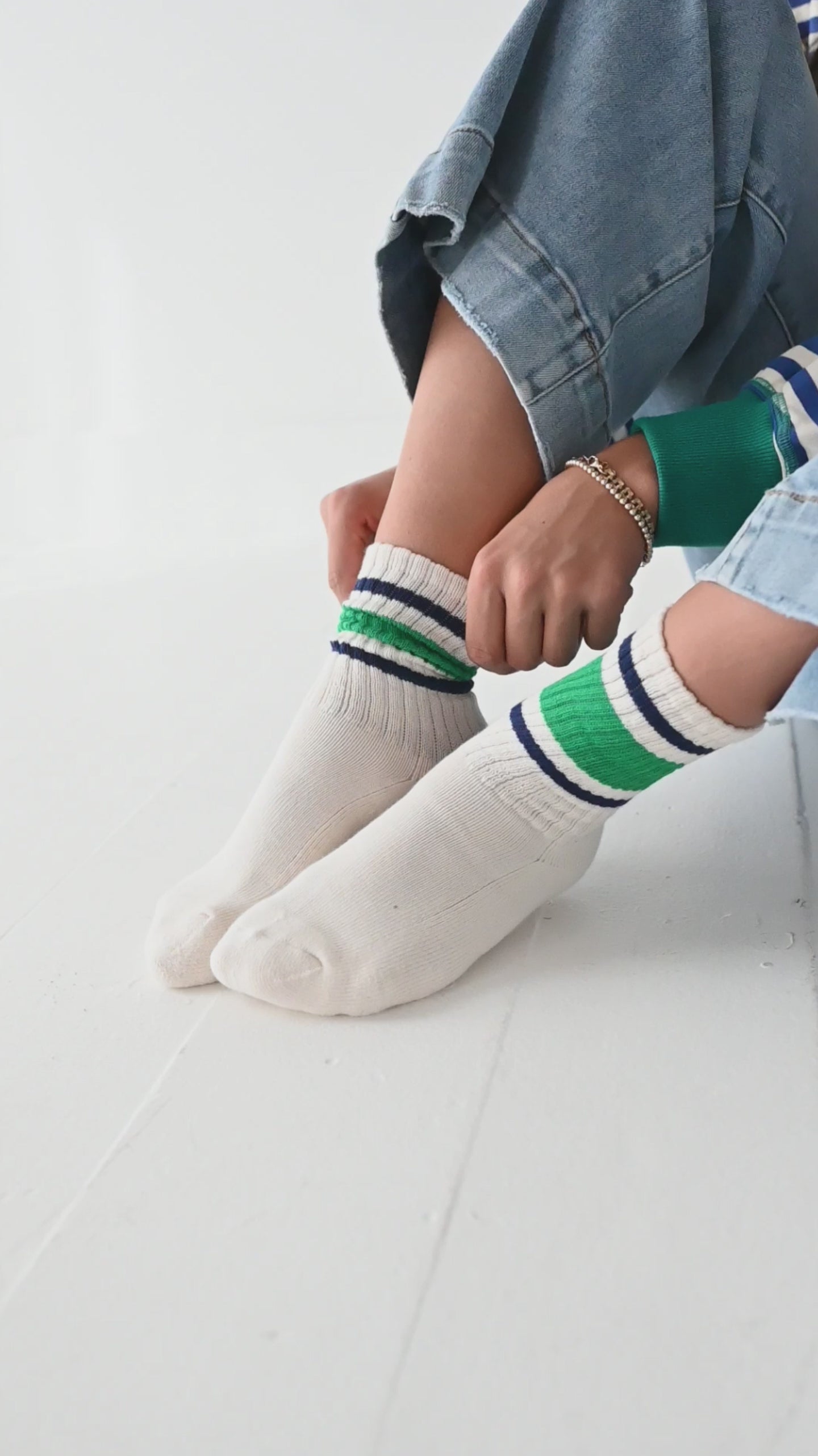 • White socks with green and navy varsity stripes