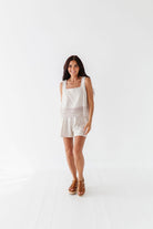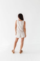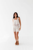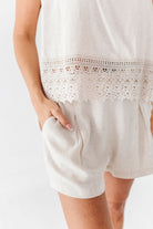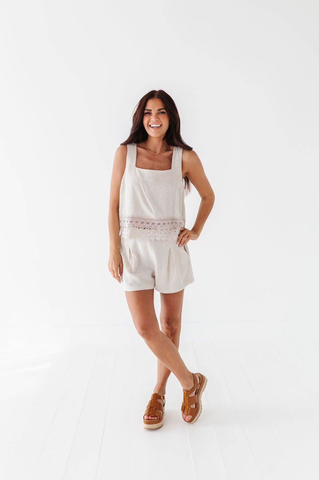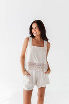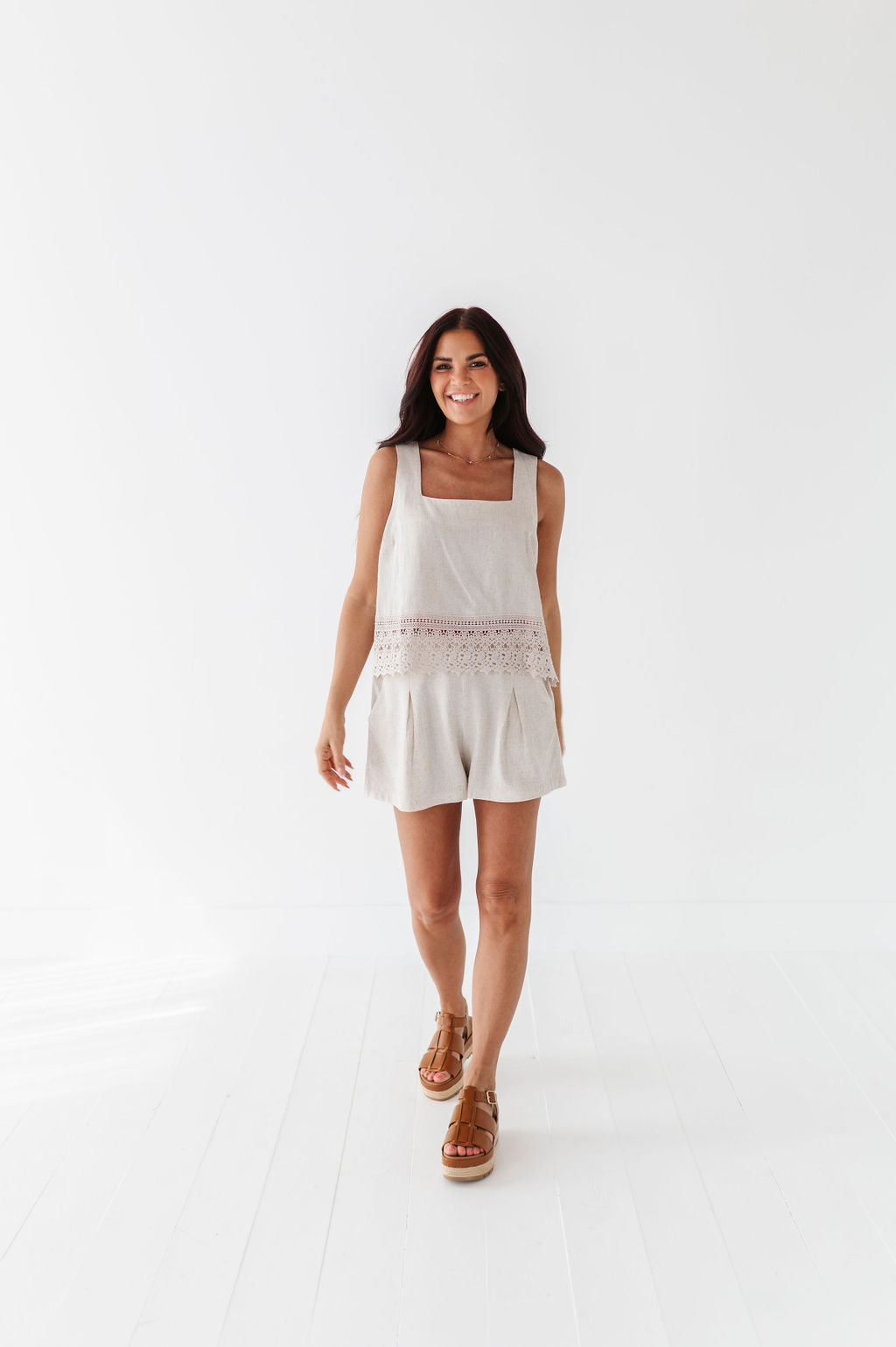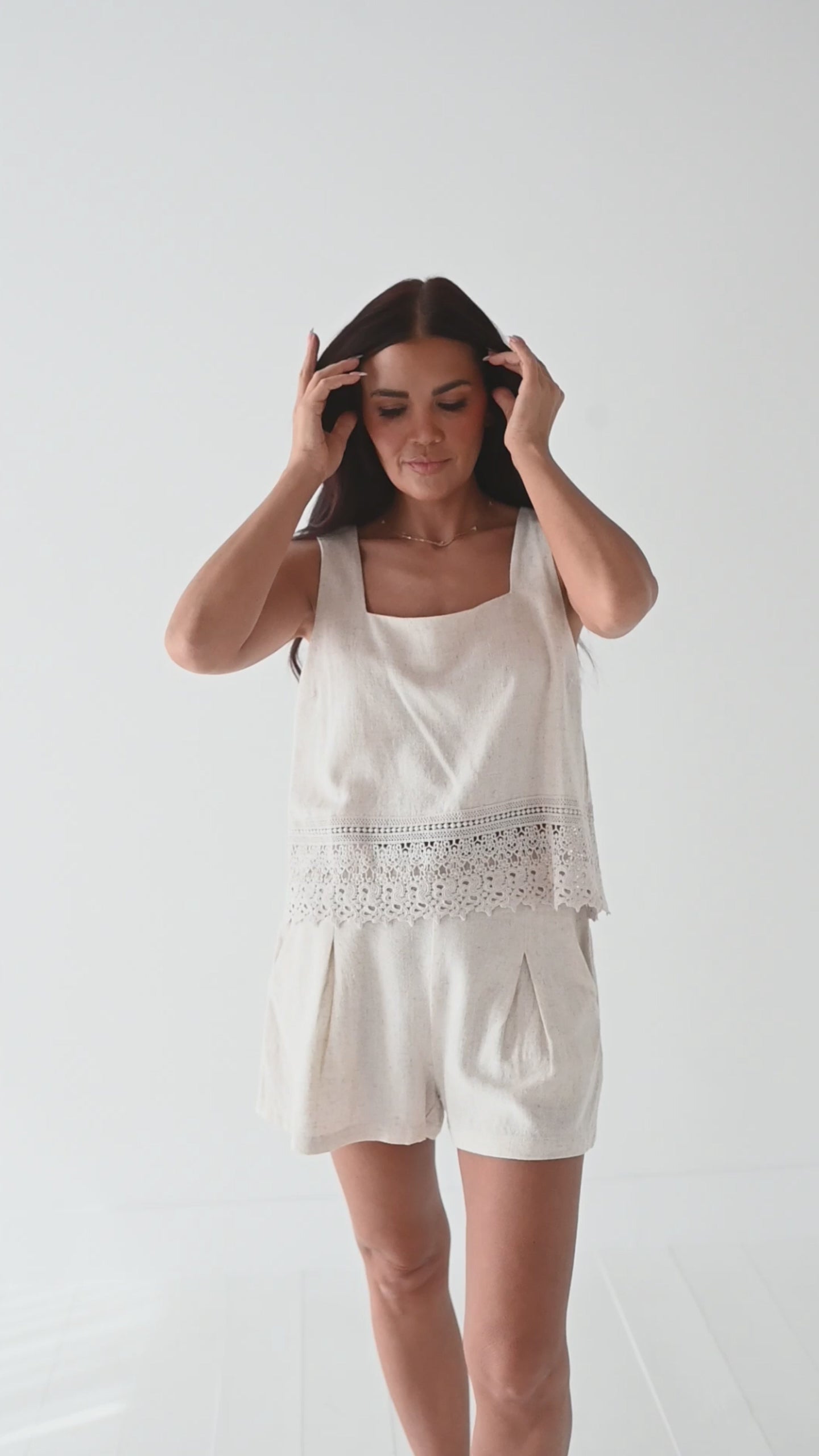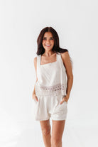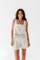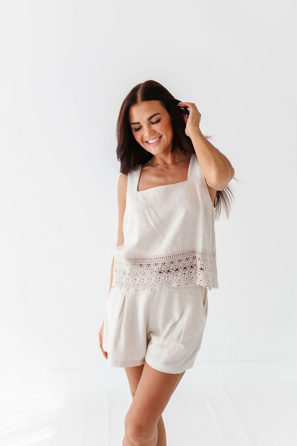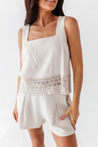 - Sleeveless top with square neckline and crochet lace trimmed hem