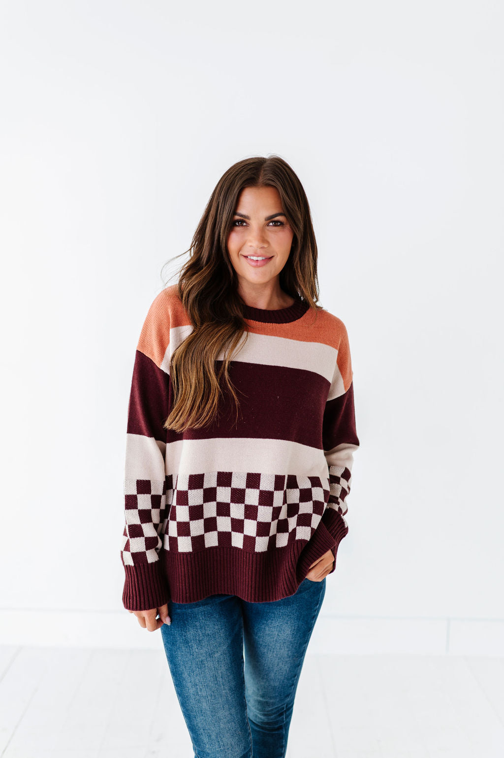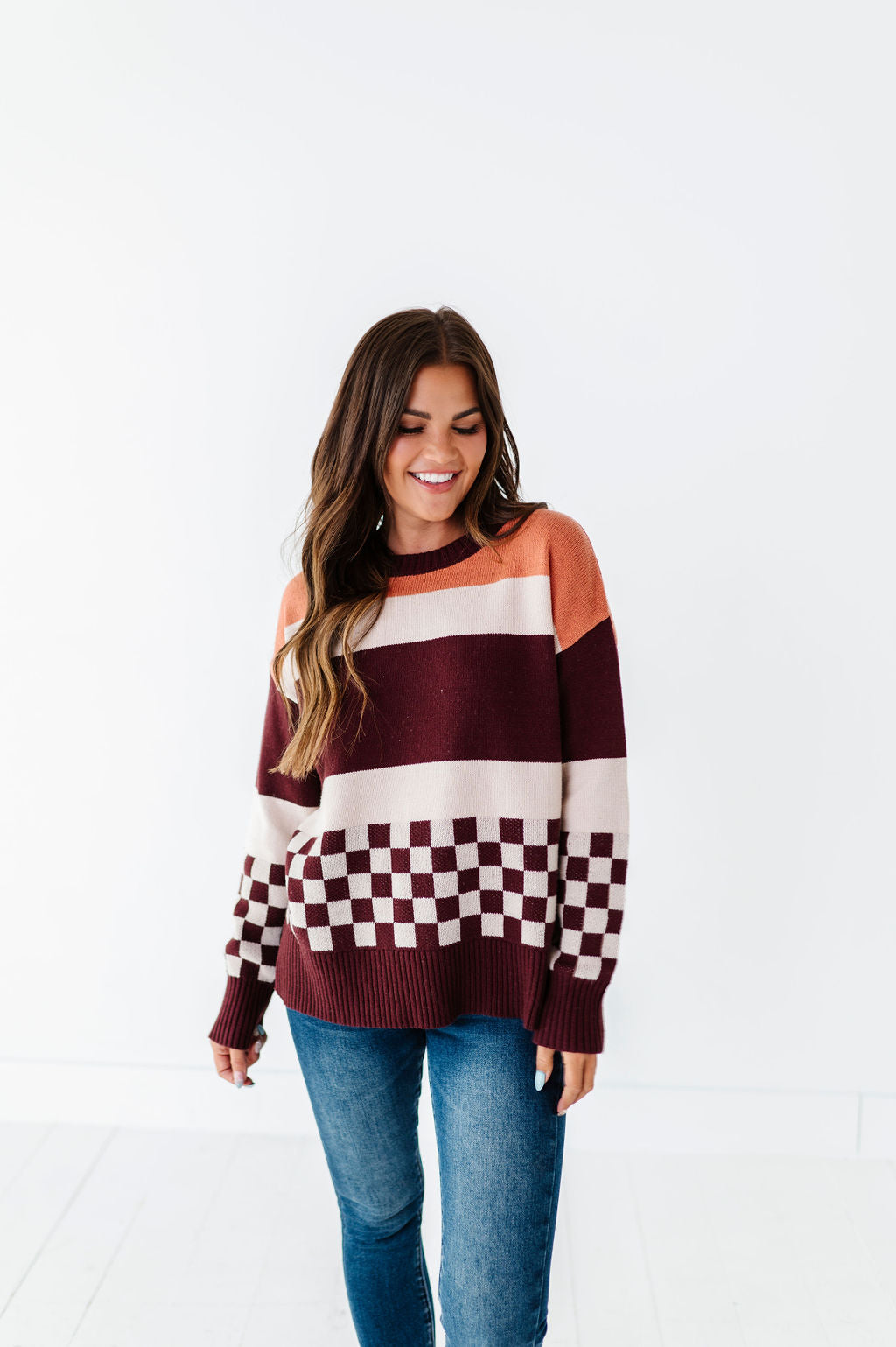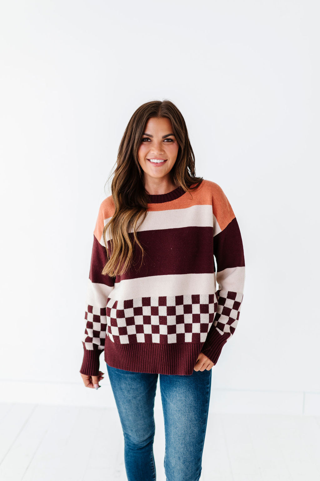 - Mustard, cream, and burgundy stripes with contrasting burgundy and cream checkered detail