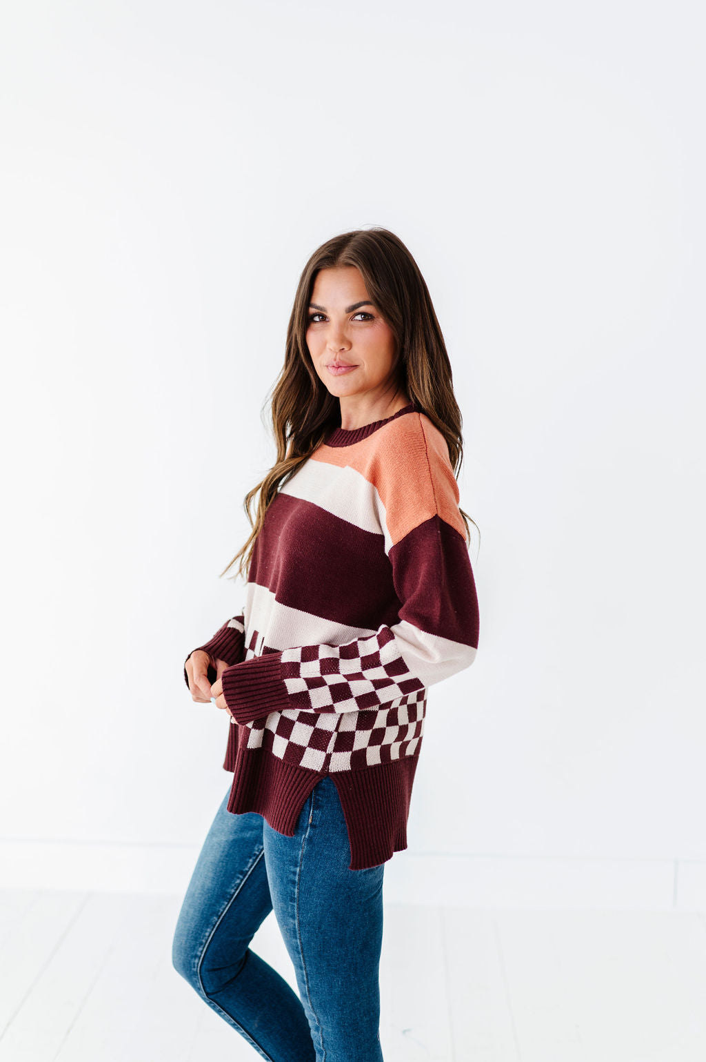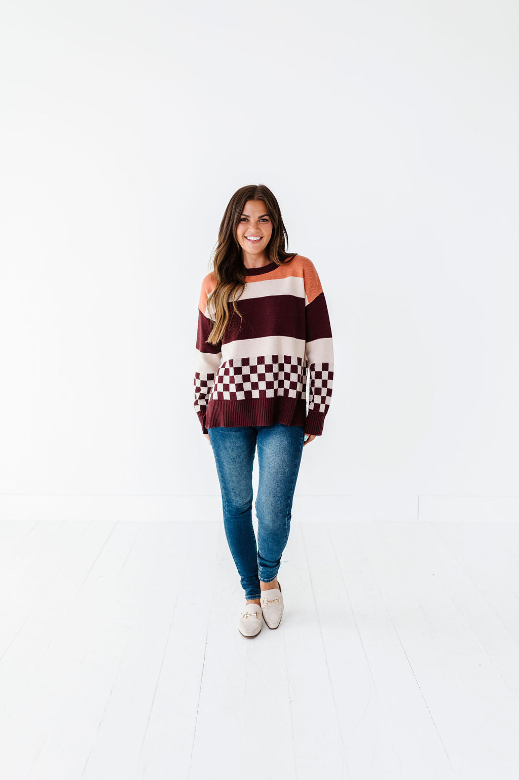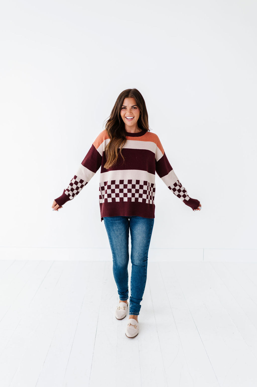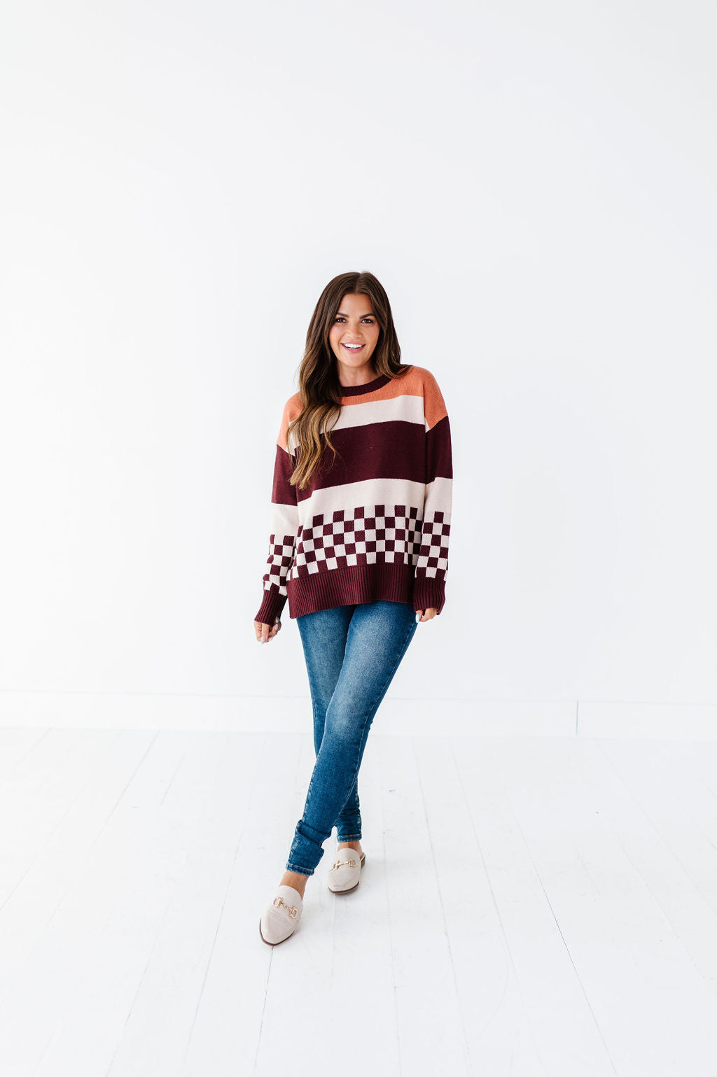 - Mustard, cream, and burgundy stripes with contrasting burgundy and cream checkered detail