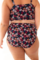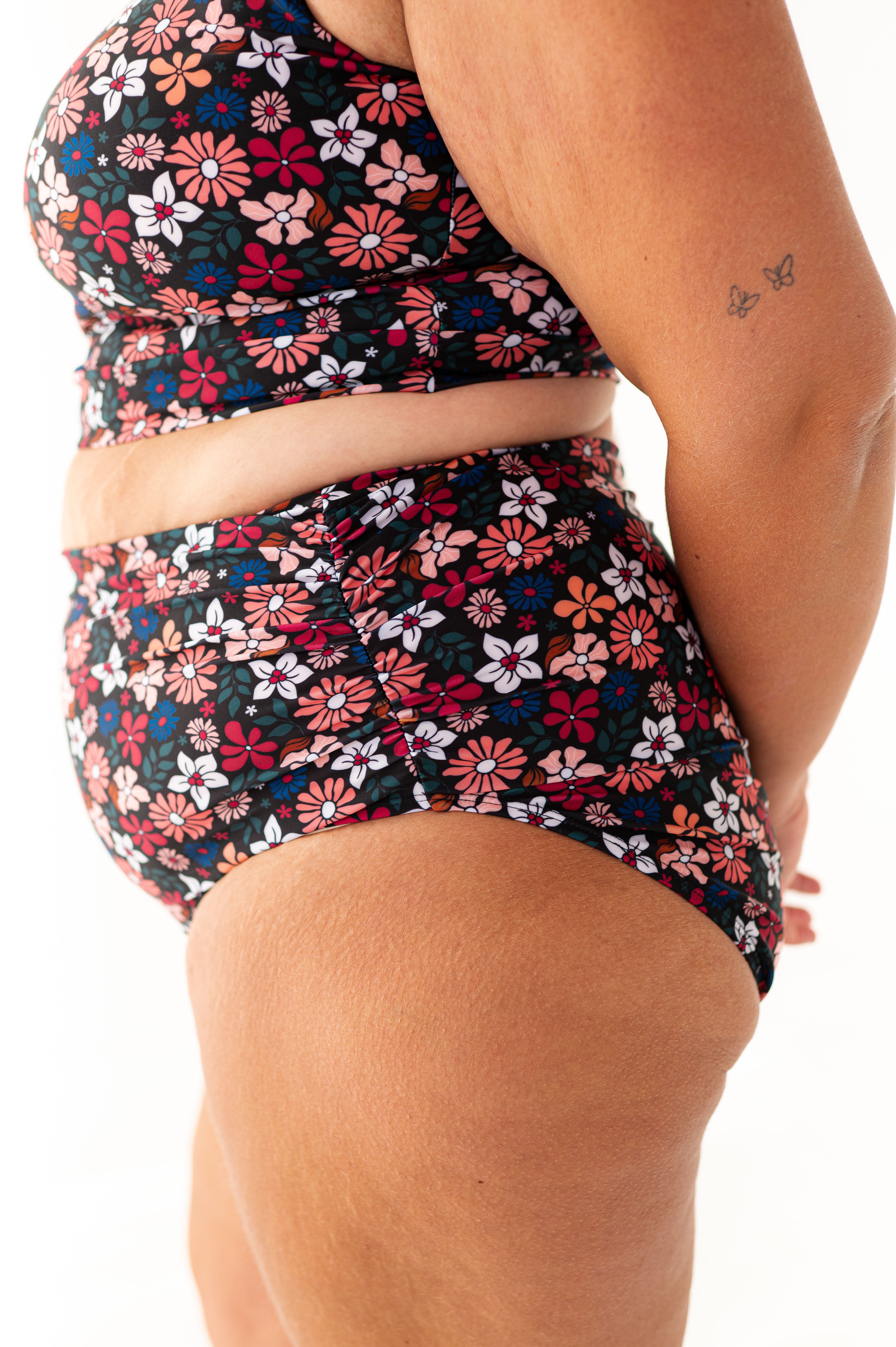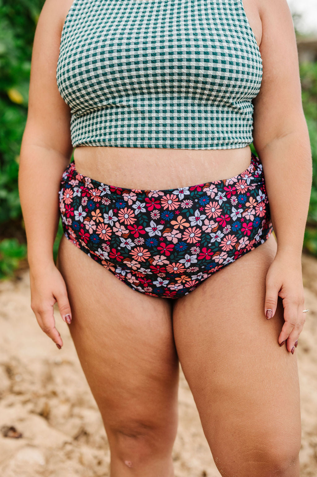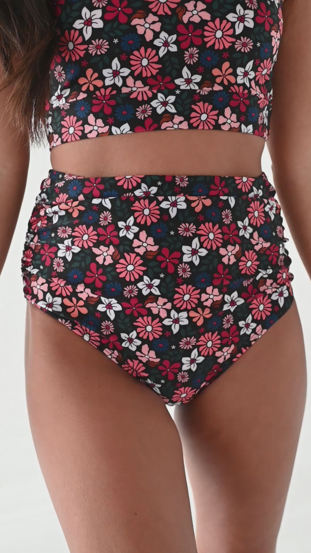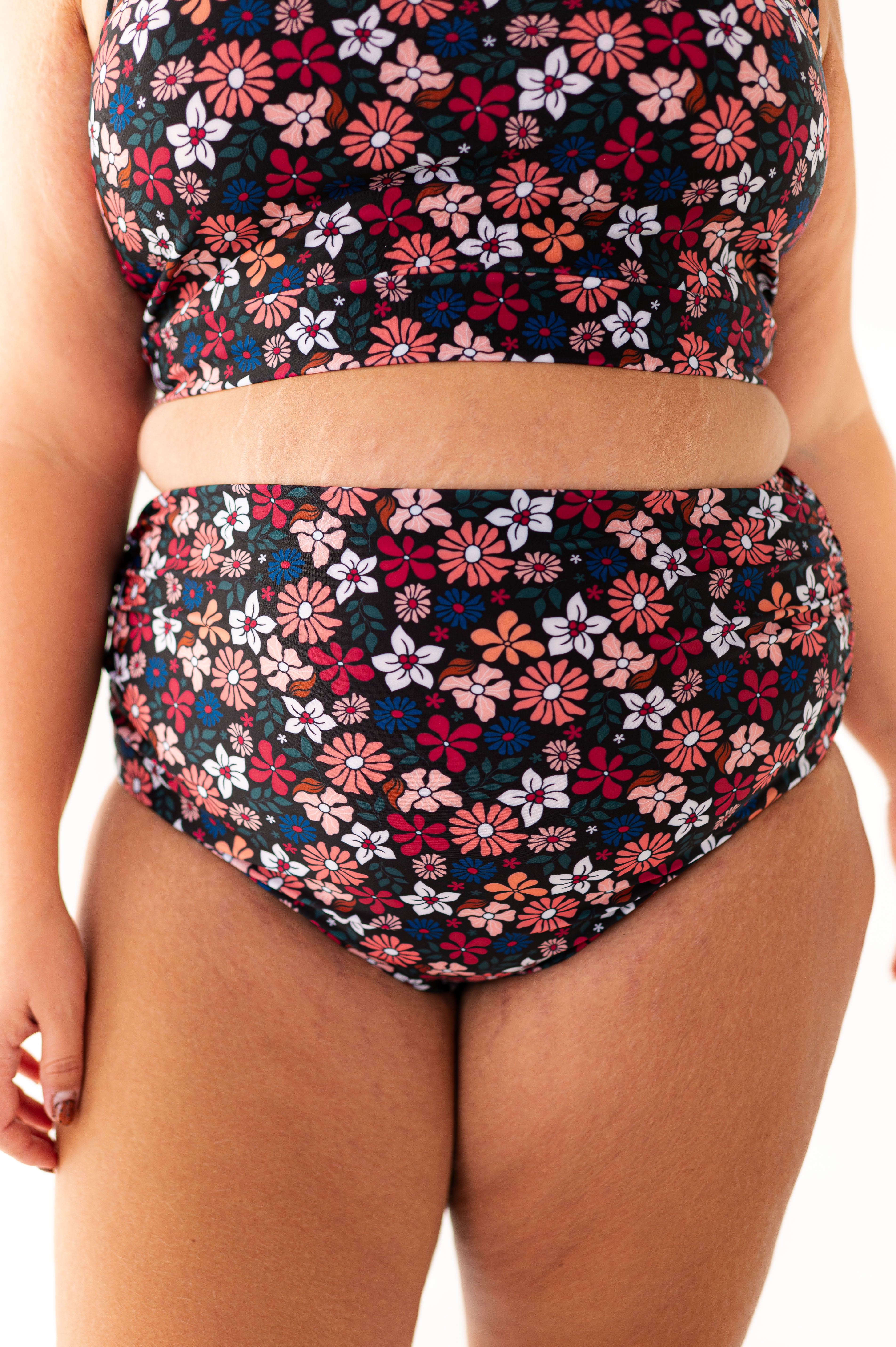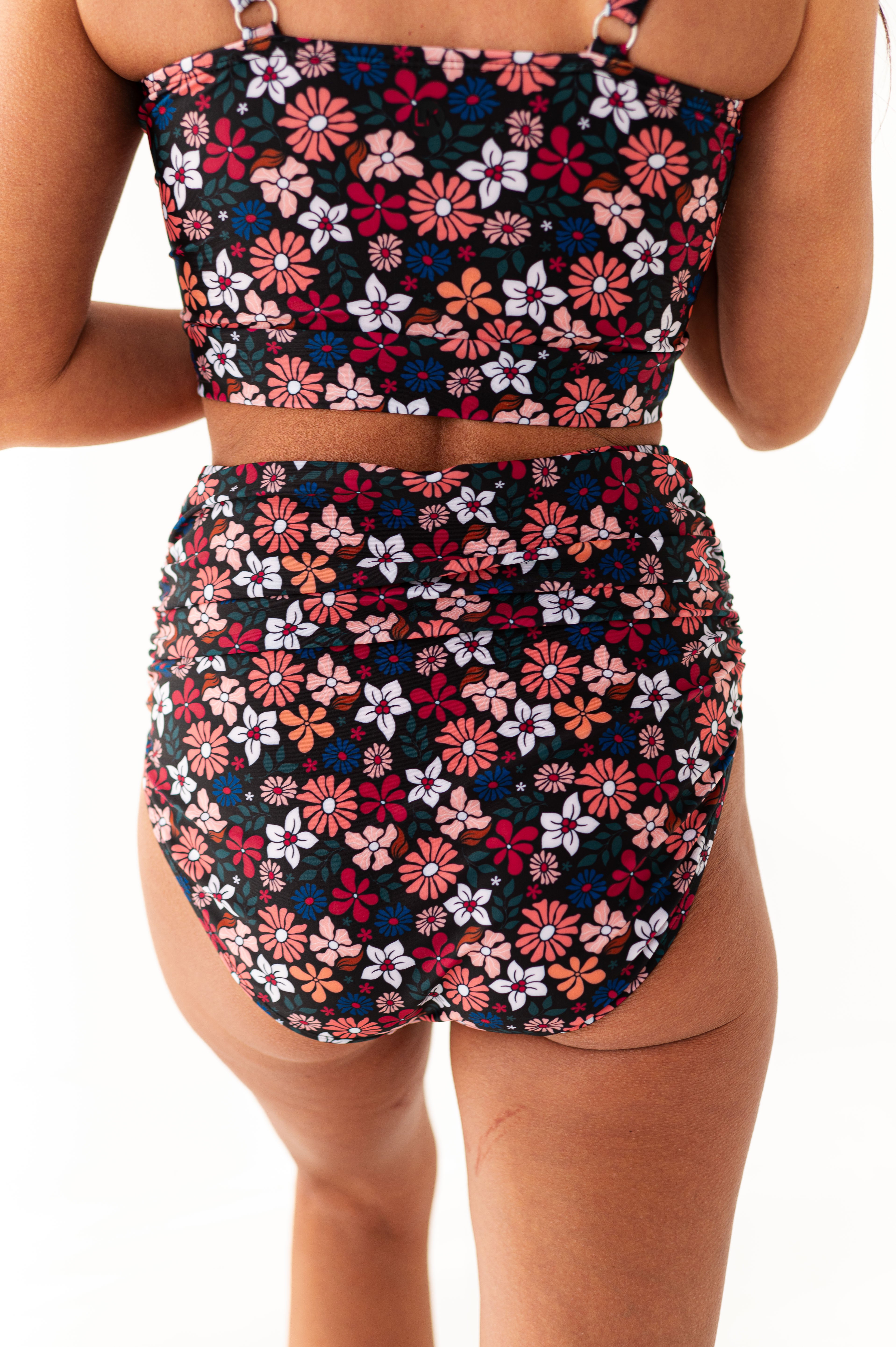 Basic Beach Mid Rise Ruched Bottoms in Midnight Floral