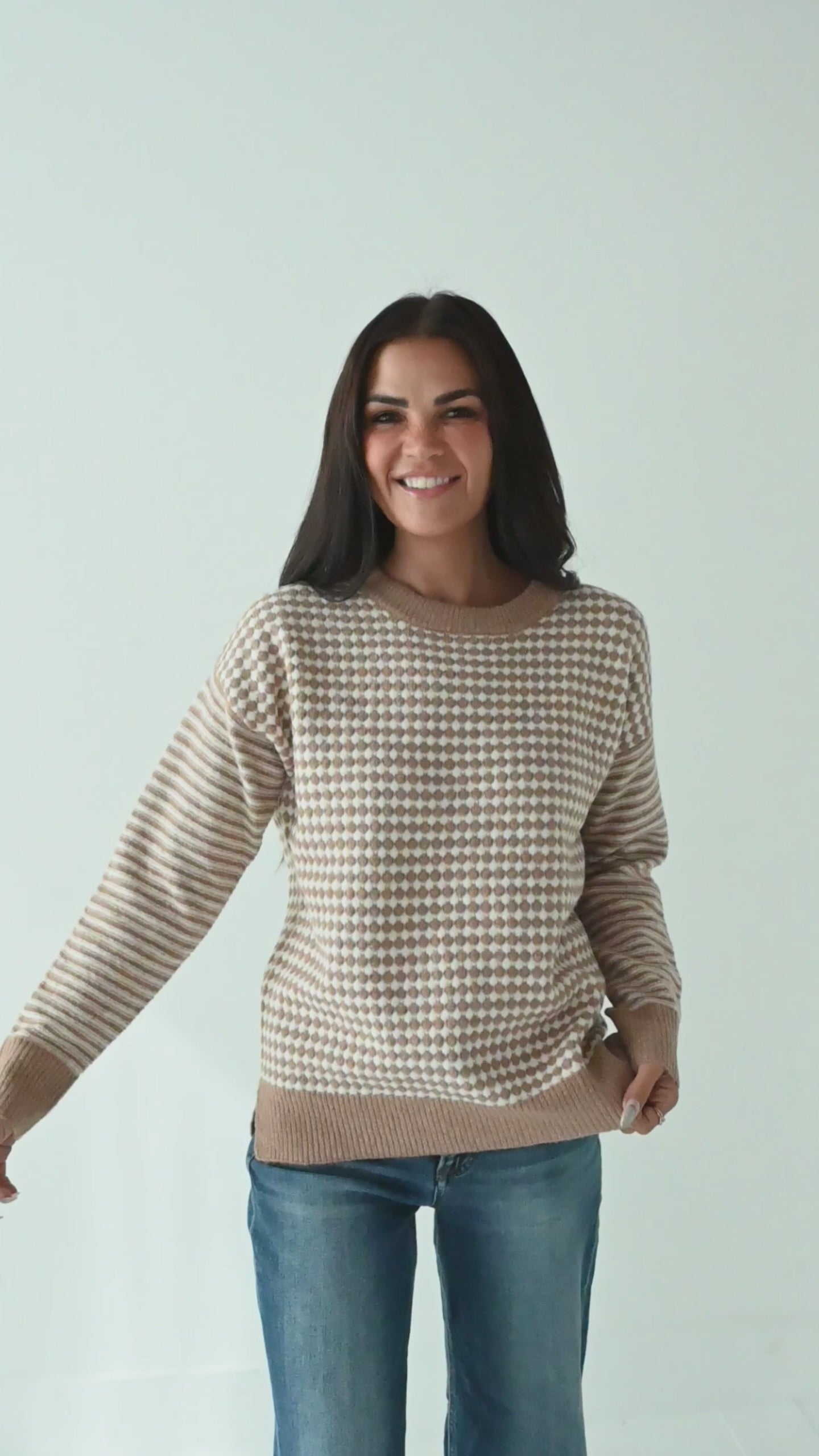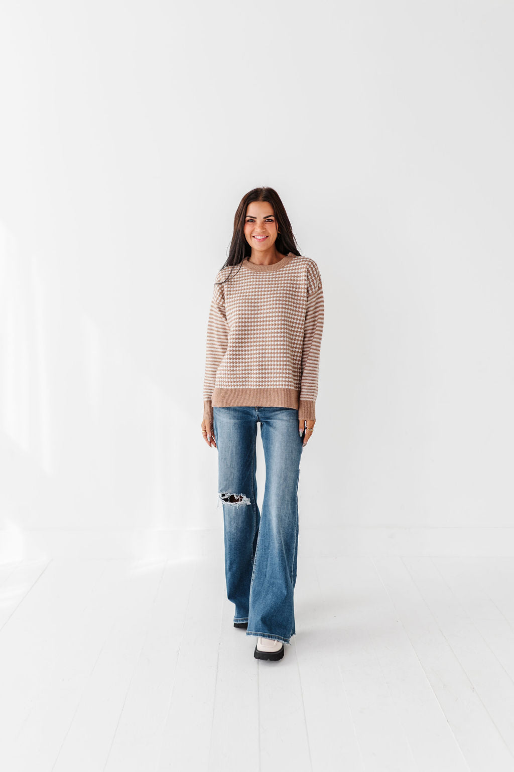 - Cream with camel brown checkerboard and stripe colorblock