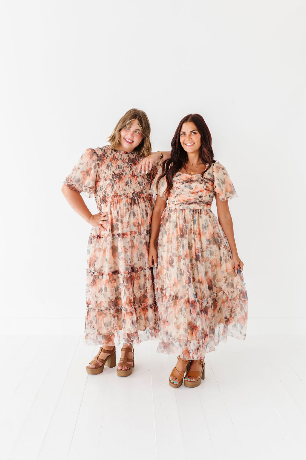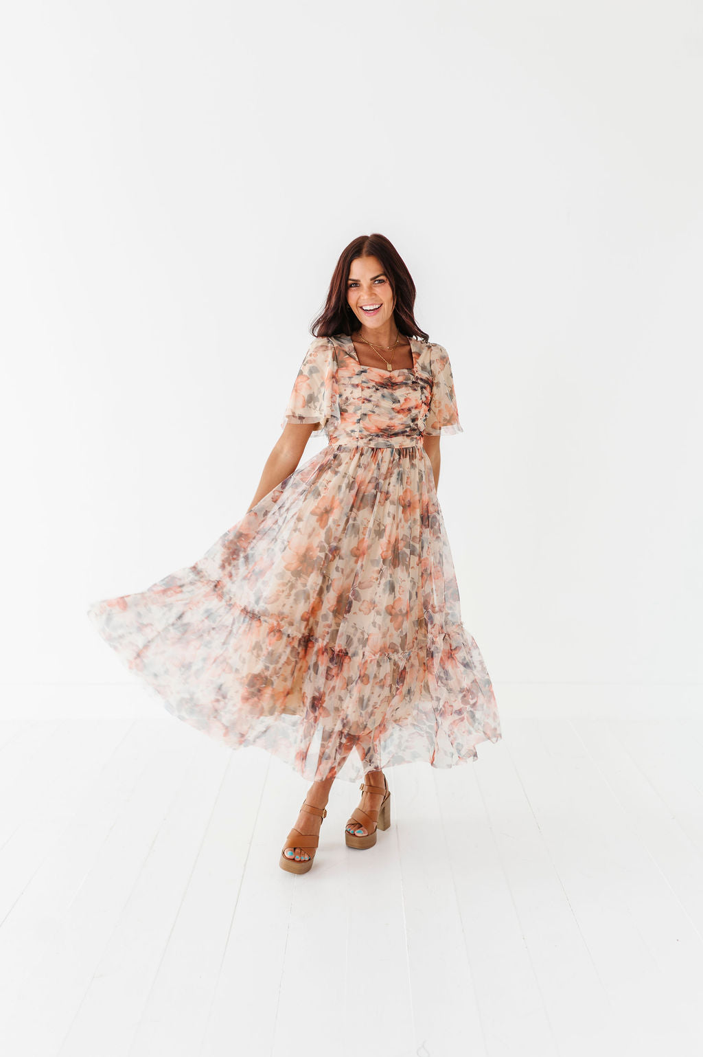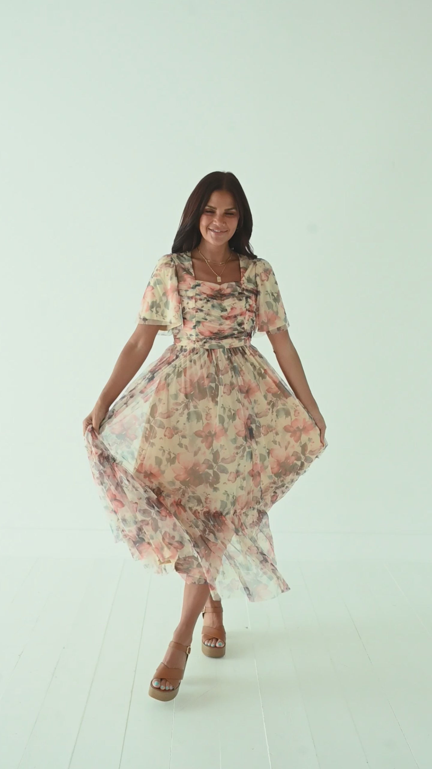 - Tan with multicolored floral mesh overlay