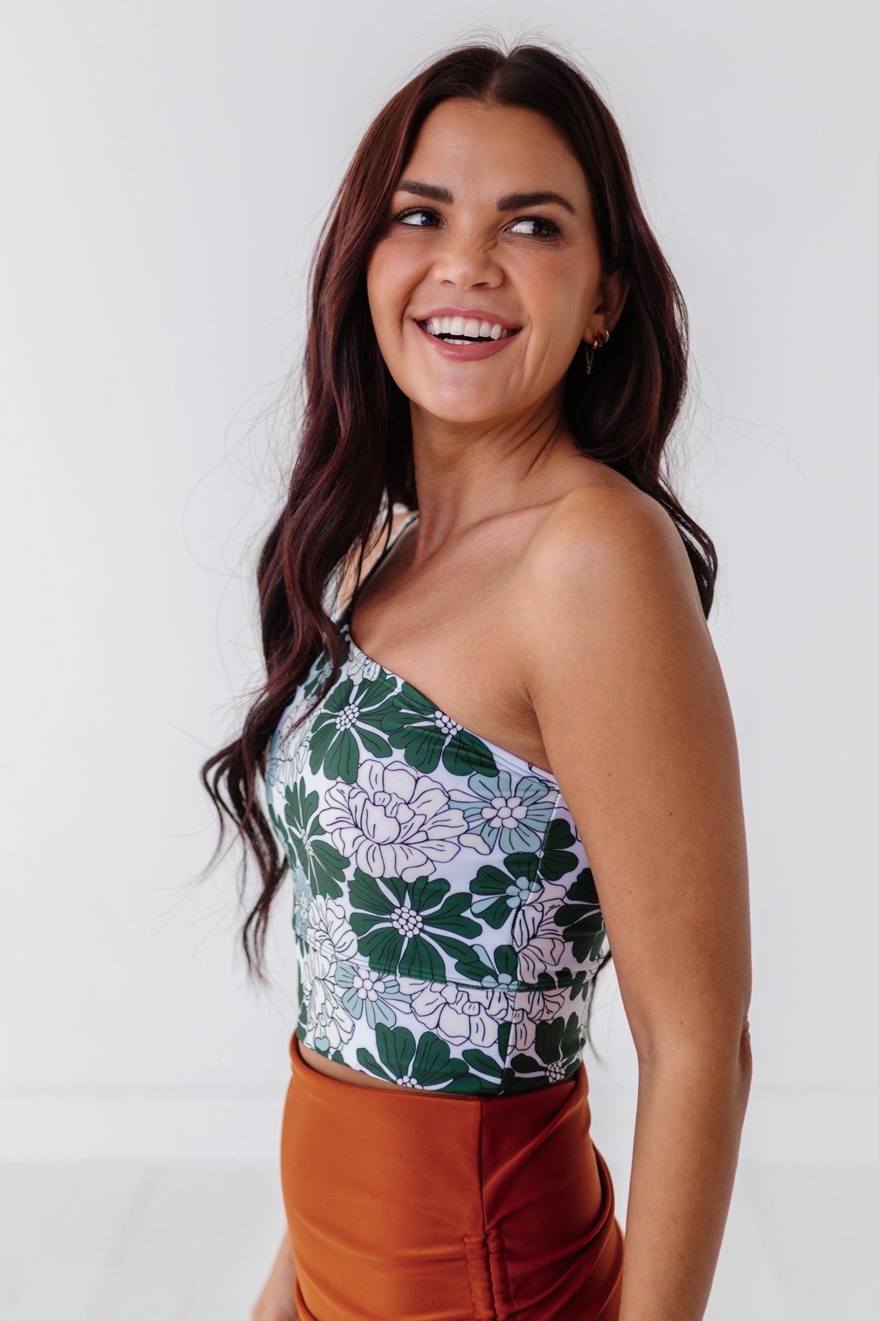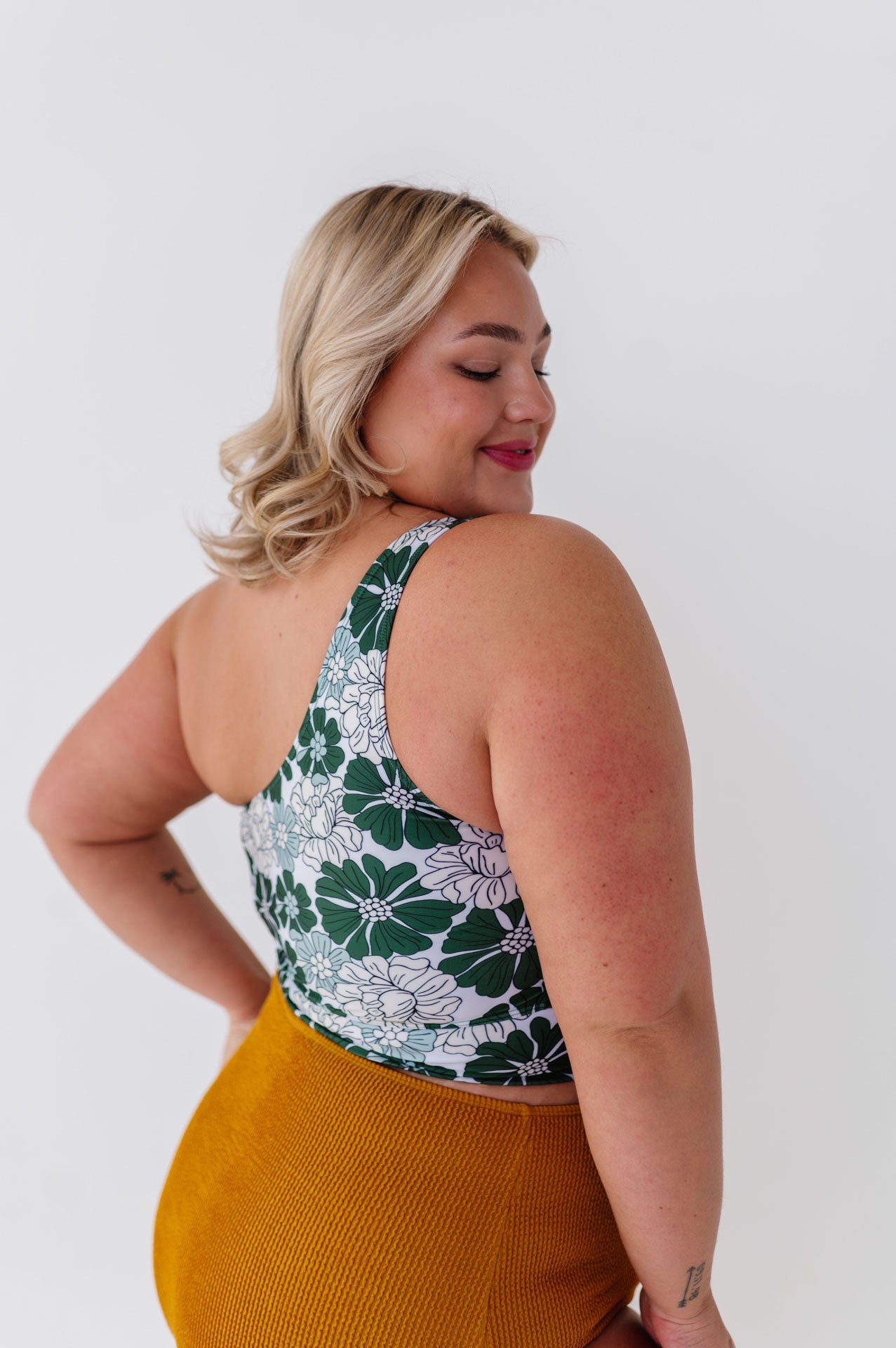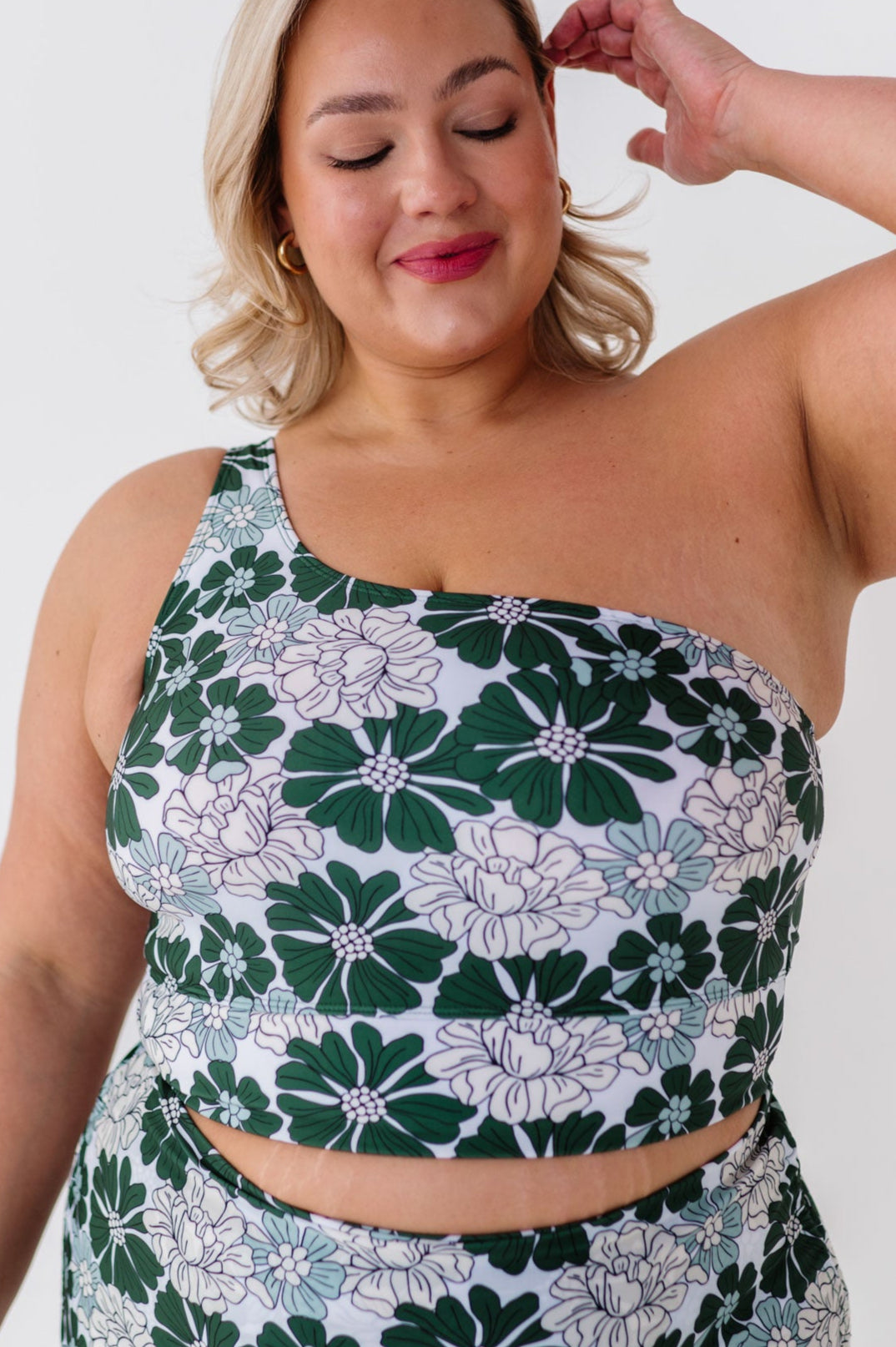• Halle is 5'5", with a bra size of 34C, 31" under bust 34" largest part and is wearing a Small