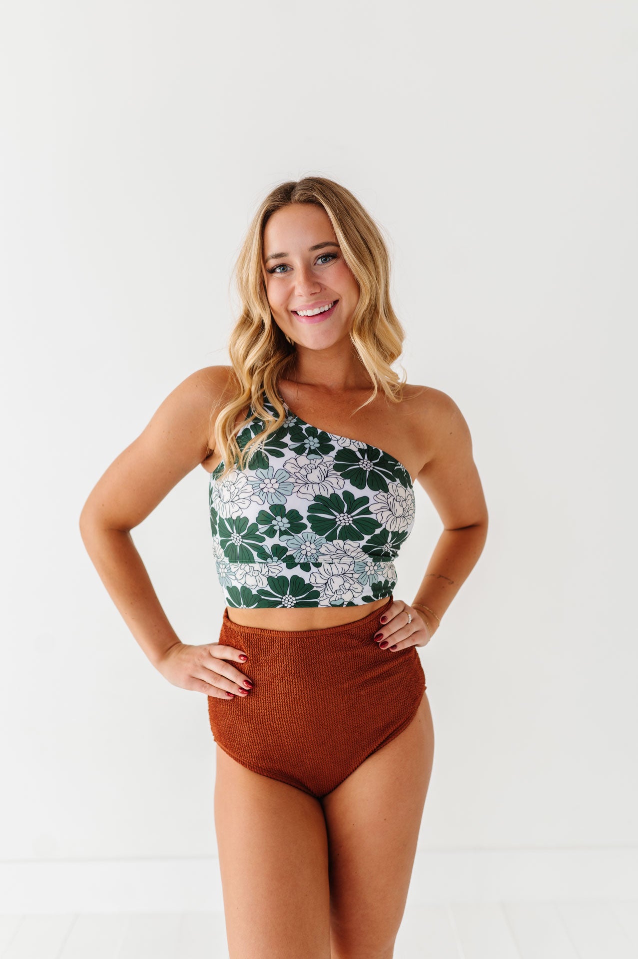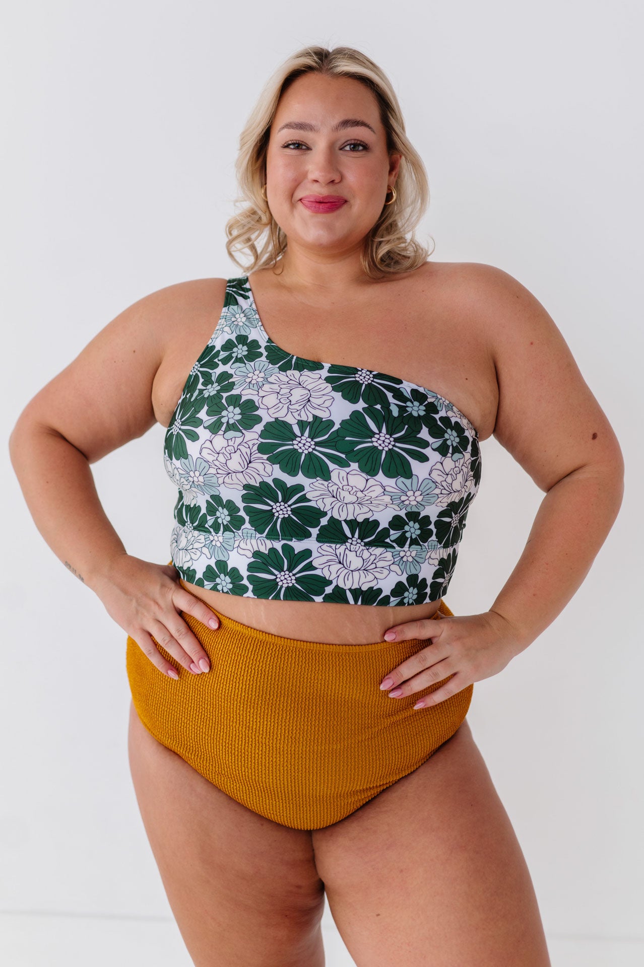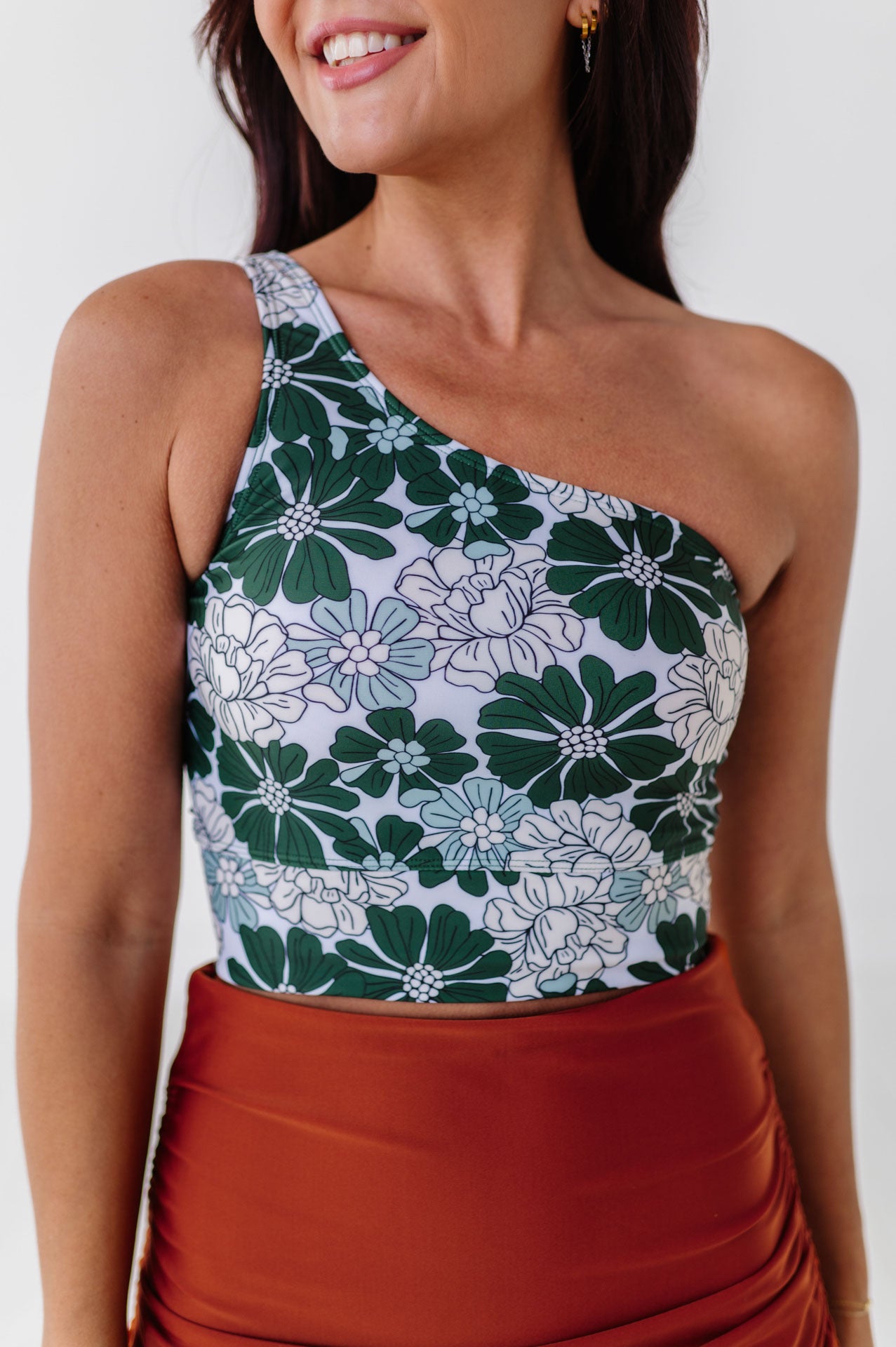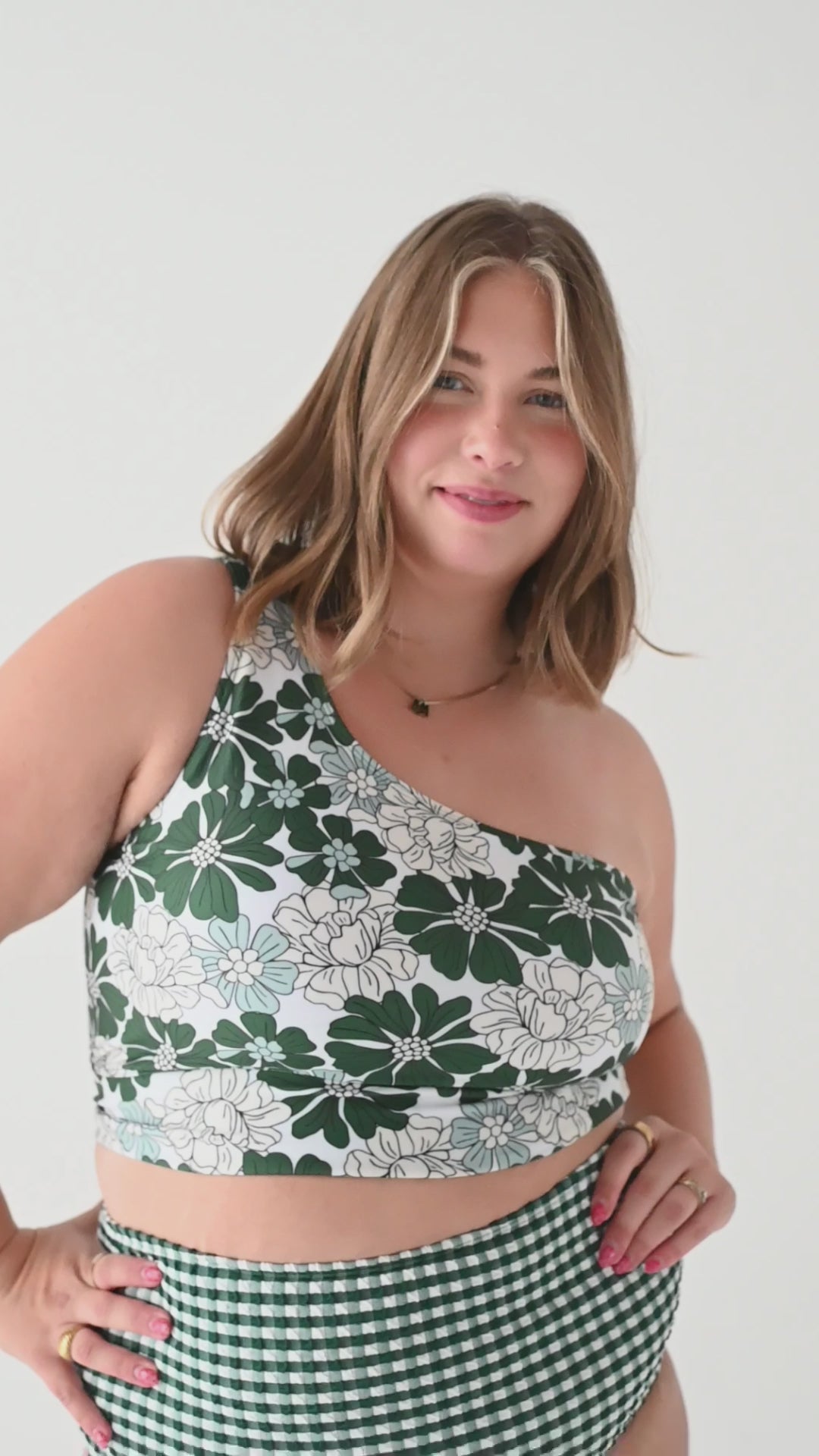 • Halle is 5'5", with a bra size of 34C, 31" under bust 34" largest part and is wearing a Small