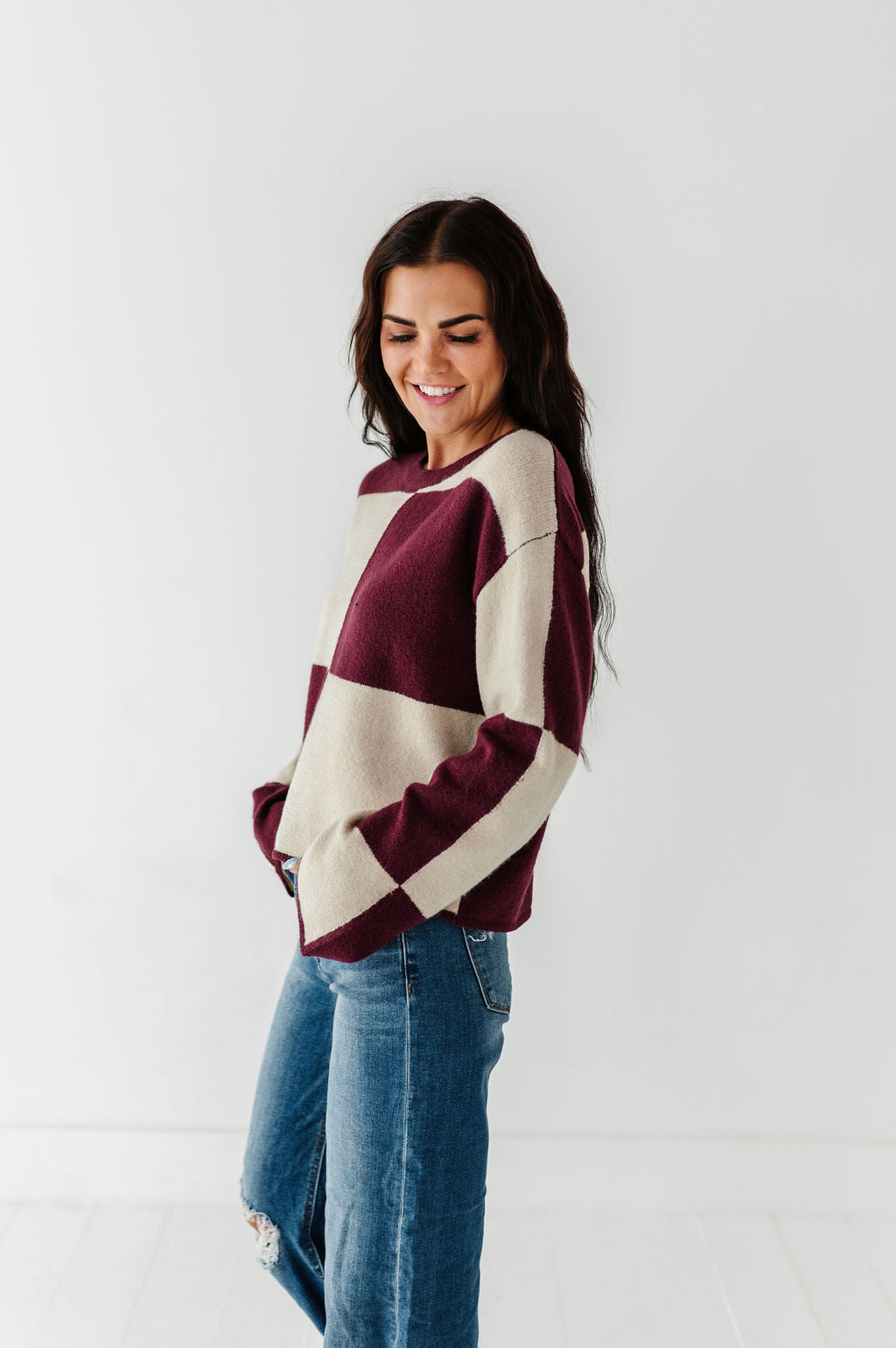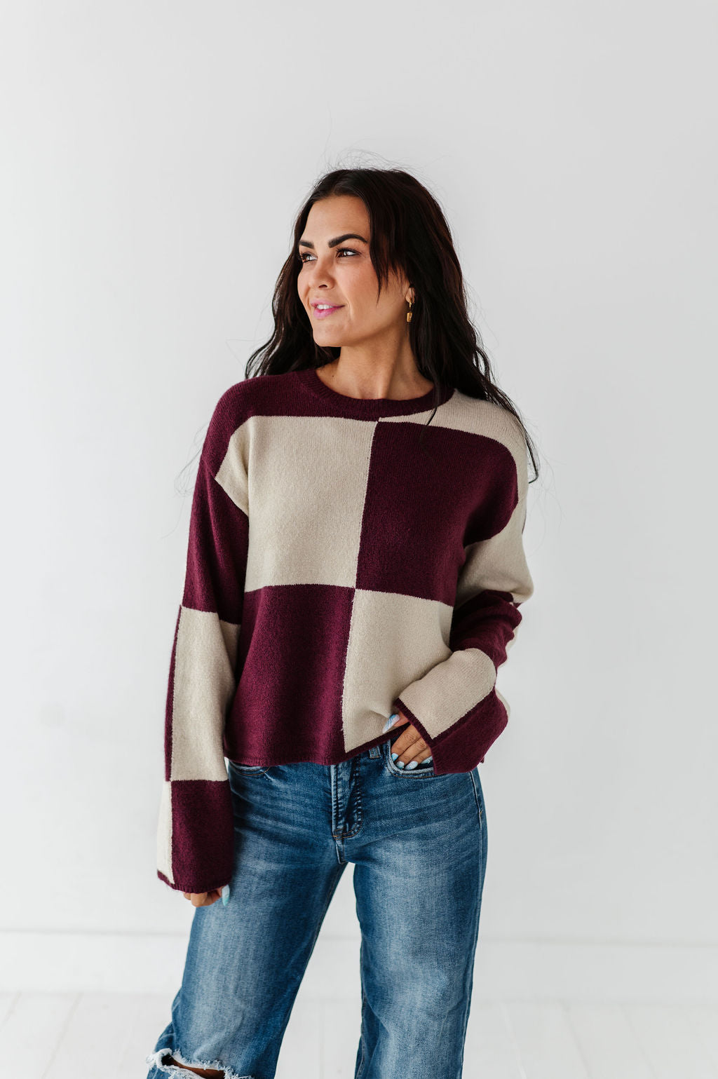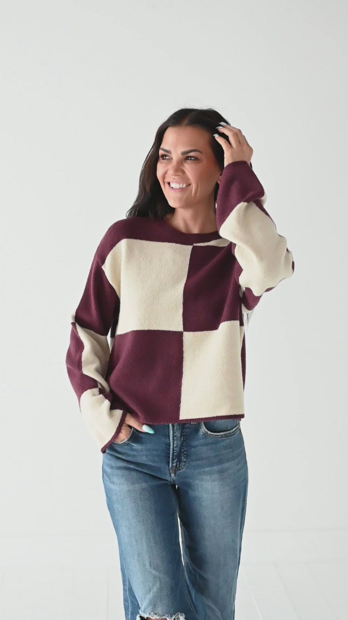 - Cream and dark cherry (purple-red) colorblock checkered print
