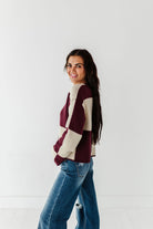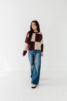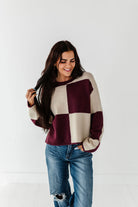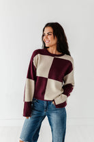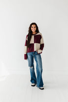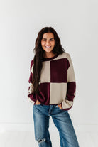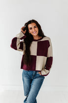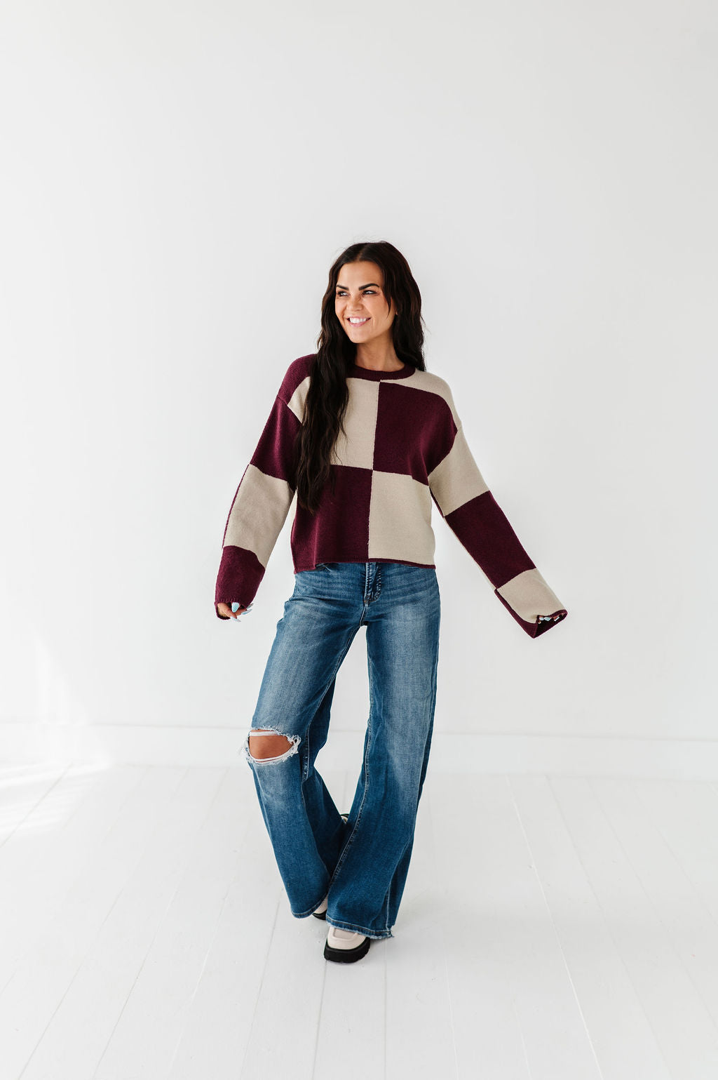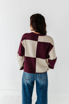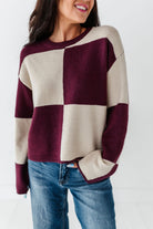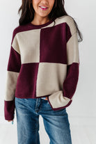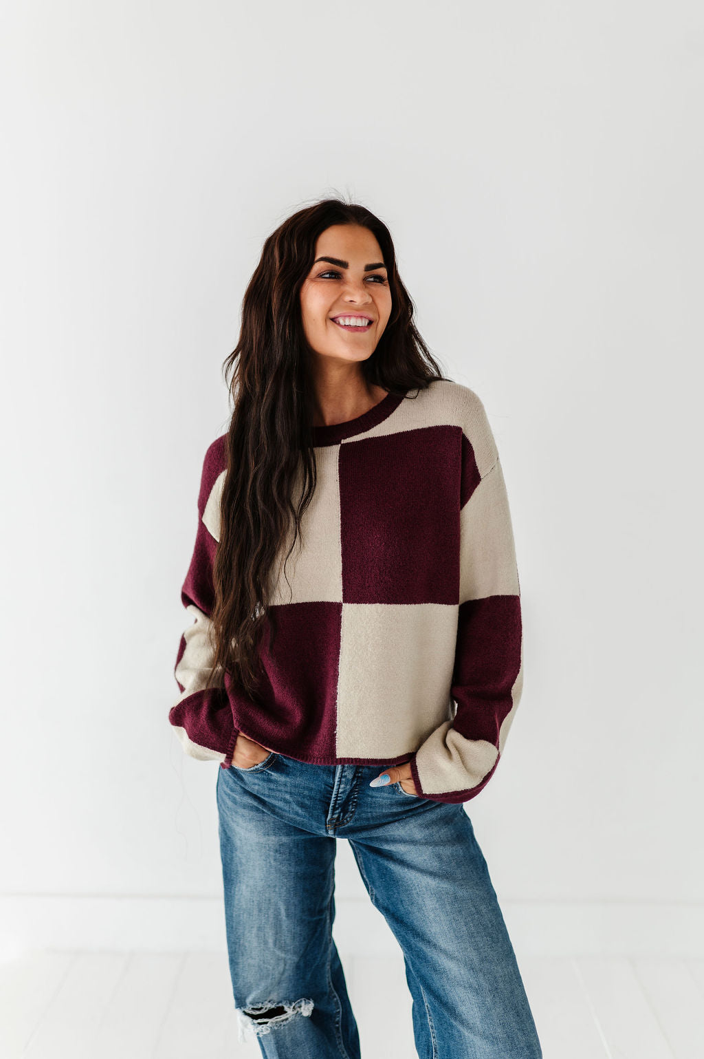 - Cream and dark cherry (purple-red) colorblock checkered print