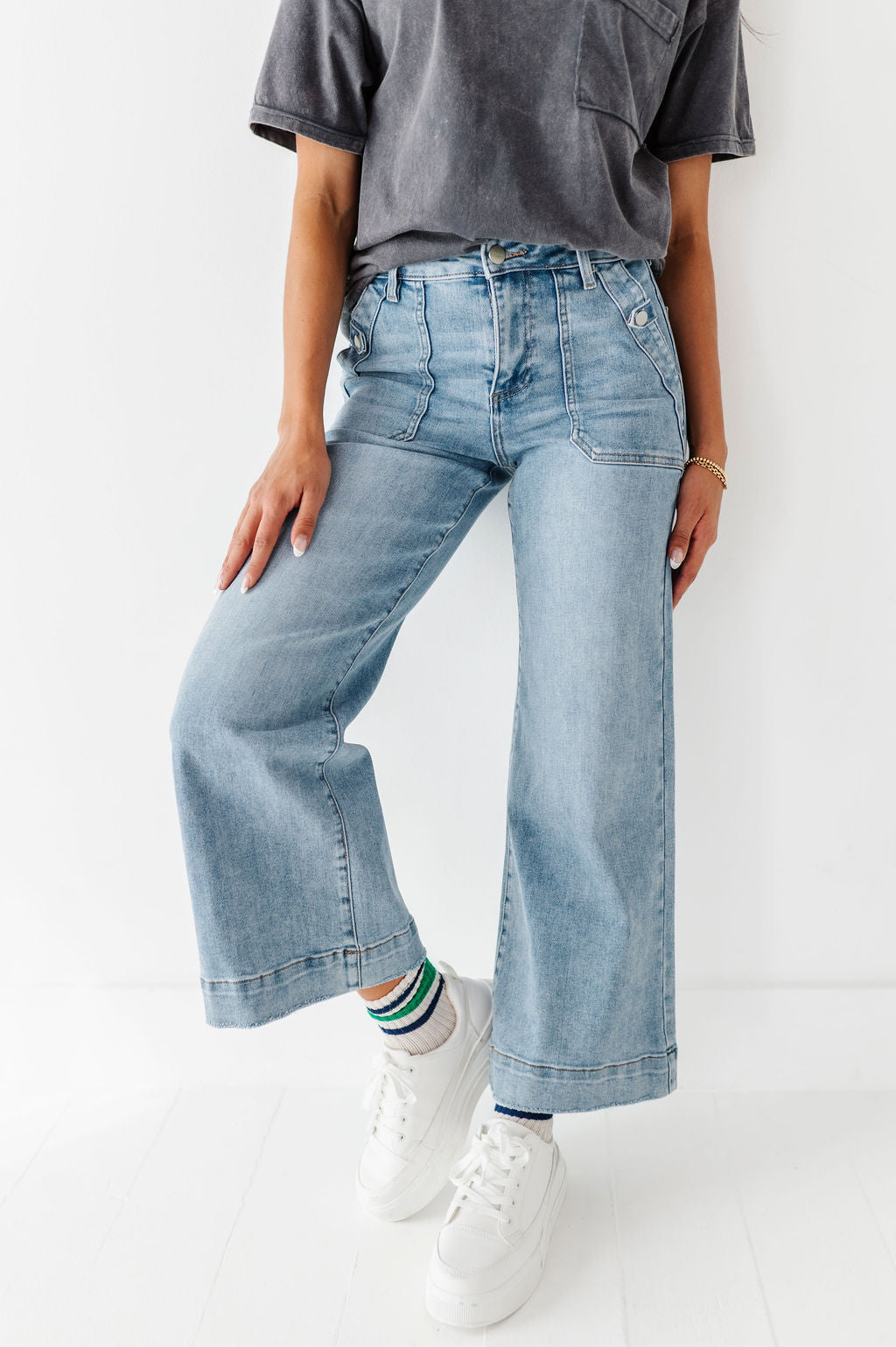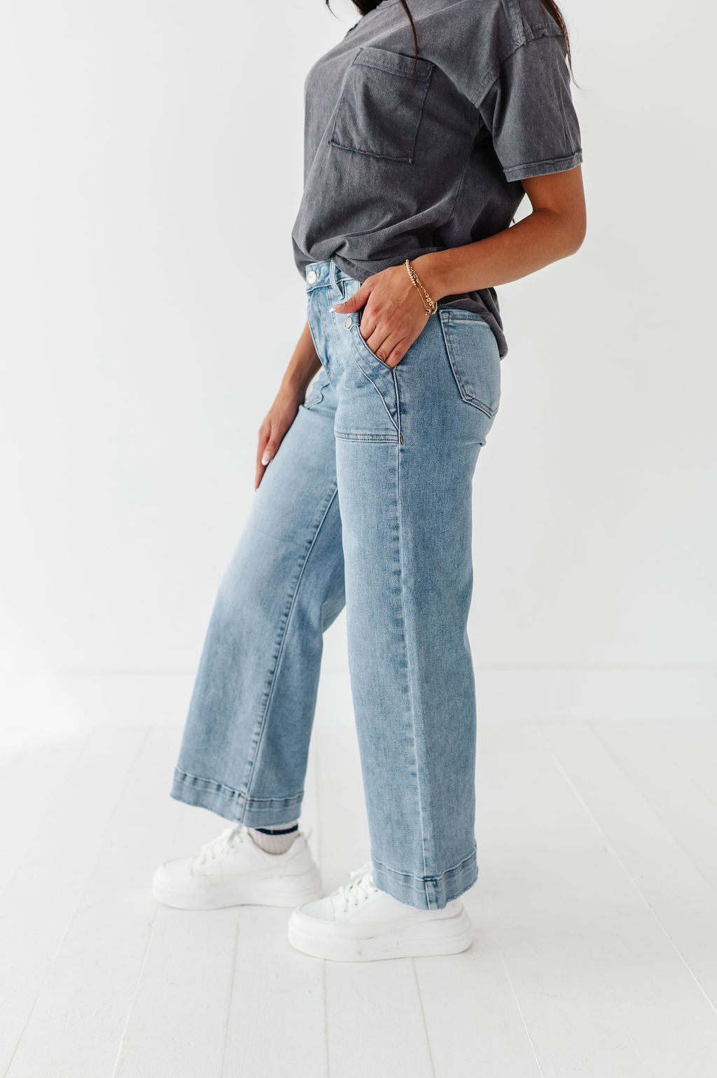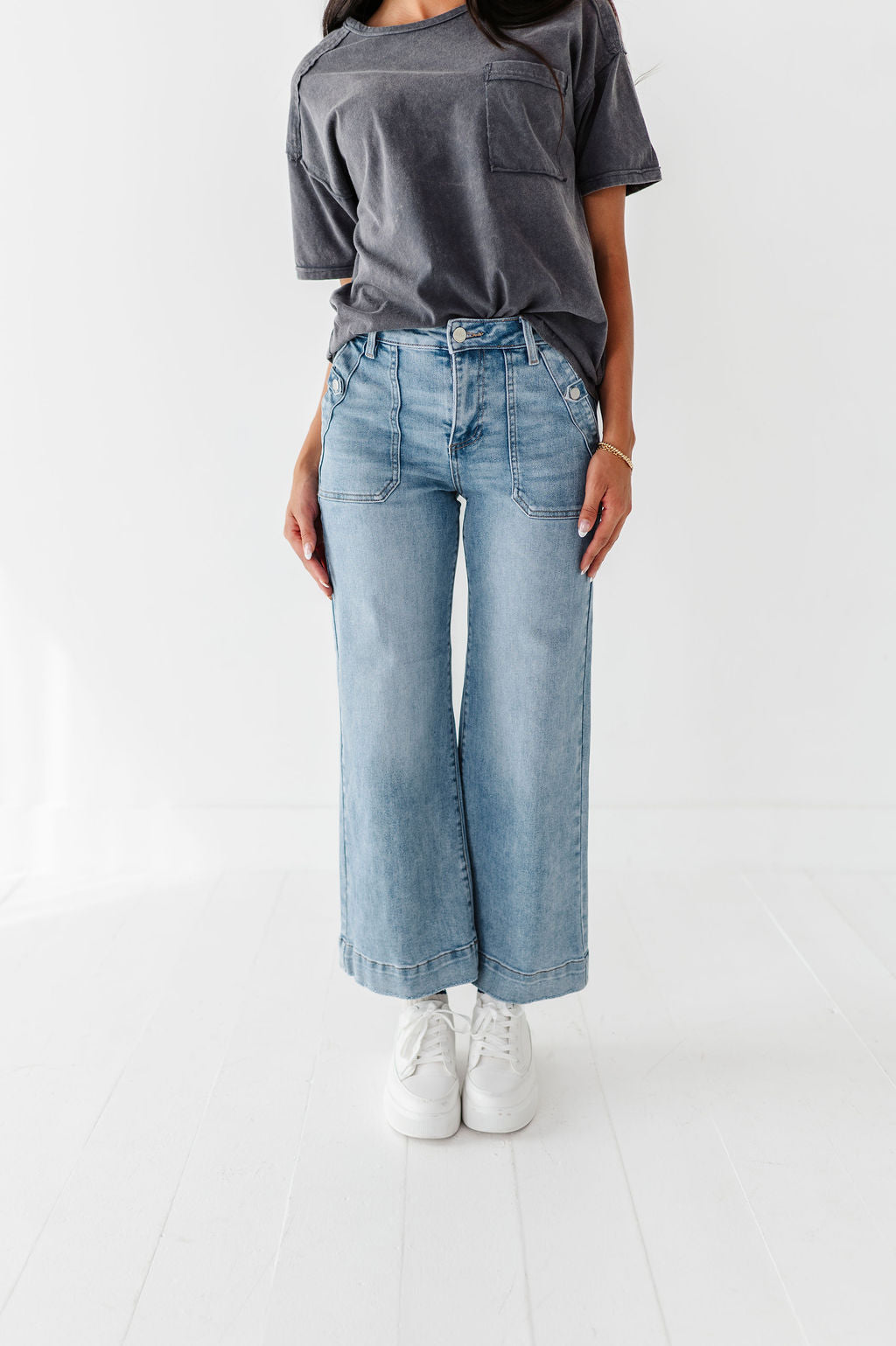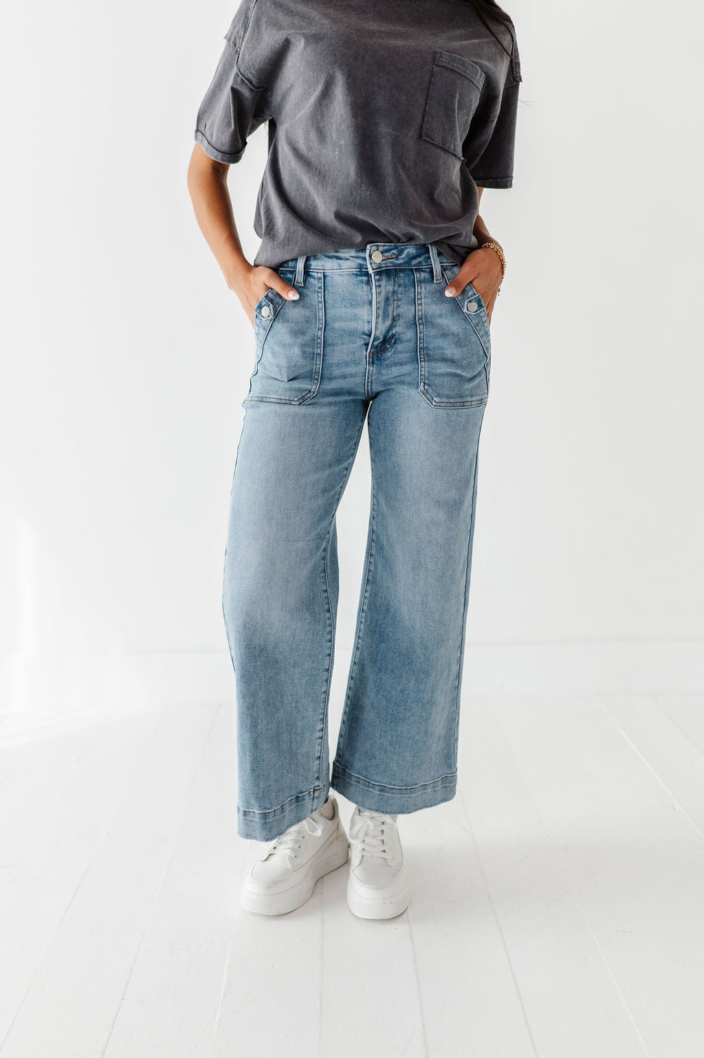 - Deep front pockets with snap button detail