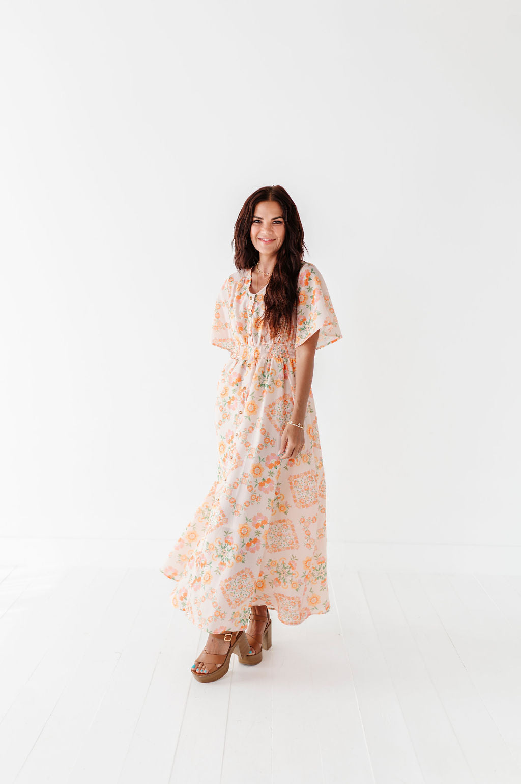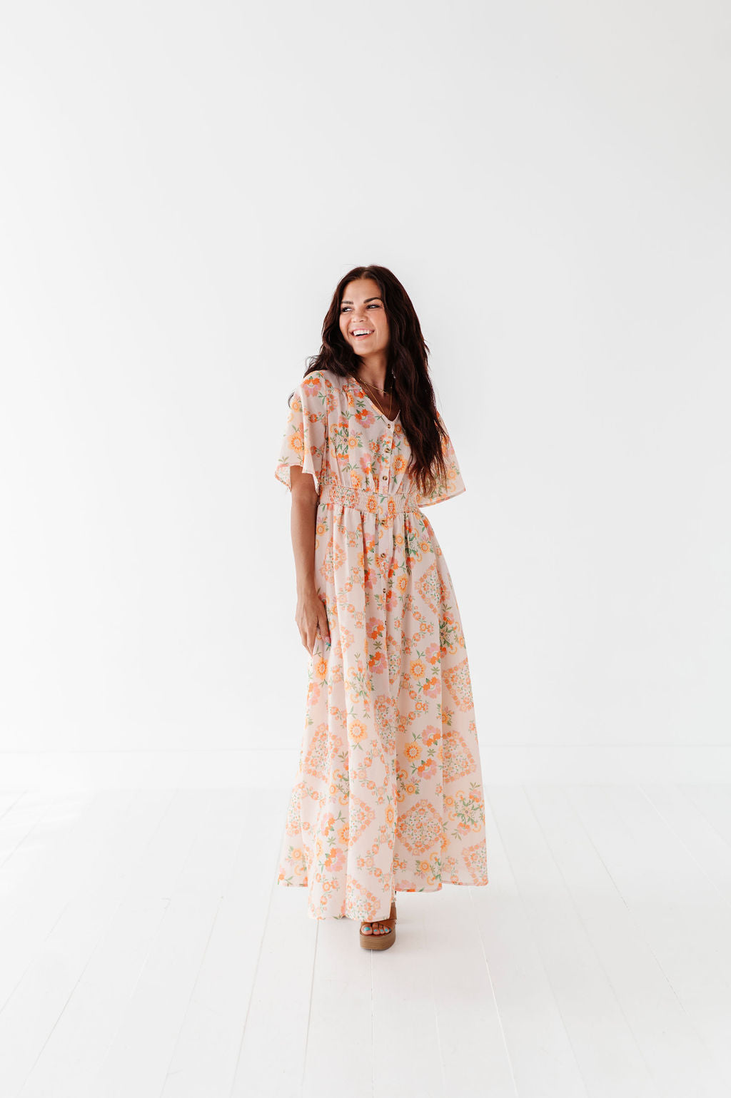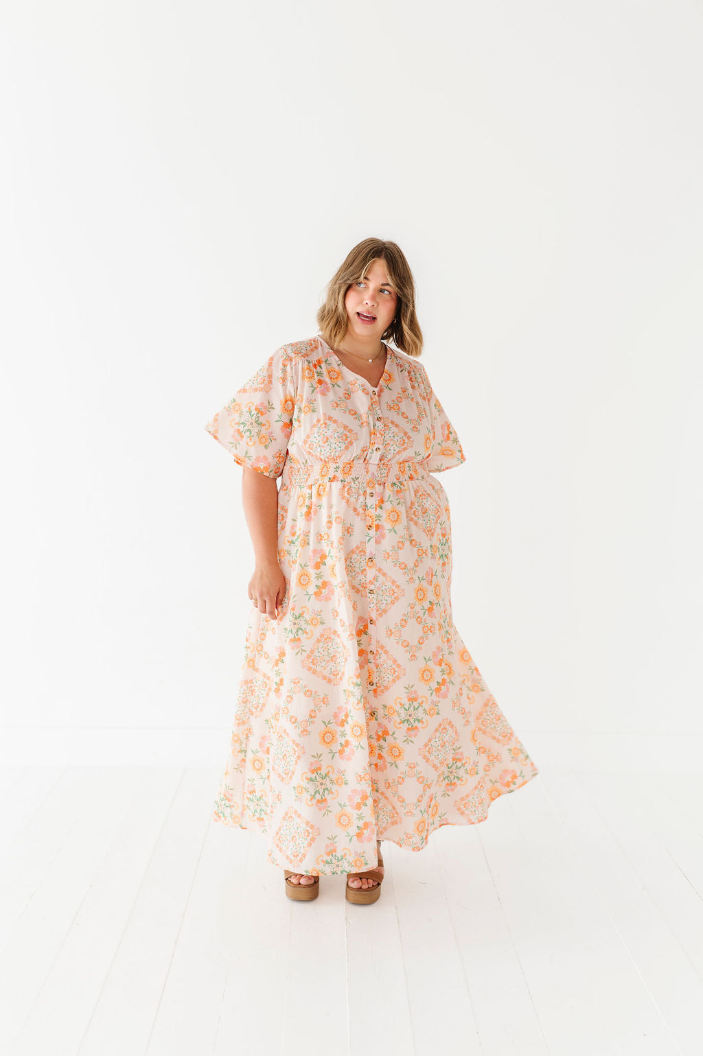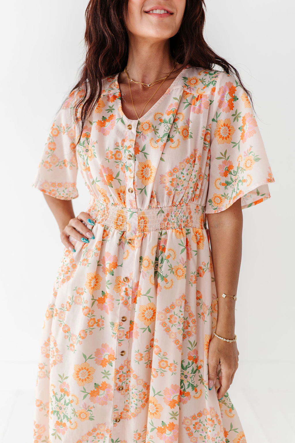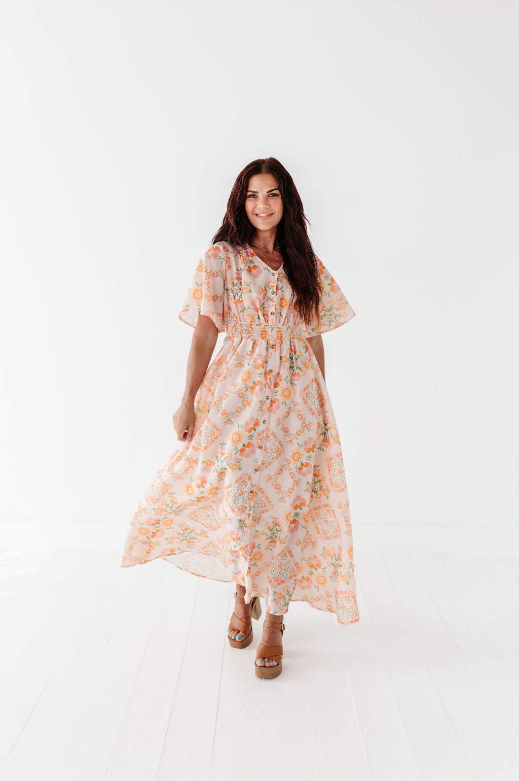 - Lavender, burnt orange, yellow, mauve, white and sage floral print